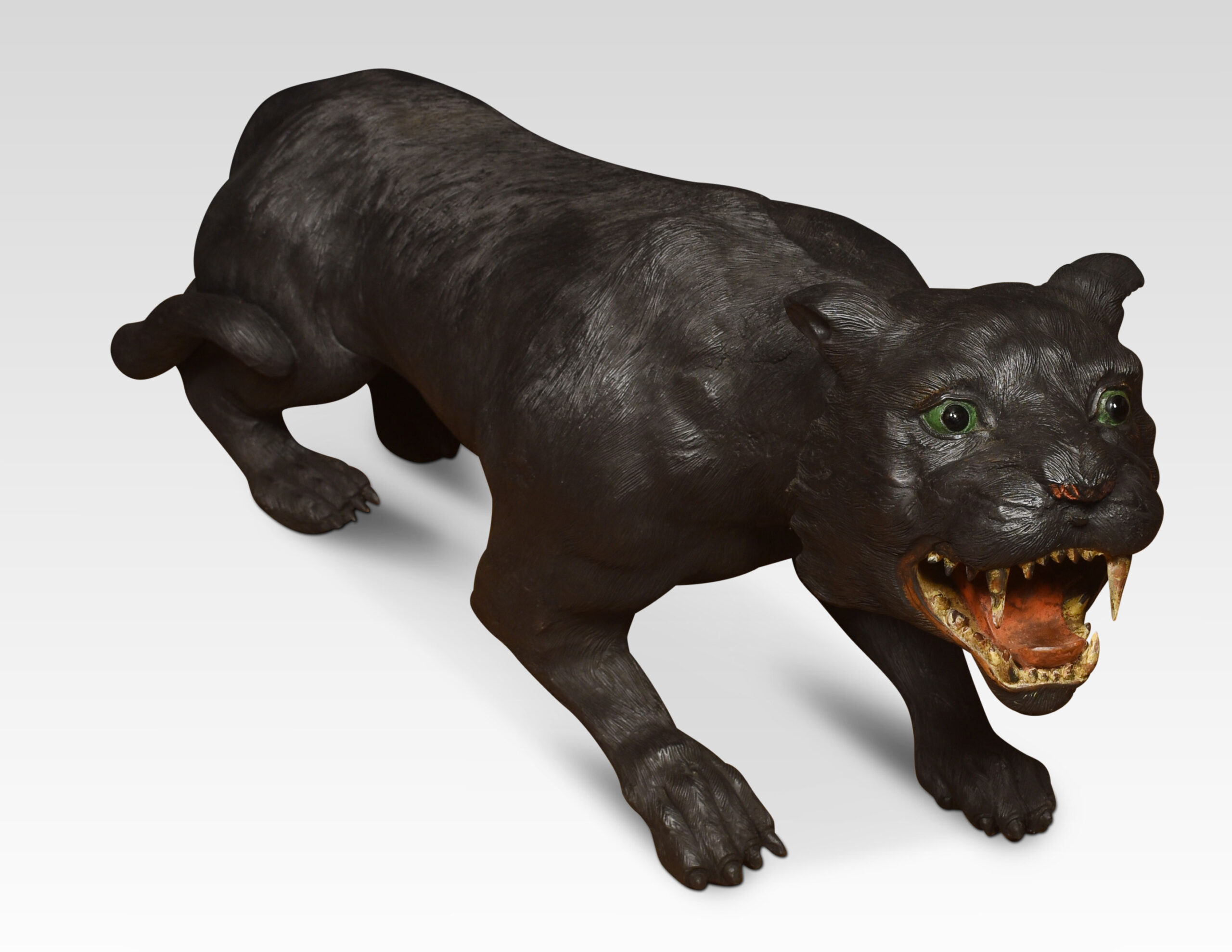 Life-size prowling ebonised carved oak panther.