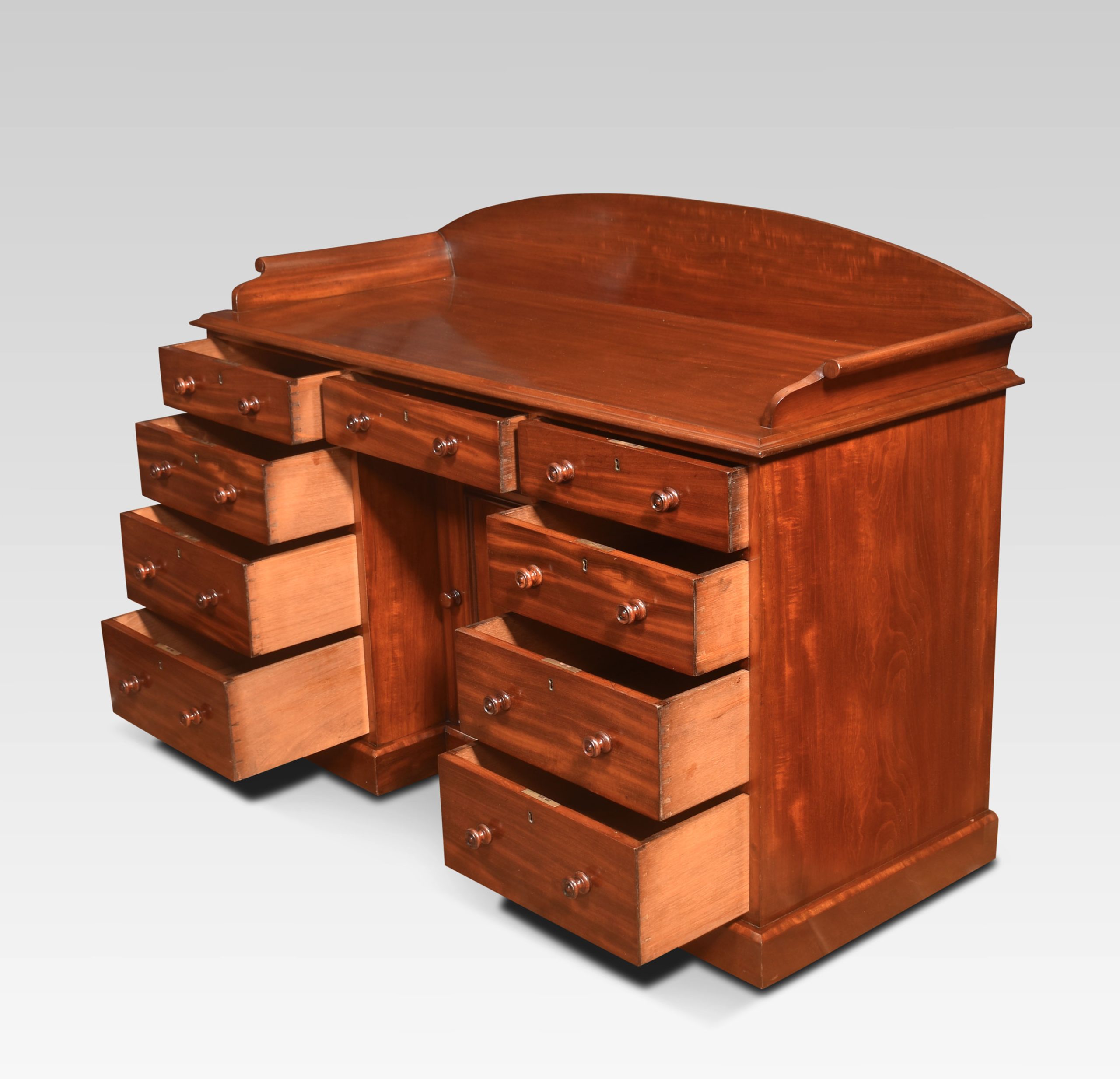 19th-century mahogany dressing table, the rectangular top with raised back and sides over an arrangement of nine graduated drawers, the locks stamped ‘Cope and Collinson’ and a single recessed cupboard to the centre kneehole. All raised up on a plinth base on castors.