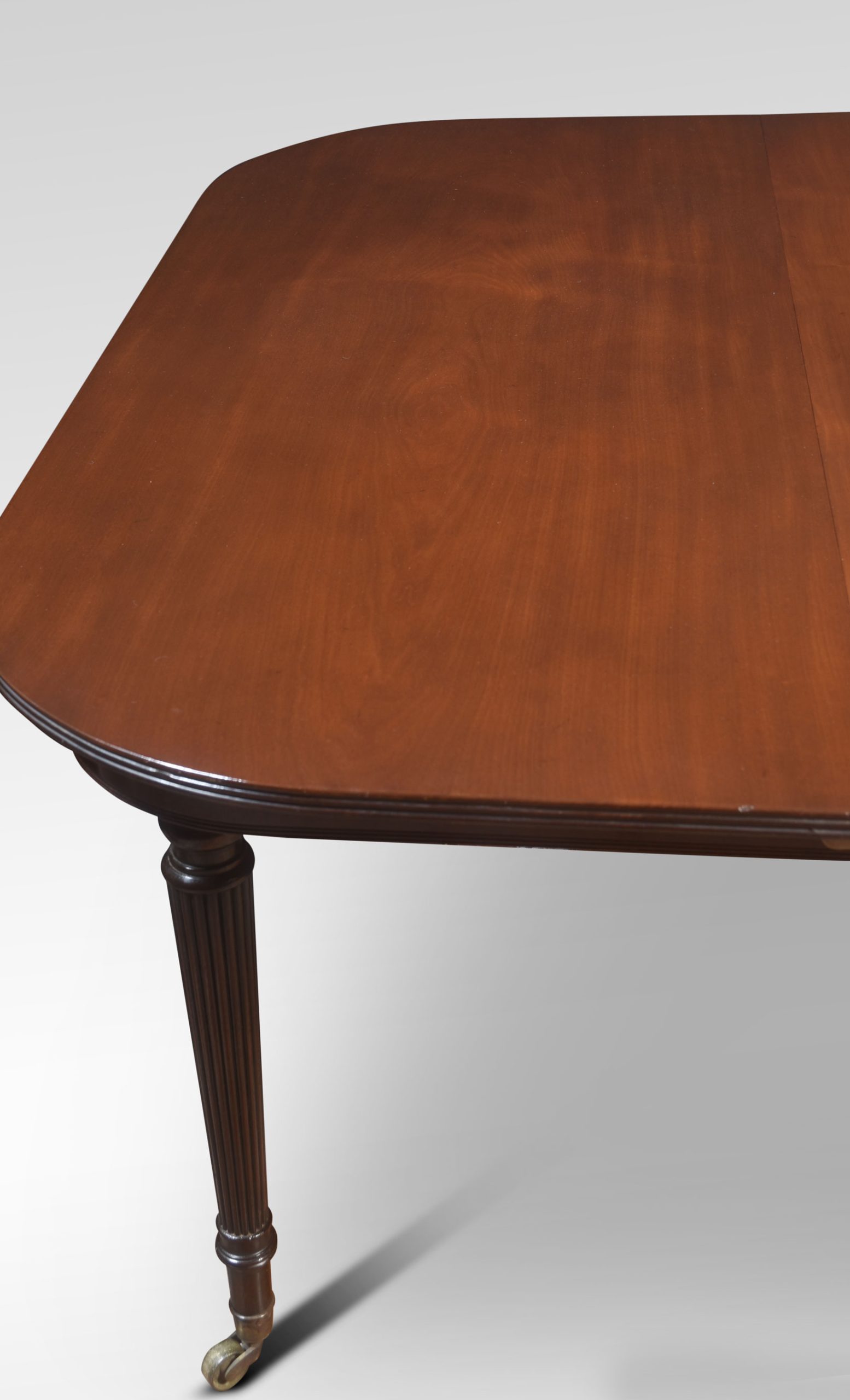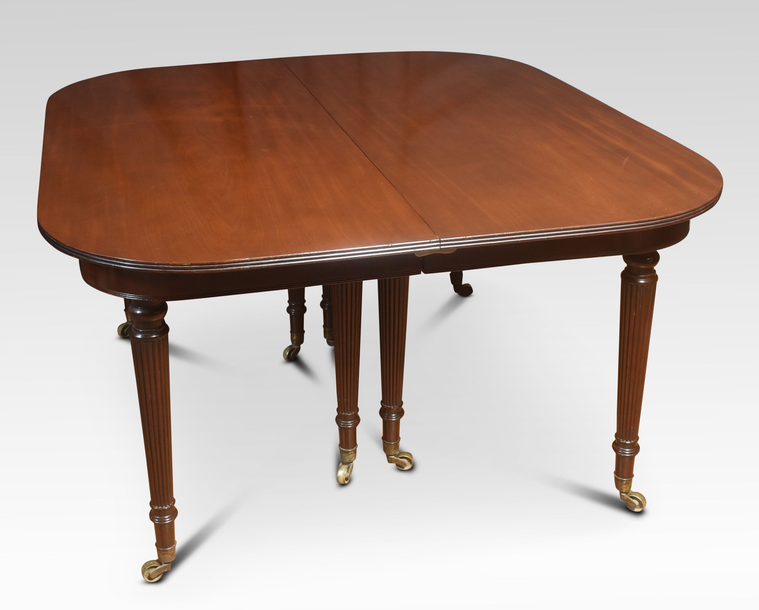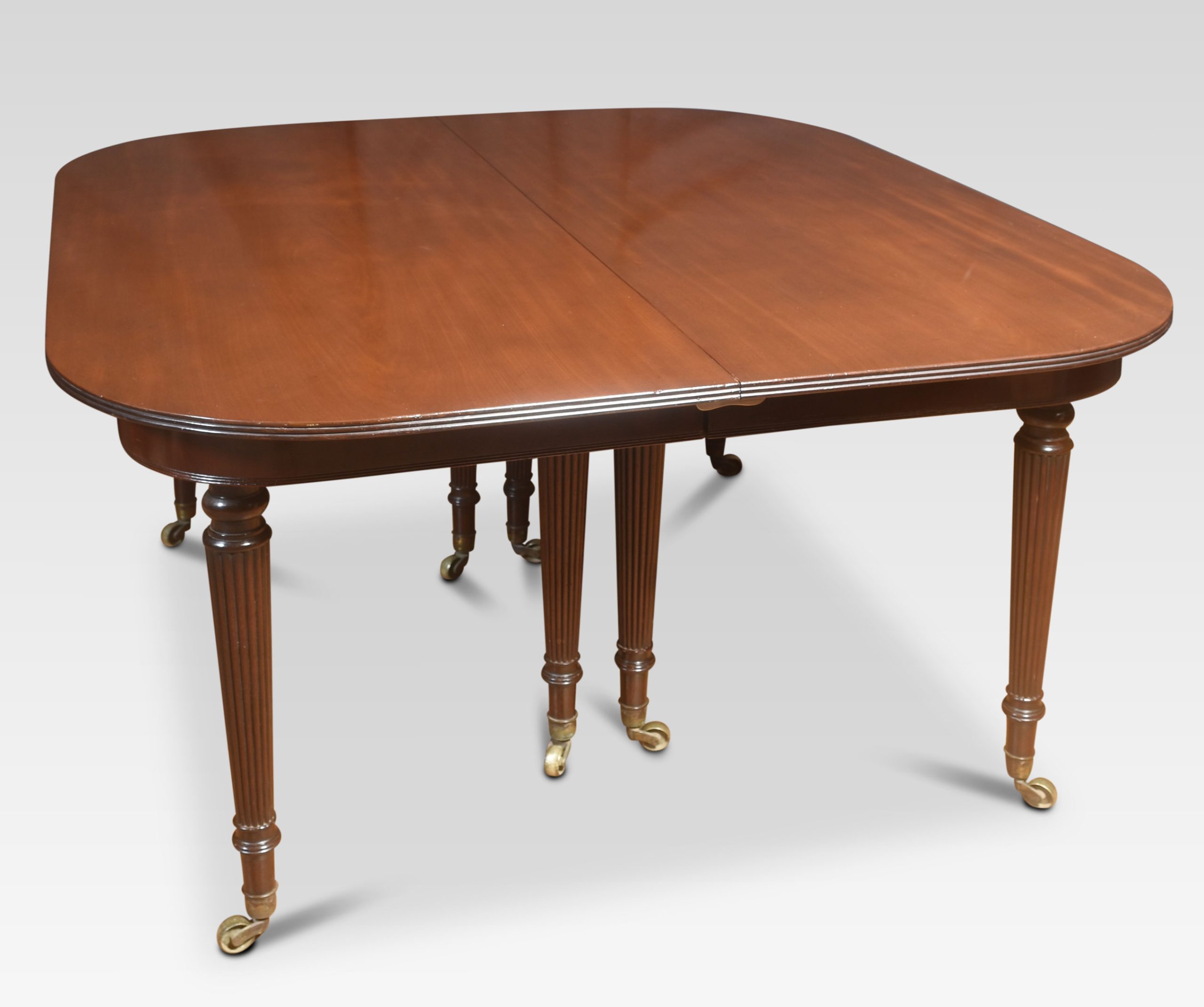 Early 19th Century Mahogany Extending Dining Table, in the manner of Gillows, The large well figured mahogany top having shaped ends opening to incorporate four original additional leaves. The telescopic sliding frame on fine-turned and reeded tapering legs with brass-capped toes and castors. This table will seat 12-14 People.