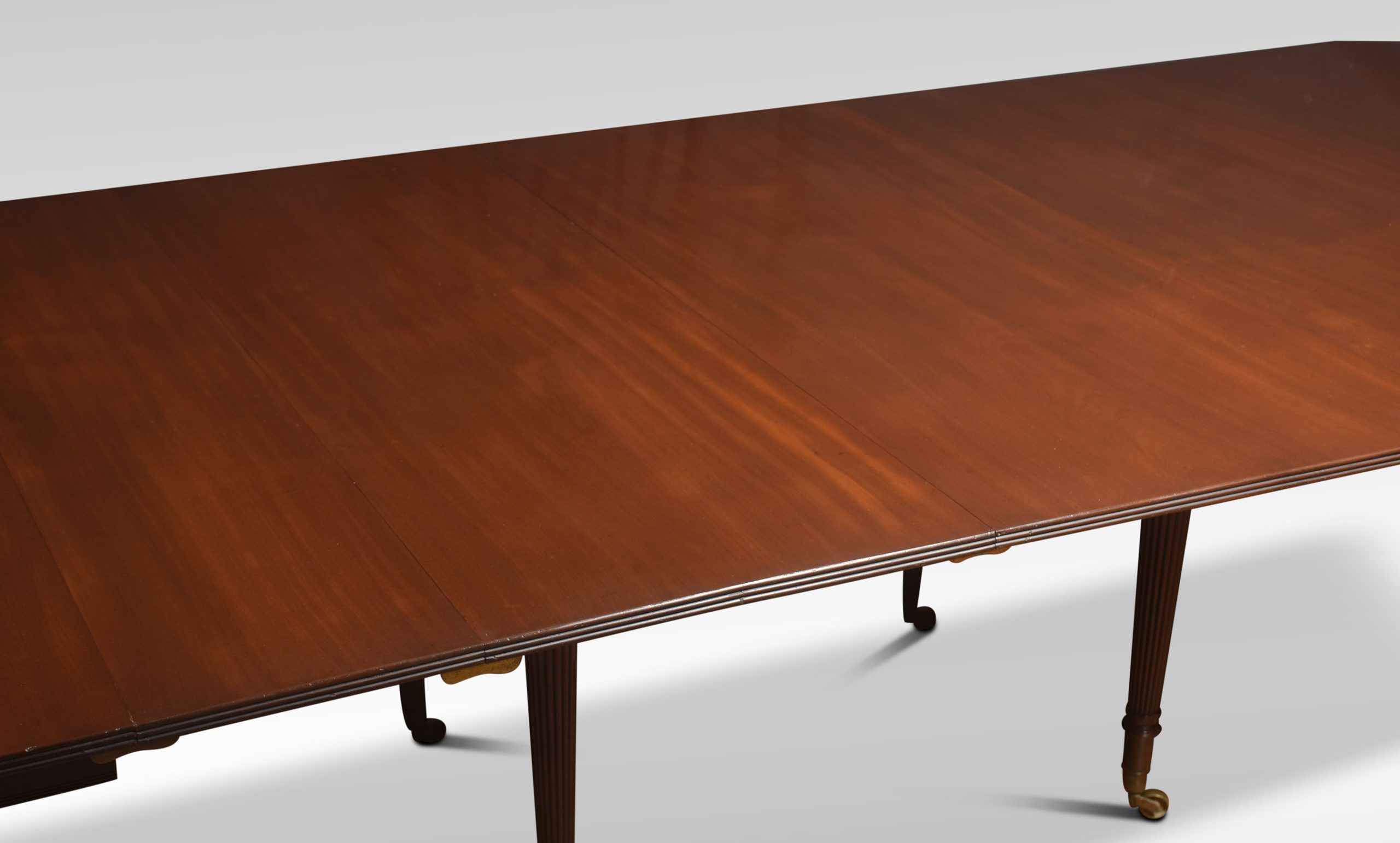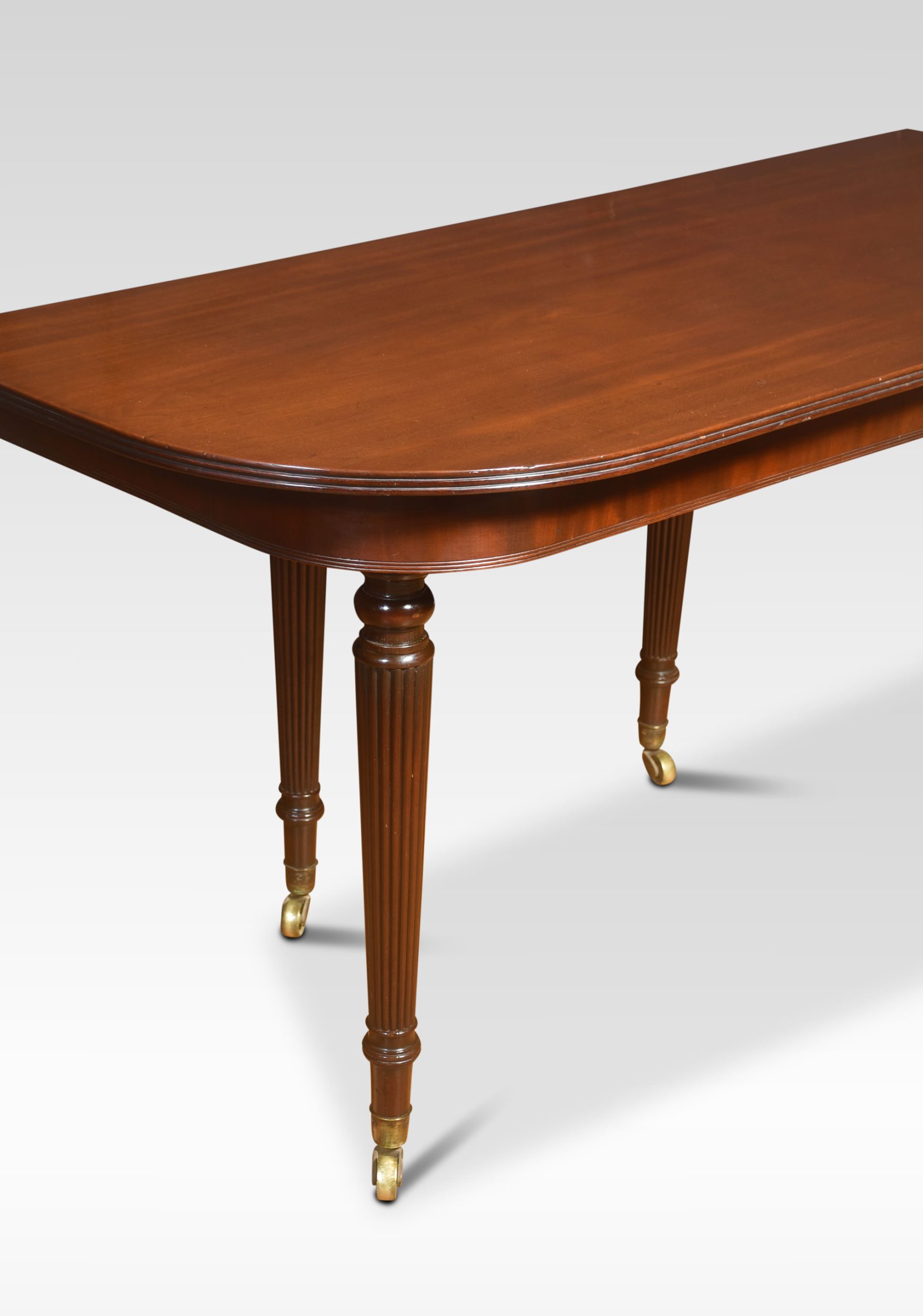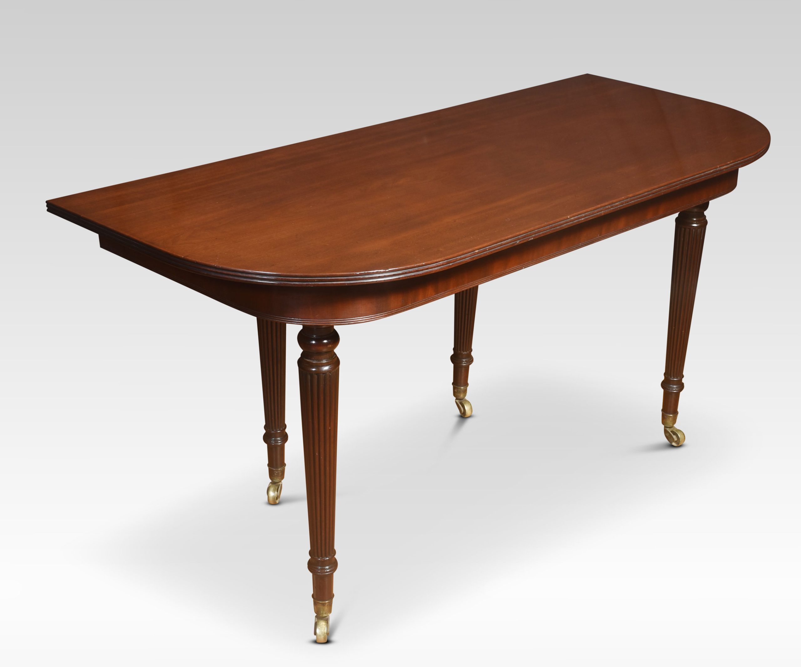 Early 19th Century Mahogany Extending Dining Table, in the manner of Gillows, The large well figured mahogany top having shaped ends opening to incorporate four original additional leaves. The telescopic sliding frame on fine-turned and reeded tapering legs with brass-capped toes and castors. This table will seat 12-14 People.