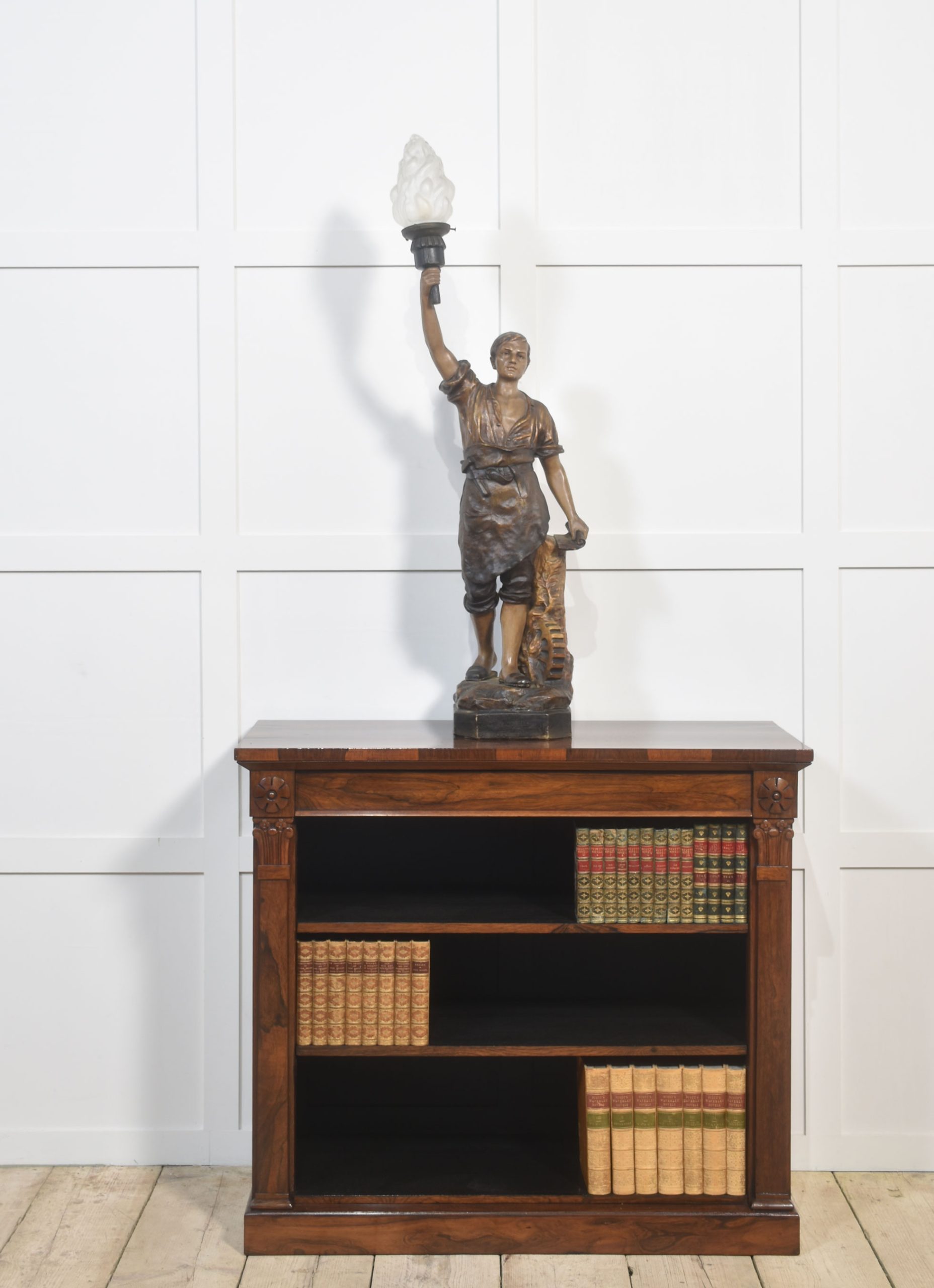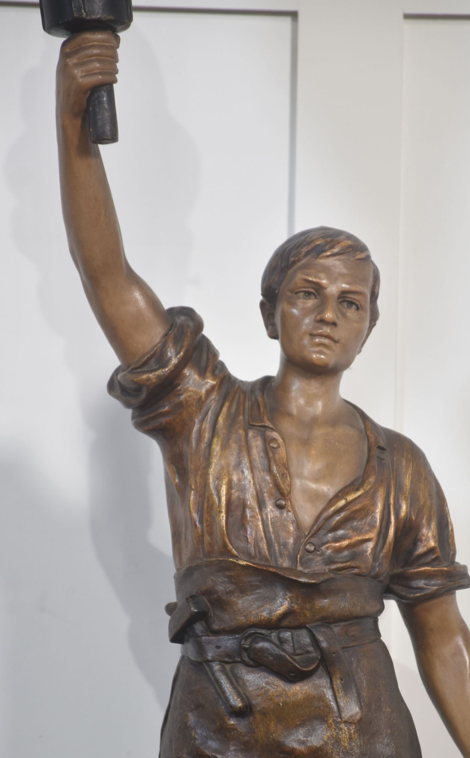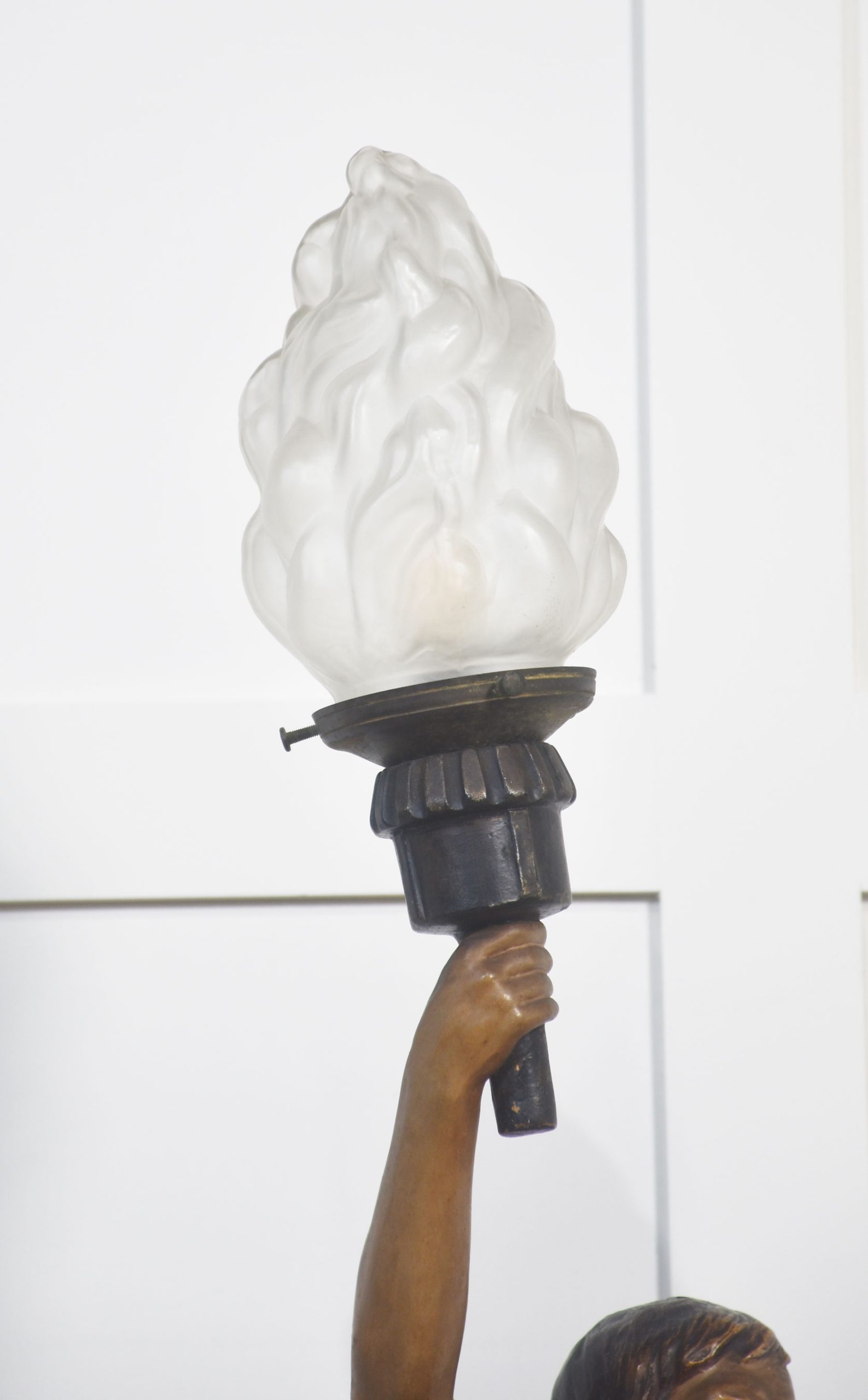 Austrian painted terracotta figural table lamp in the manner of Goldscheider, modelled as an artisan holding a torch aloft in his right hand signed Aug Ollo, fitted with frosted glass flame shade. The lamp has been rewired and tested.