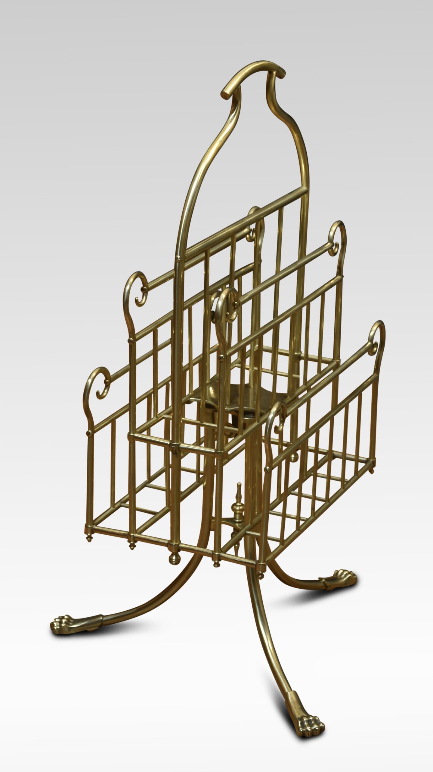 Brass music / magazine rack with scrolled and railed divisions, on three out splayed supports termanating in paw feet.