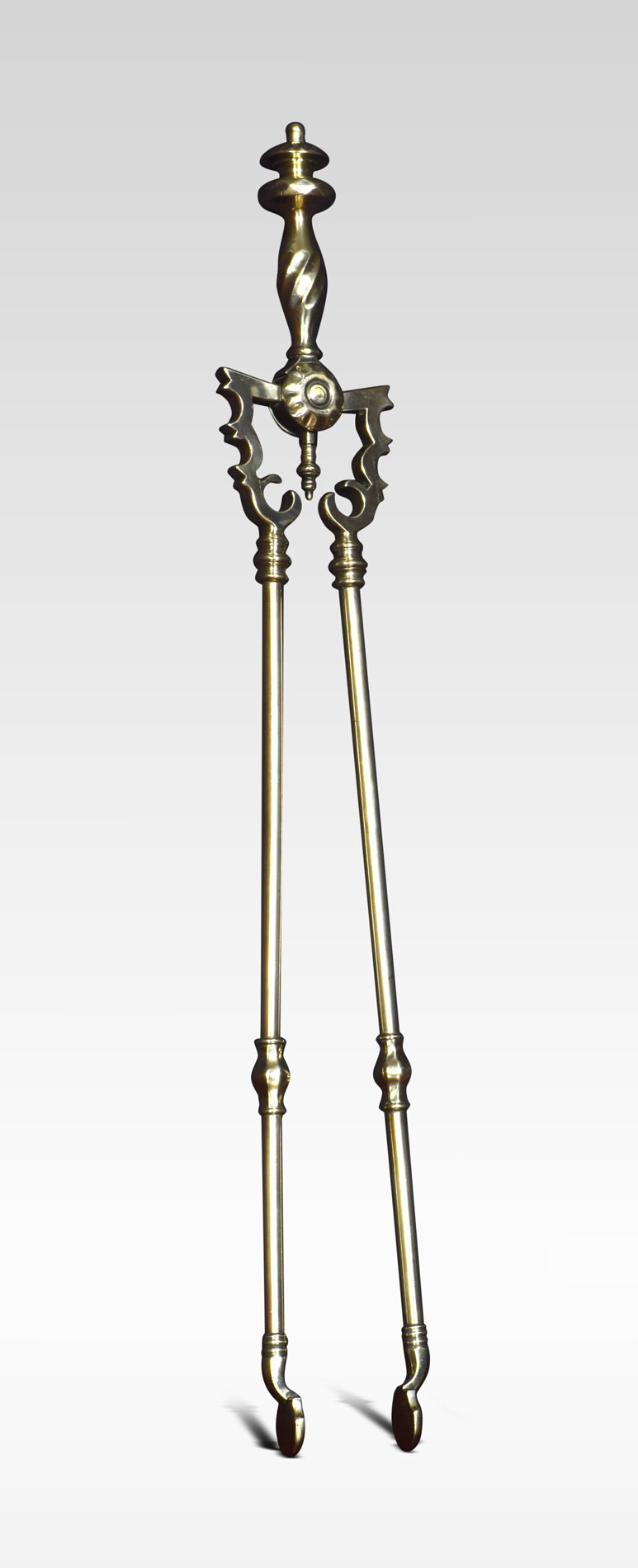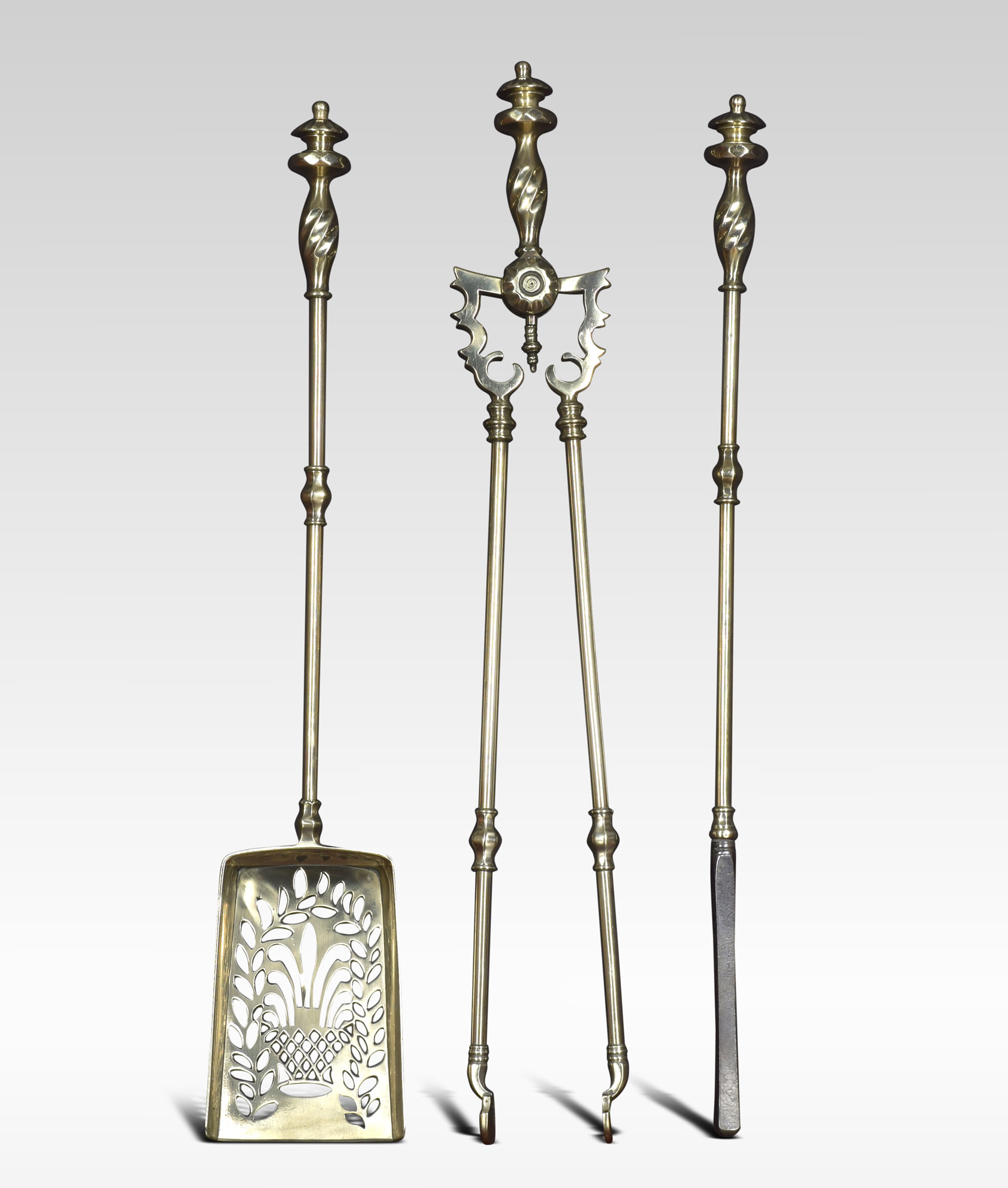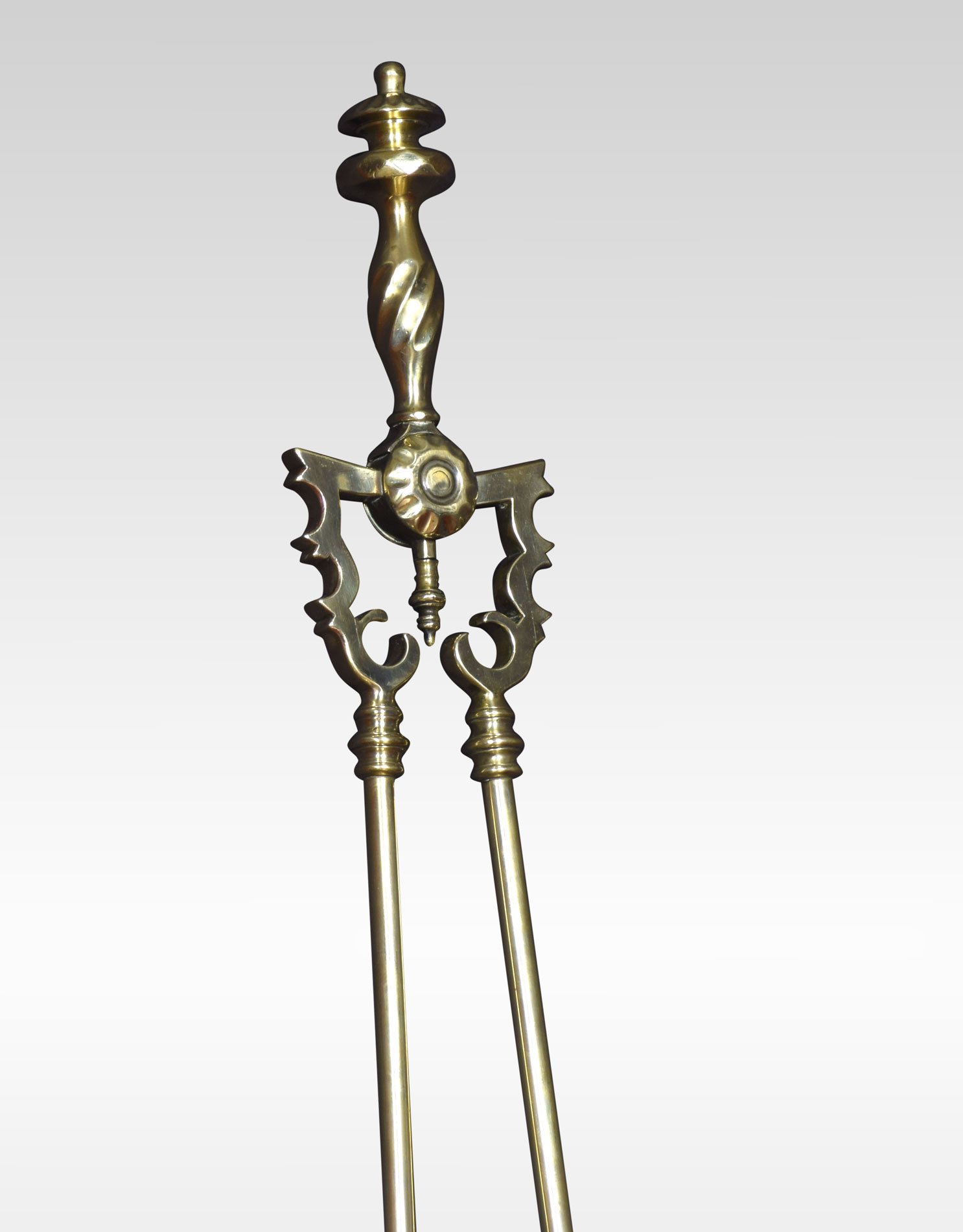 Set of three brass fire tools, consisting of poker, tongs and shovel with well-casted handles.