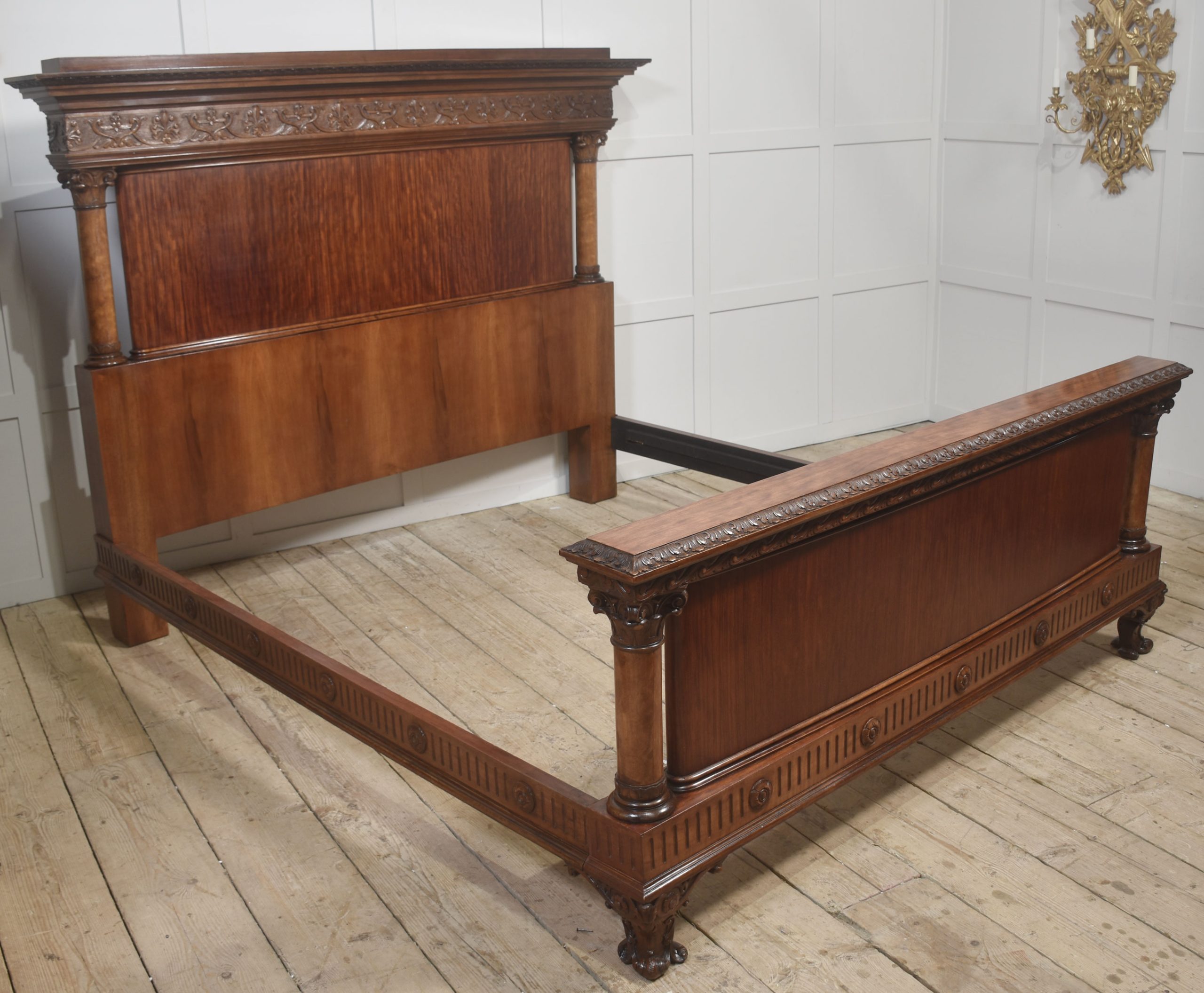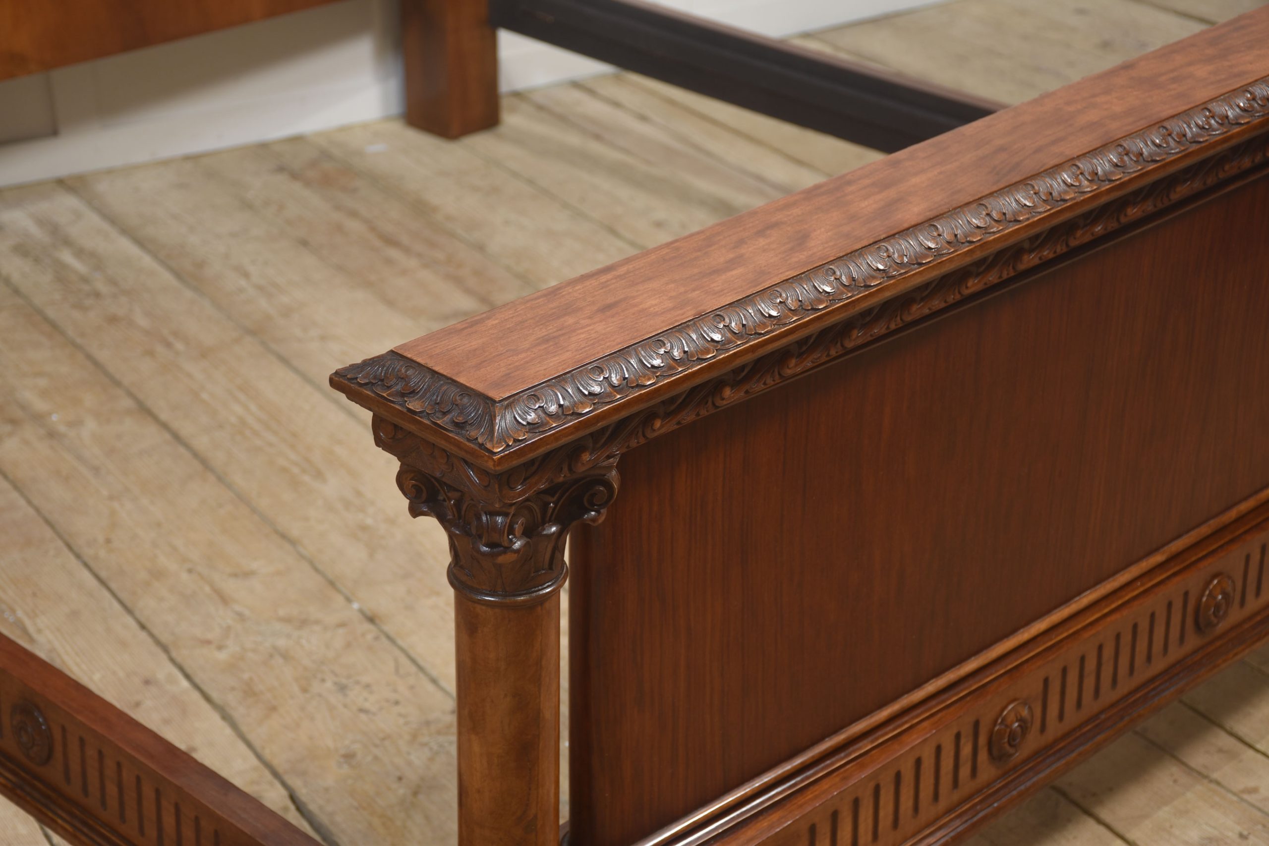 This distinguished antique mahogany bedframe exemplifies fine craftsmanship and classical architectural design. The impressive headboard features richly grained, book-matched mahogany panels framed by hand-carved floriate and scroll motifs, supported by elegant turned columns with Corinthian-style capitals. The footboard mirrors these refined details, showcasing carved trim, fluted accents, and rosette embellishments, all set atop intricately carved feet for a cohesive and commanding presence.