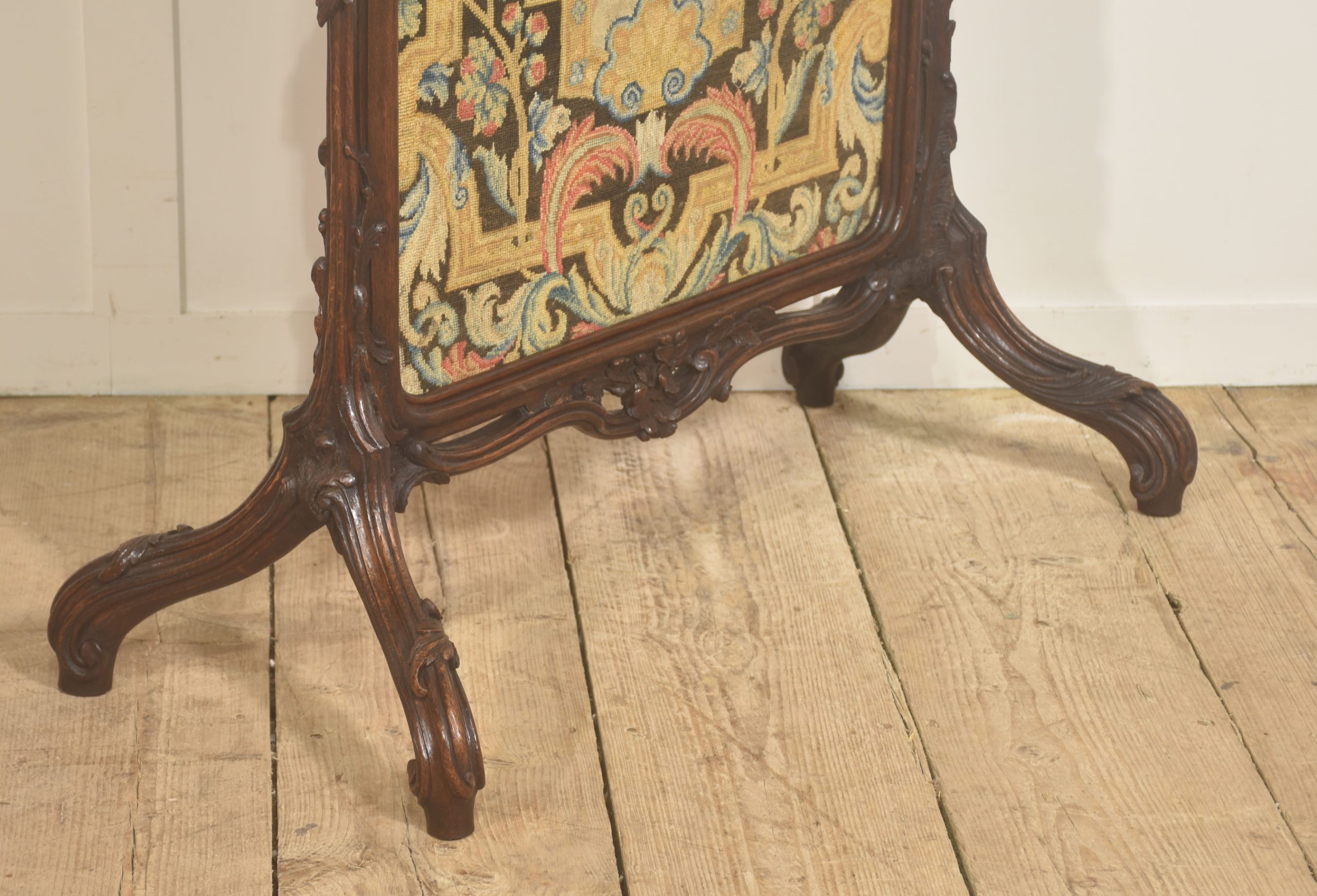 A finely carved late 19th-century freestanding firescreen executed in solid oak, showcasing elaborate Rococo Revival ornamentation and retaining its original figural needlework tapestry panel.