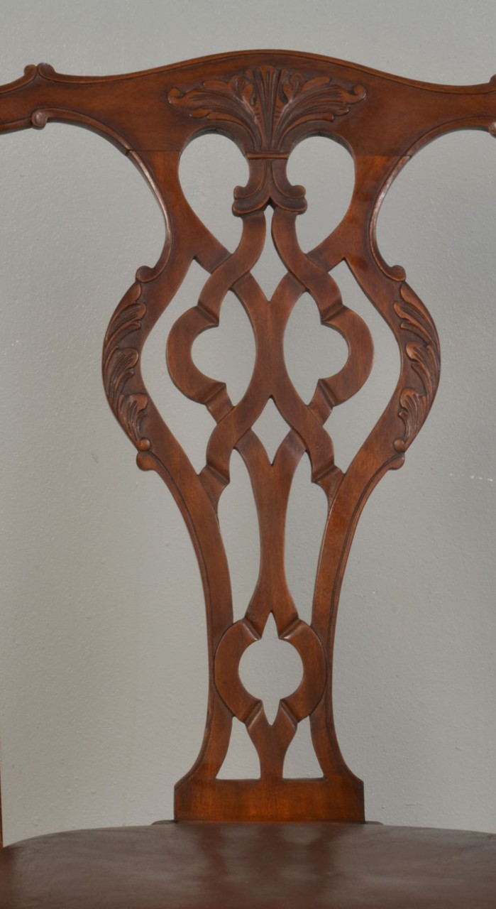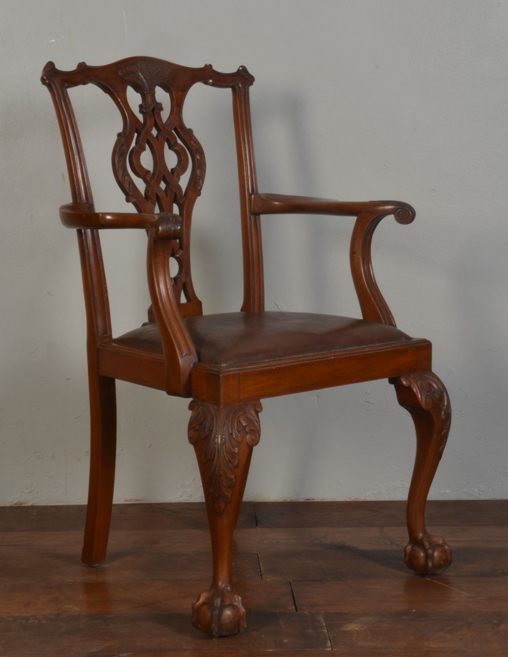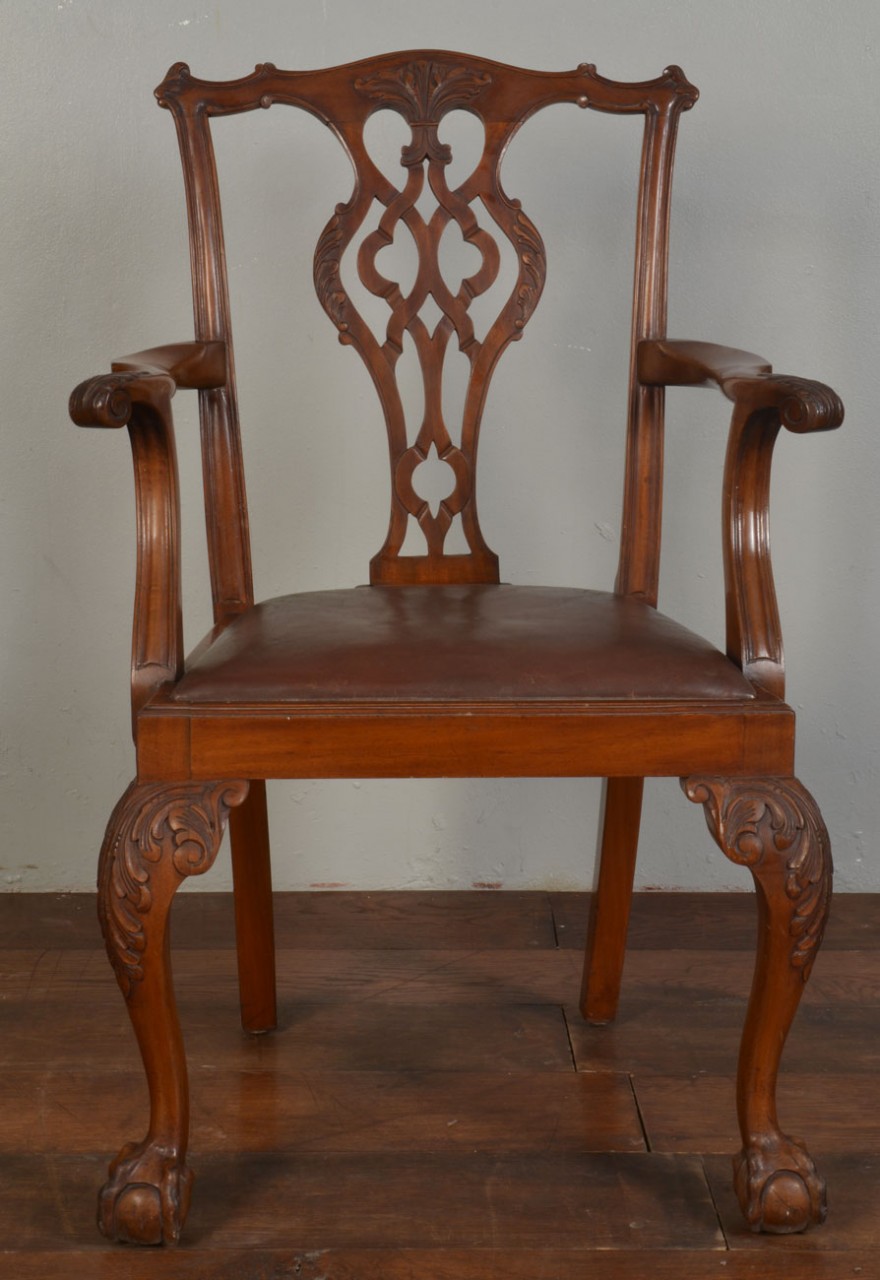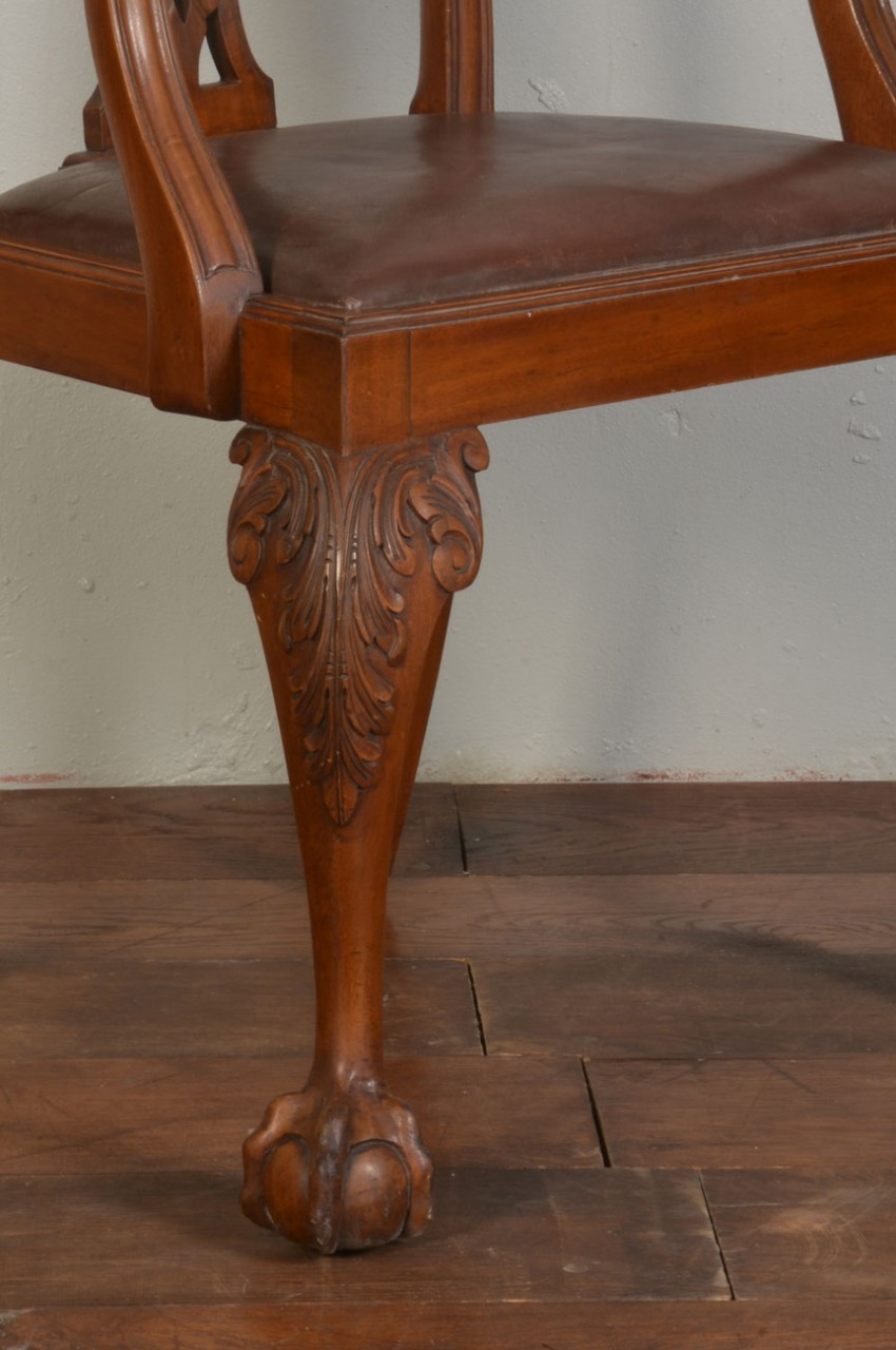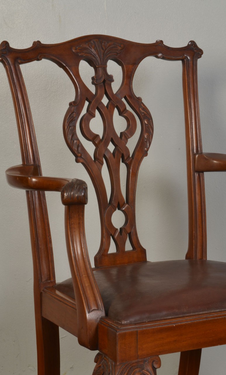 Chippendale style Arm Chair, with foliate carved splat backs, drop-in brown leather upholstered seats and cabriole fore legs terminating in claw and ball feet,