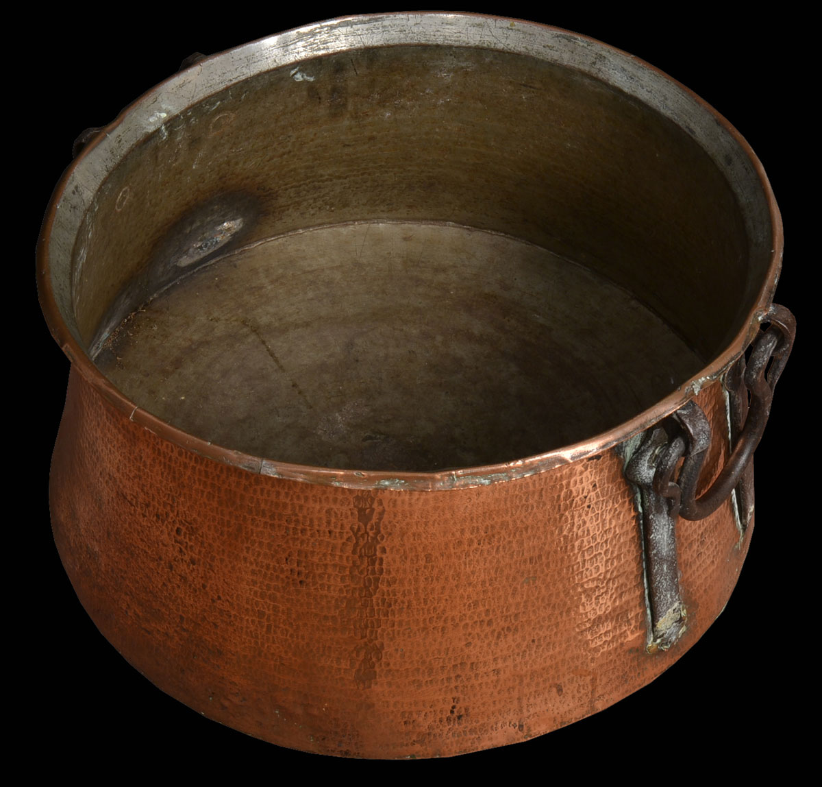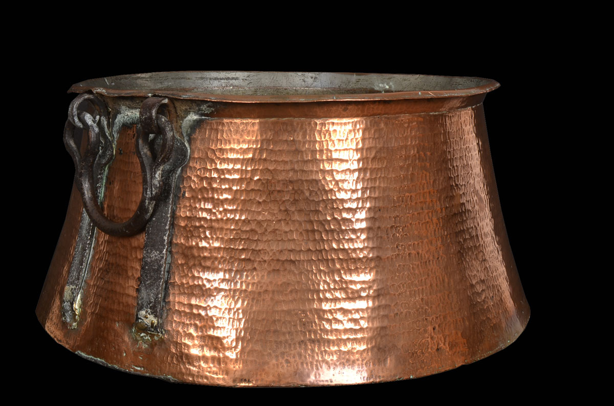 copper and iron mounted Coldren , the rolled rim above two iron drop handles and strap work banding