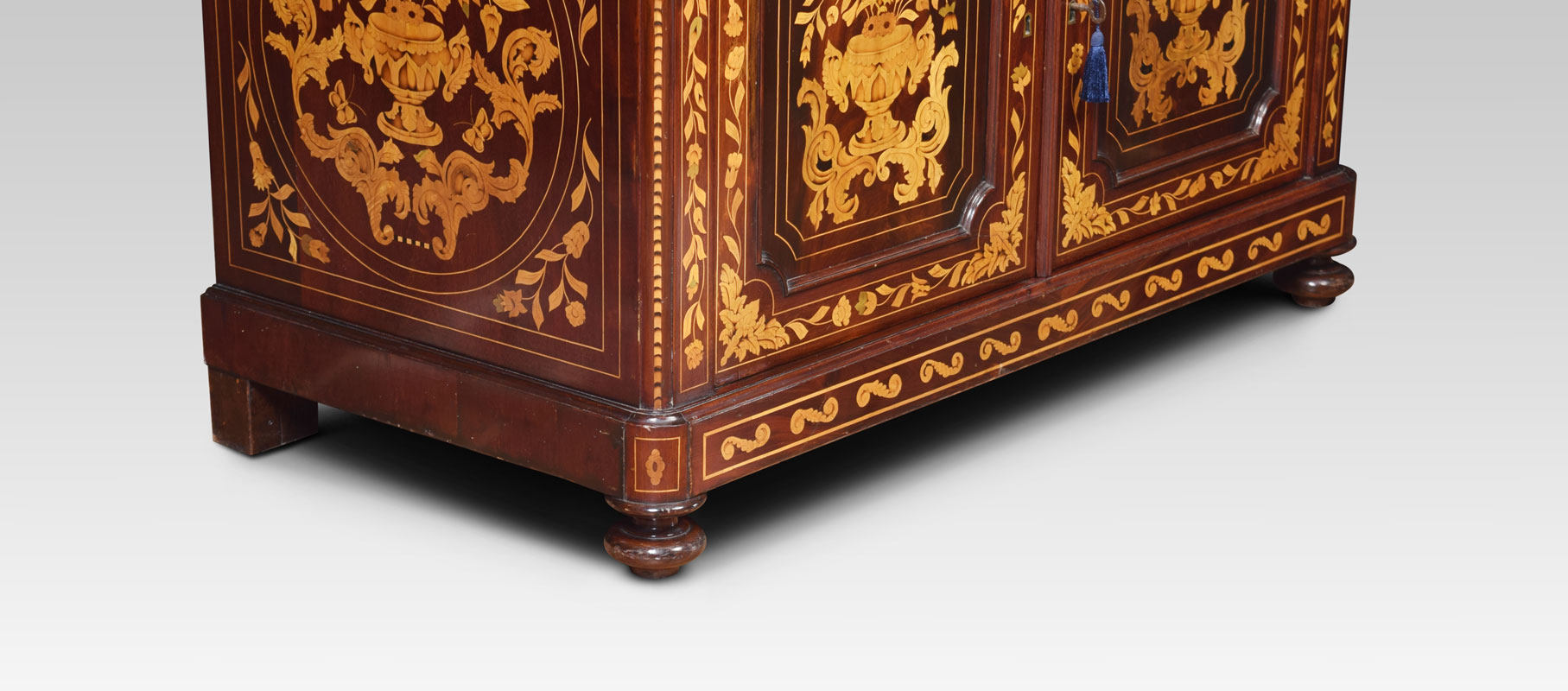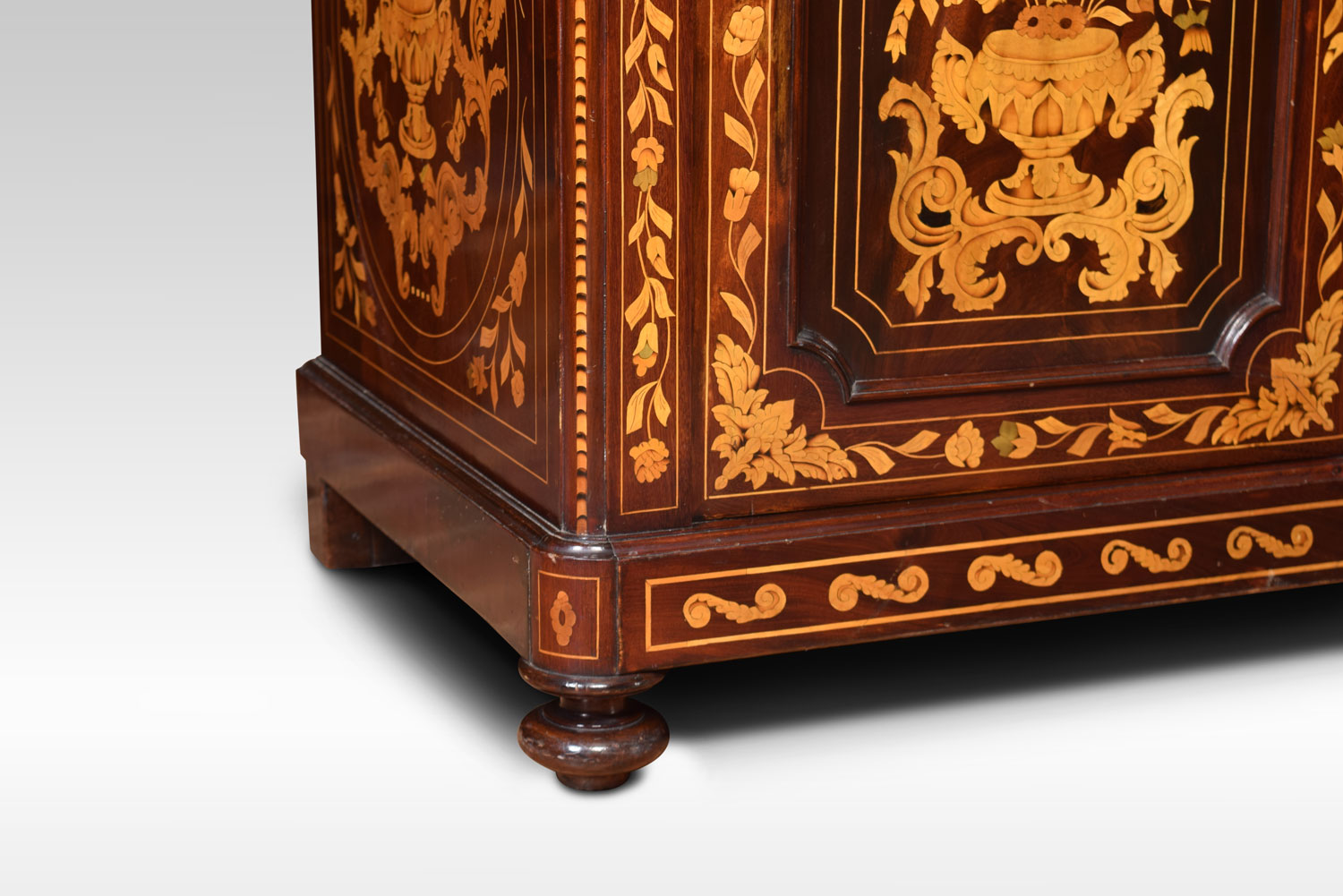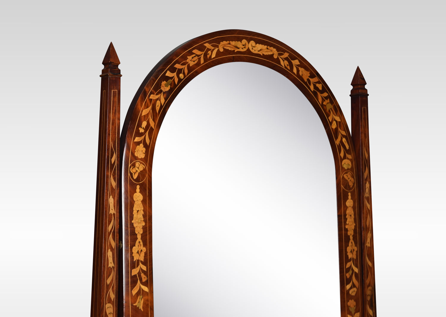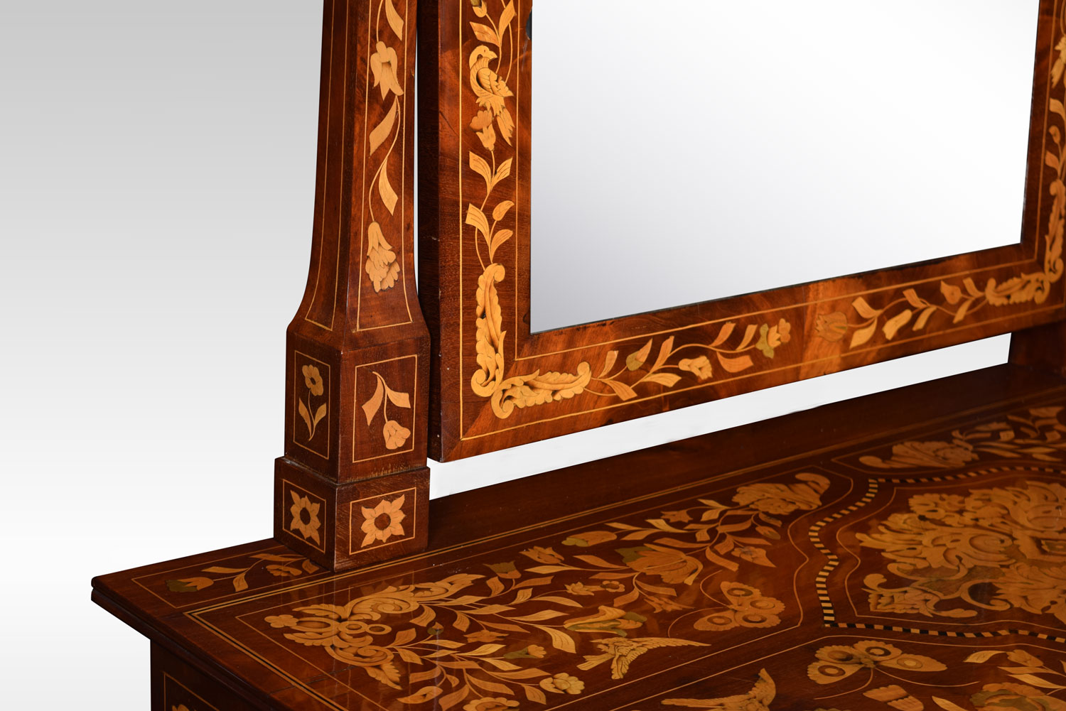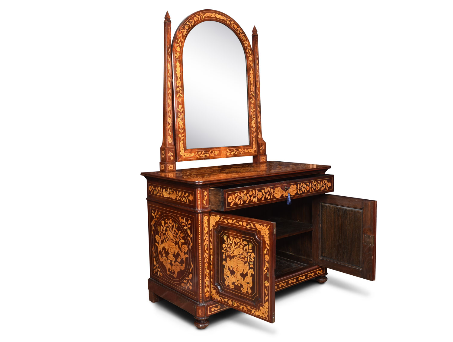 A Dutch mahogany and marquetry inlaid dressing table the arched mirror between tapered uprights To the base section fitted with long freeze drawer over a pair of cupboard doors with floral, bird, and urn marquetry,opening to reveal shelved interior. All raised up on bun feet.