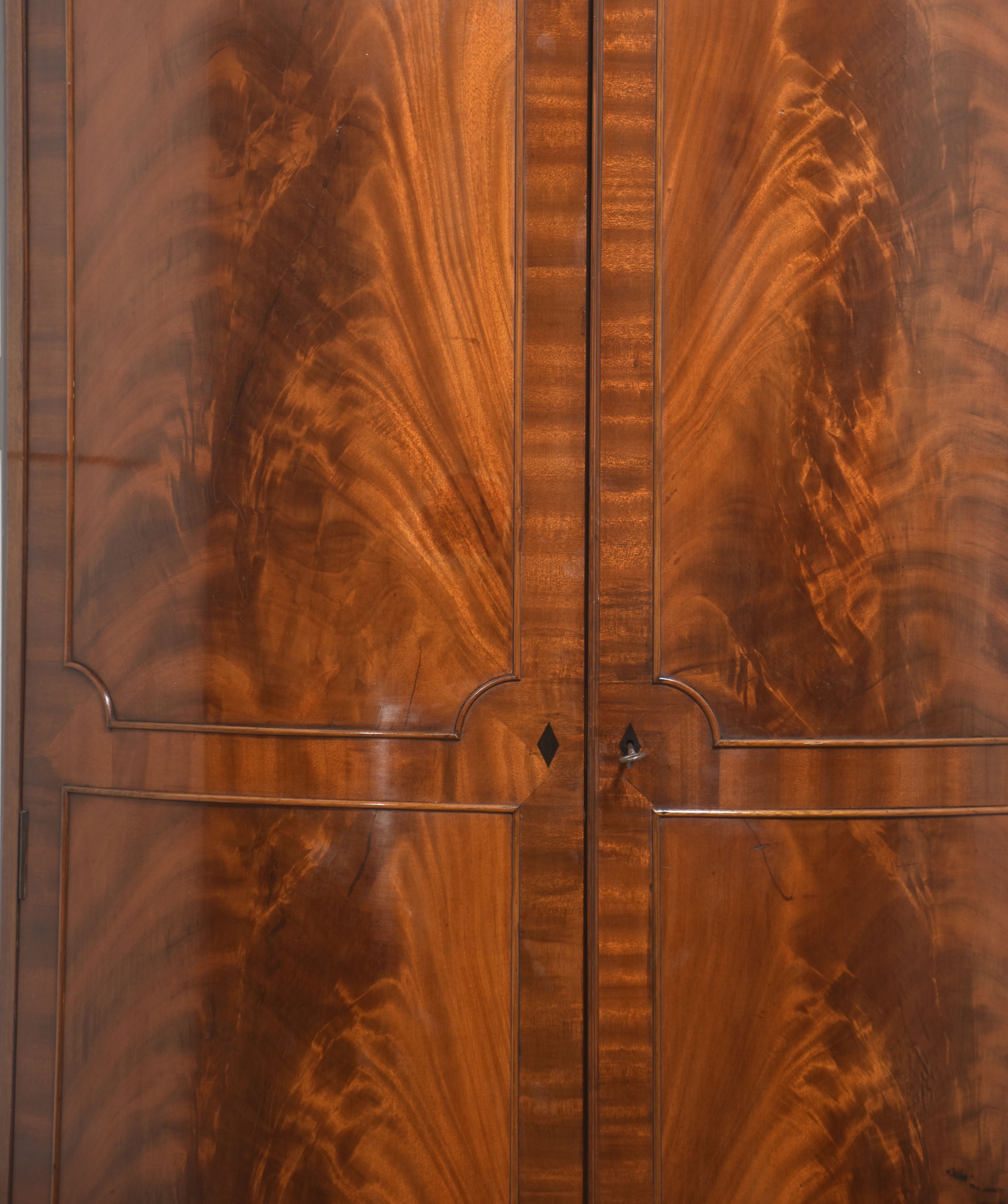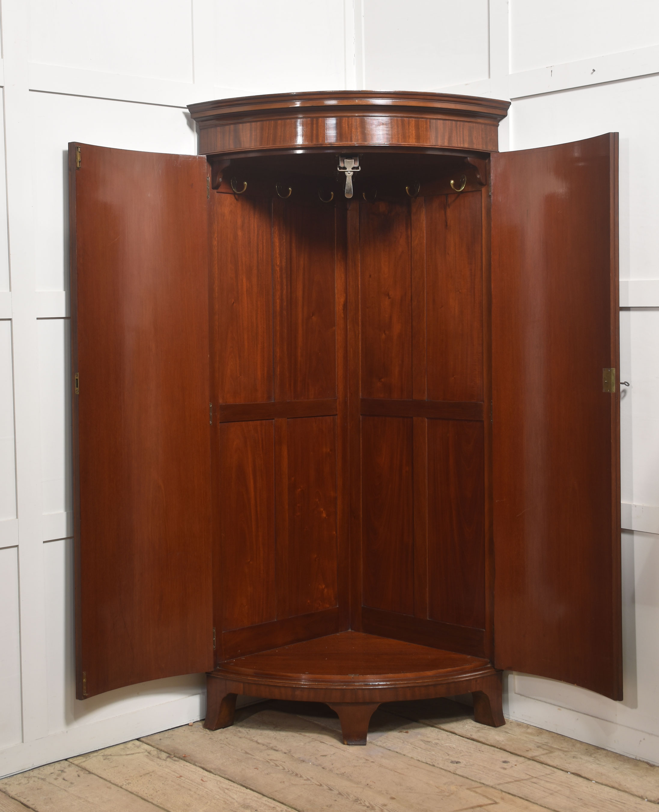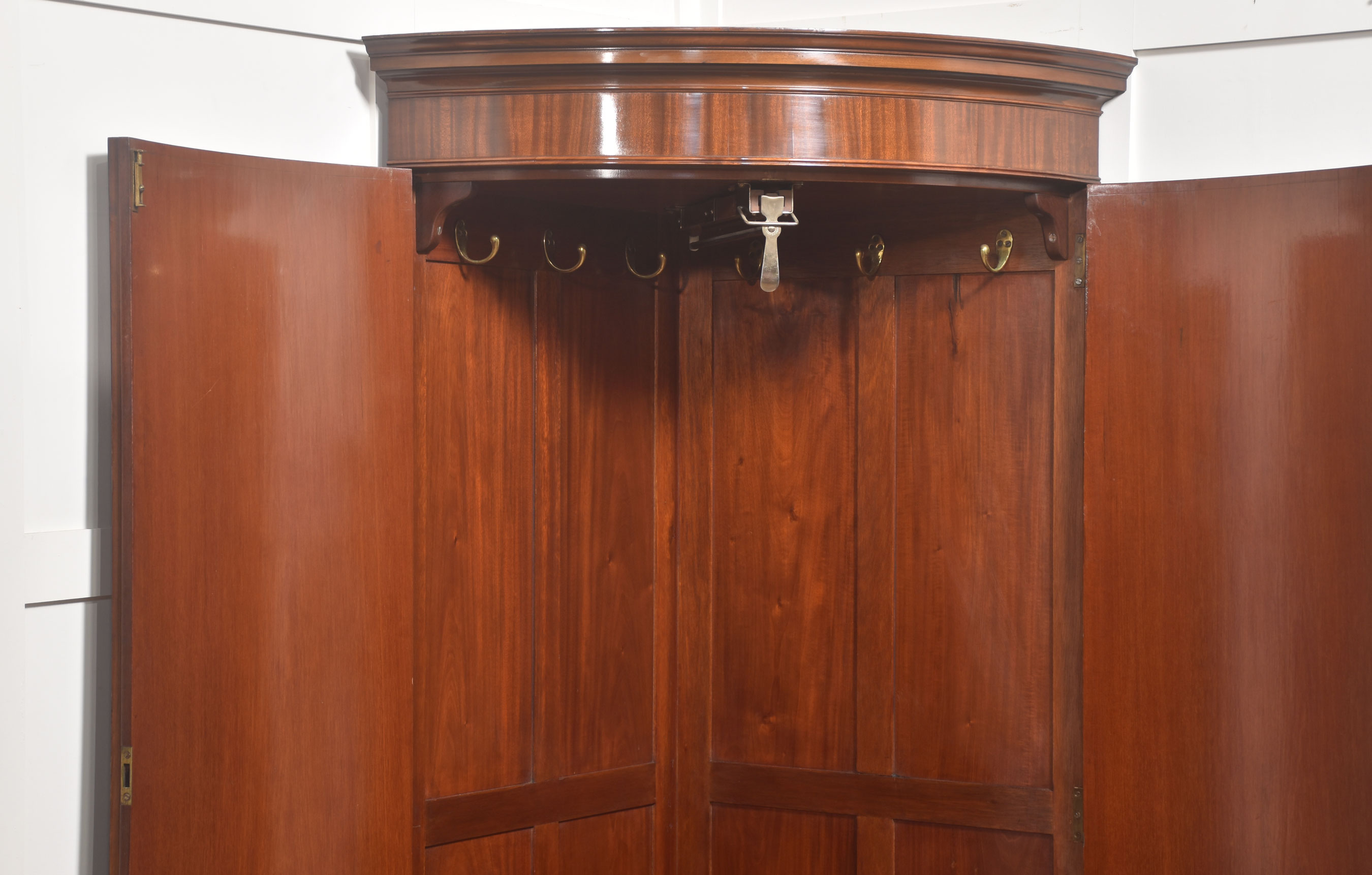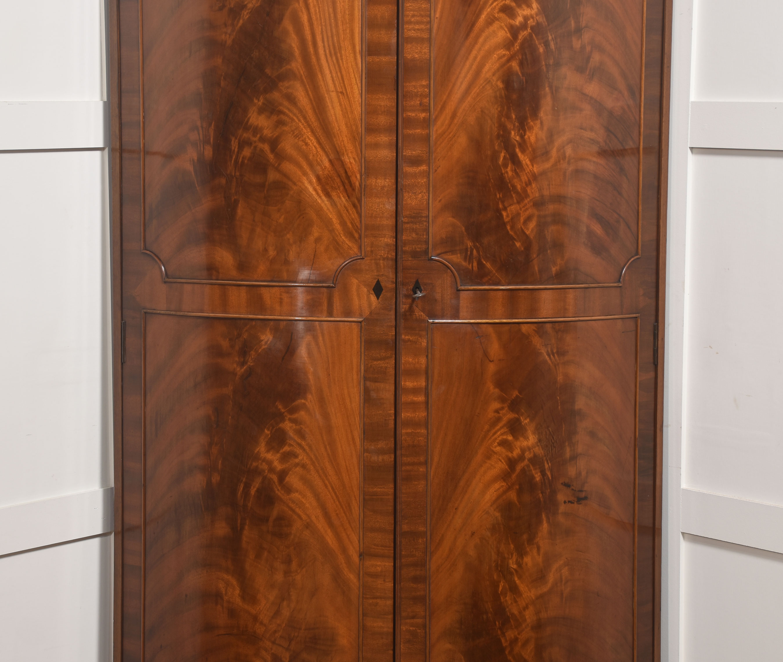A fine early 20th-century figured mahogany corner wardrobe of elegant bowed form, the quarter-veneered doors displaying particularly striking flame and feather figuring throughout. The double doors are framed with delicate moulded panels and open to reveal a well-fitted interior, retaining its original brass hooks and hanging rail, designed for the efficient storage of coats and garments.
