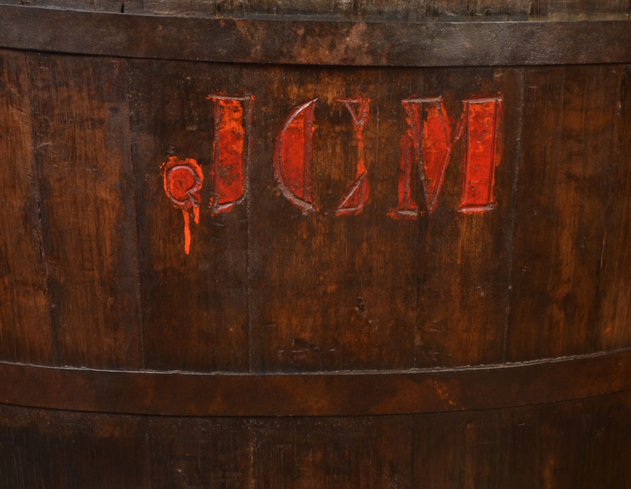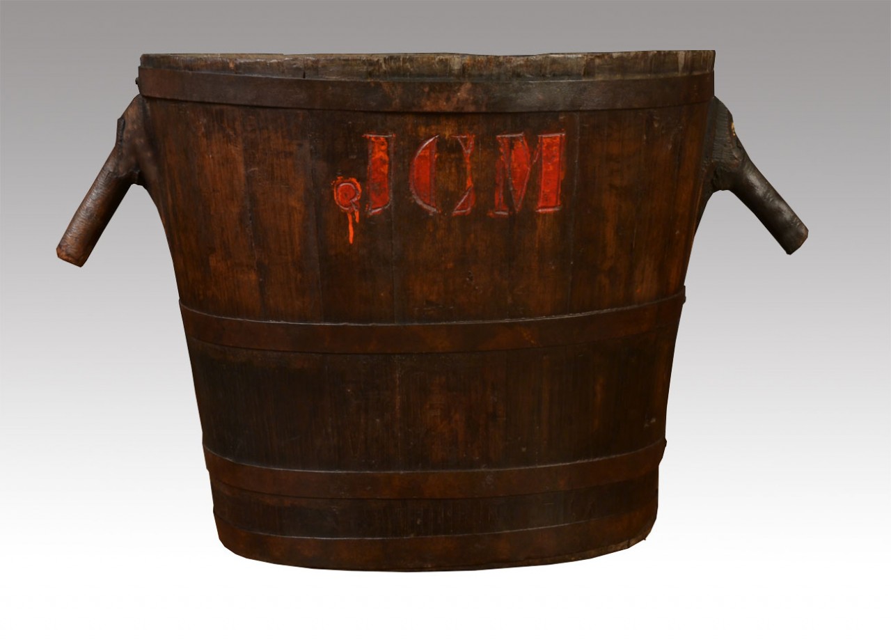 oval shaped grape hod made from slatted solid chestnut and iron bound. This grape hod would have been used in a French vineyard for collecting bunches of grapes before pressing, perfect for use as a log or coal basket/holder.