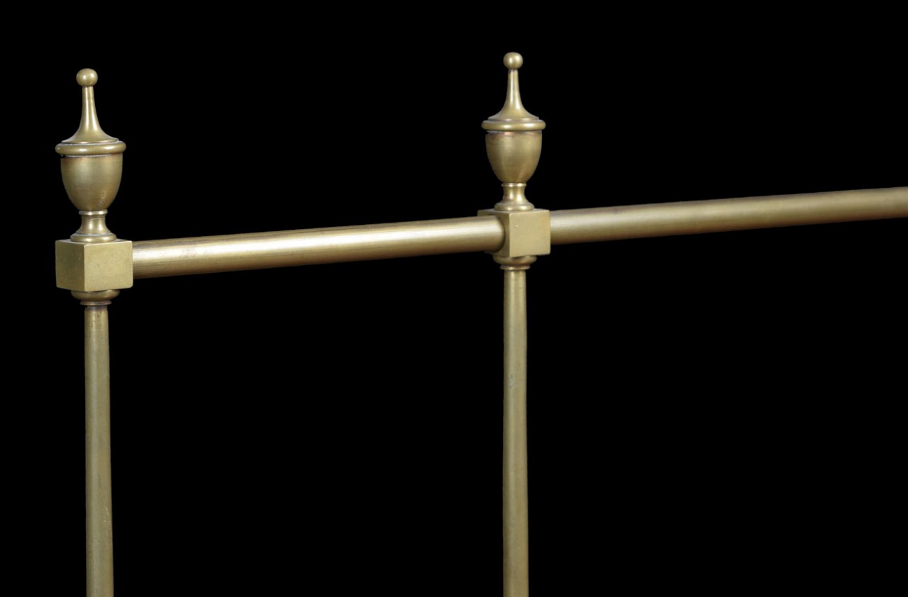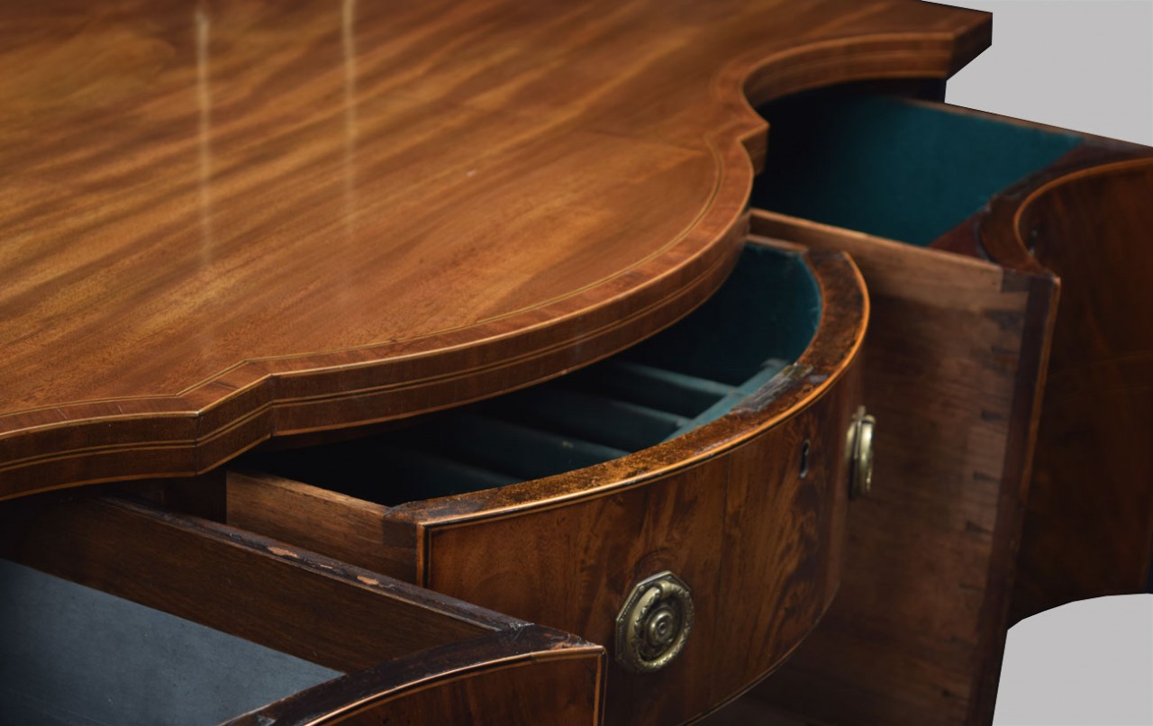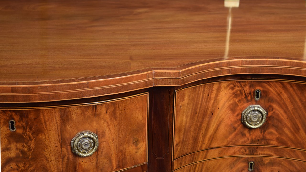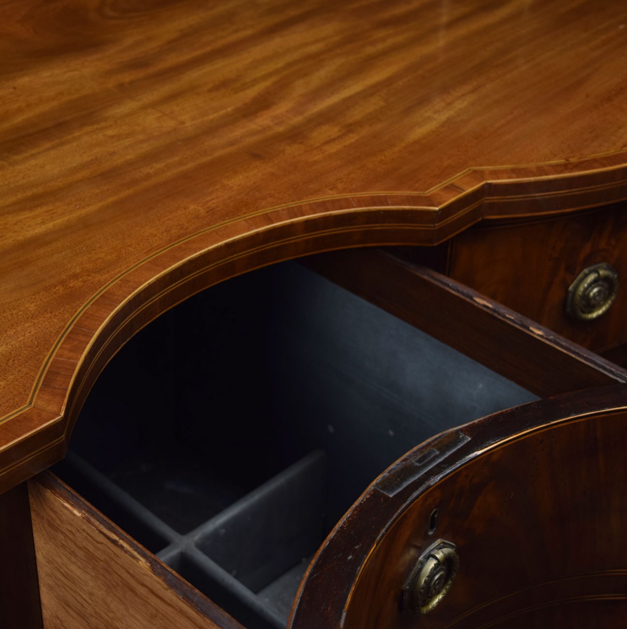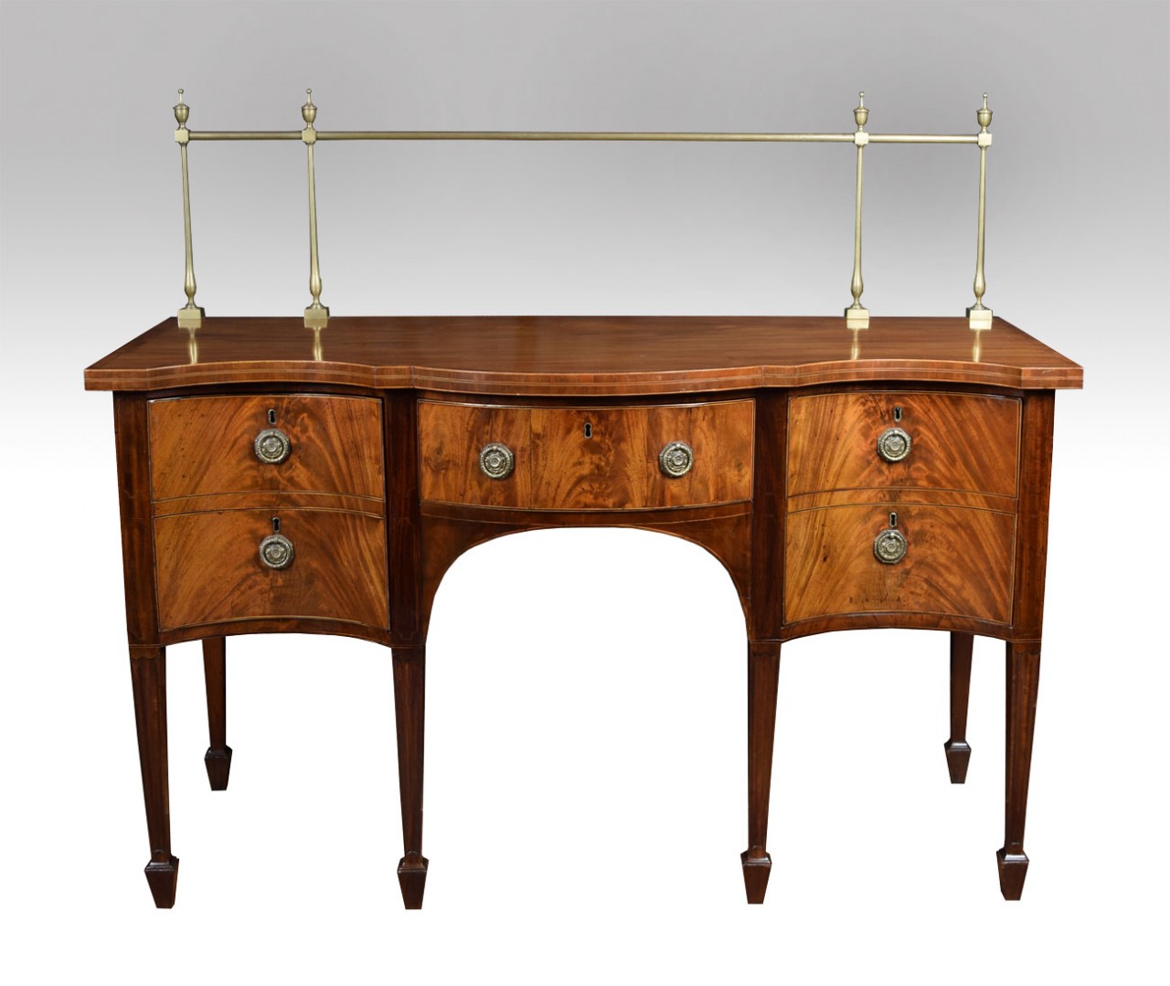 A mahogany sideboard having satinwood cross banding, brass rail surmount having urn finials on baluster turned supports, the deep boxwood bordered top raised above single frieze drawer with brass ring handles, flanked by two deep drawers (one incorporating a cellaret), on square tapered legs,