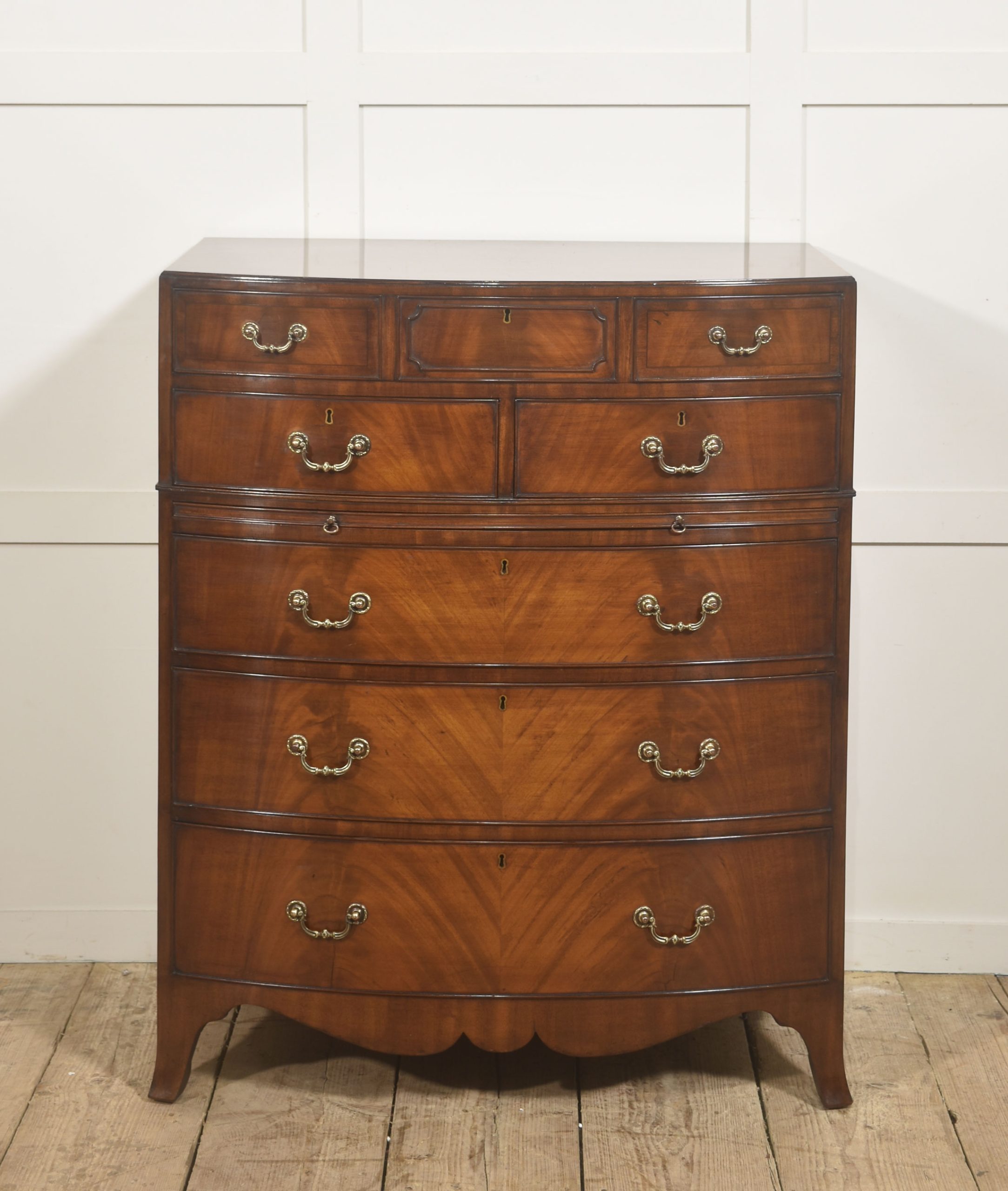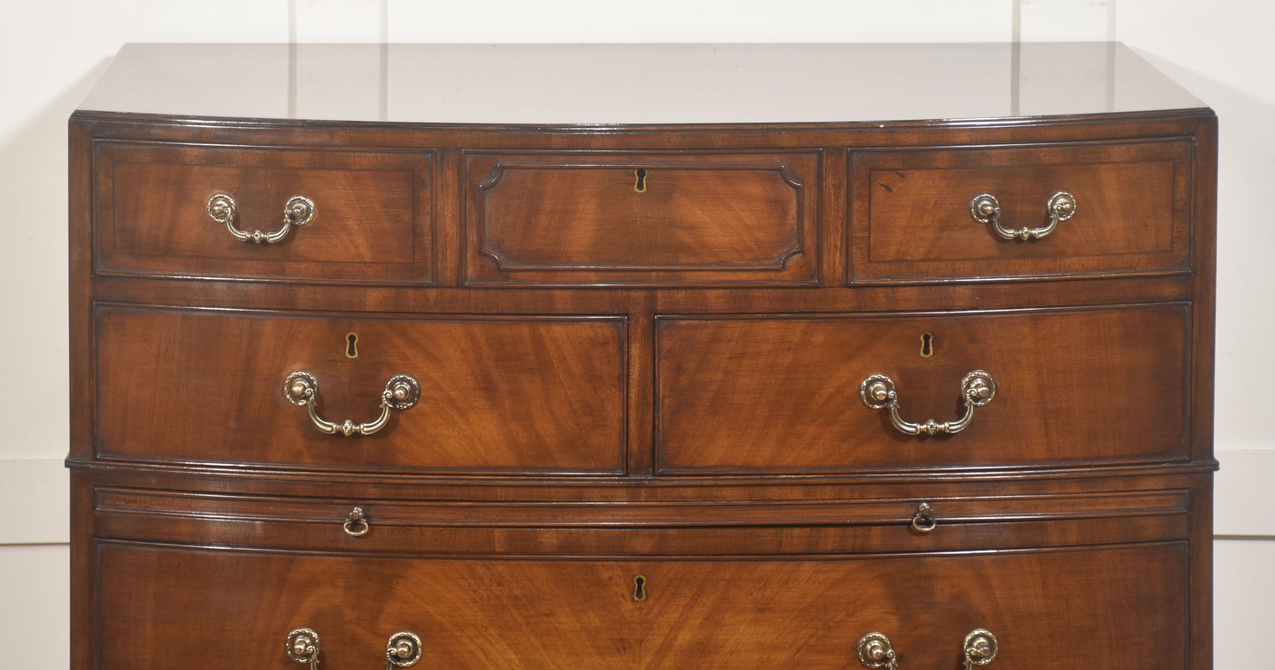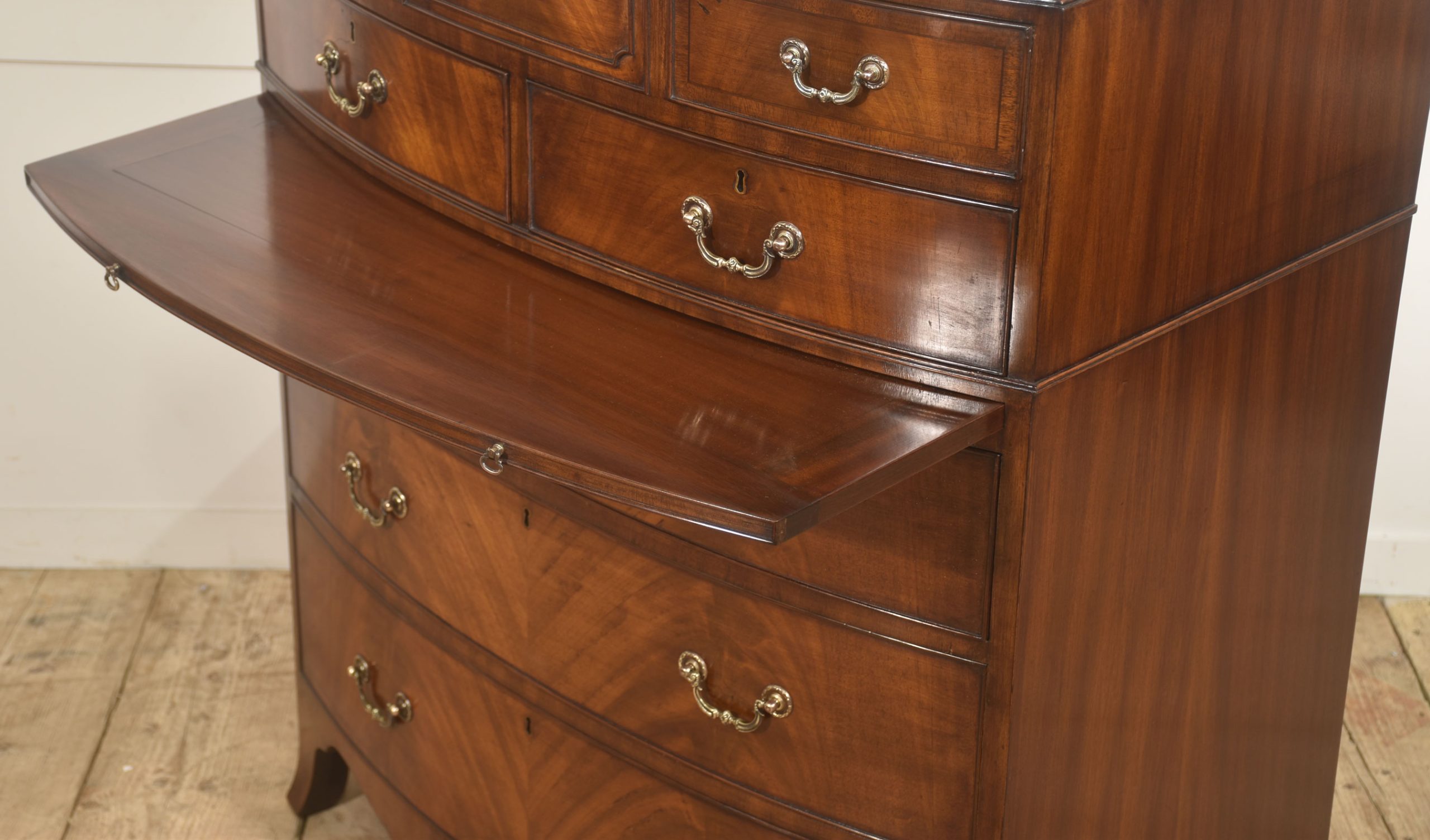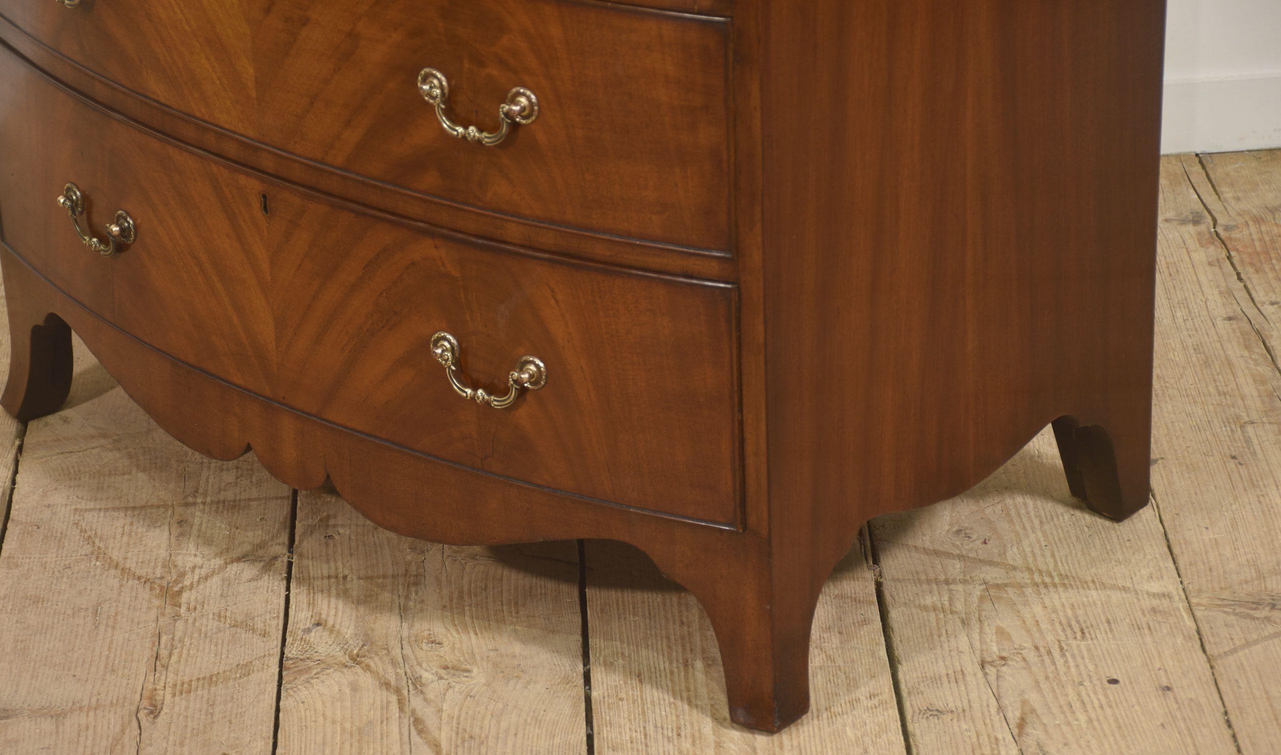A fine George III style serpentine chest of drawers in richly figured mahogany, of elegant and balanced proportions. The bowed front is veneered in beautifully figured, bookmatched mahogany, creating a rich flame pattern across the drawer fronts, while the shaped top follows the serpentine line to enhance the refined profile.