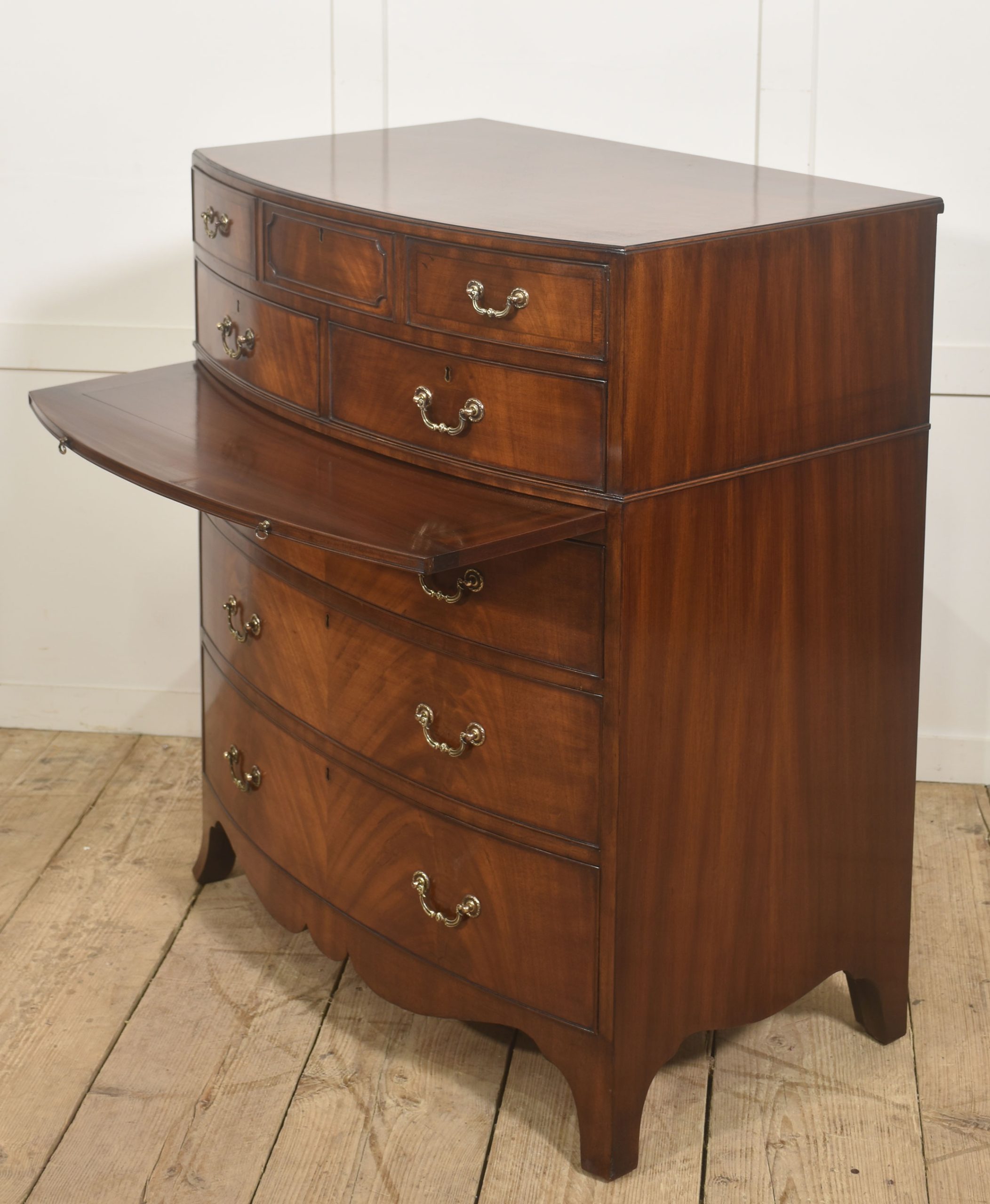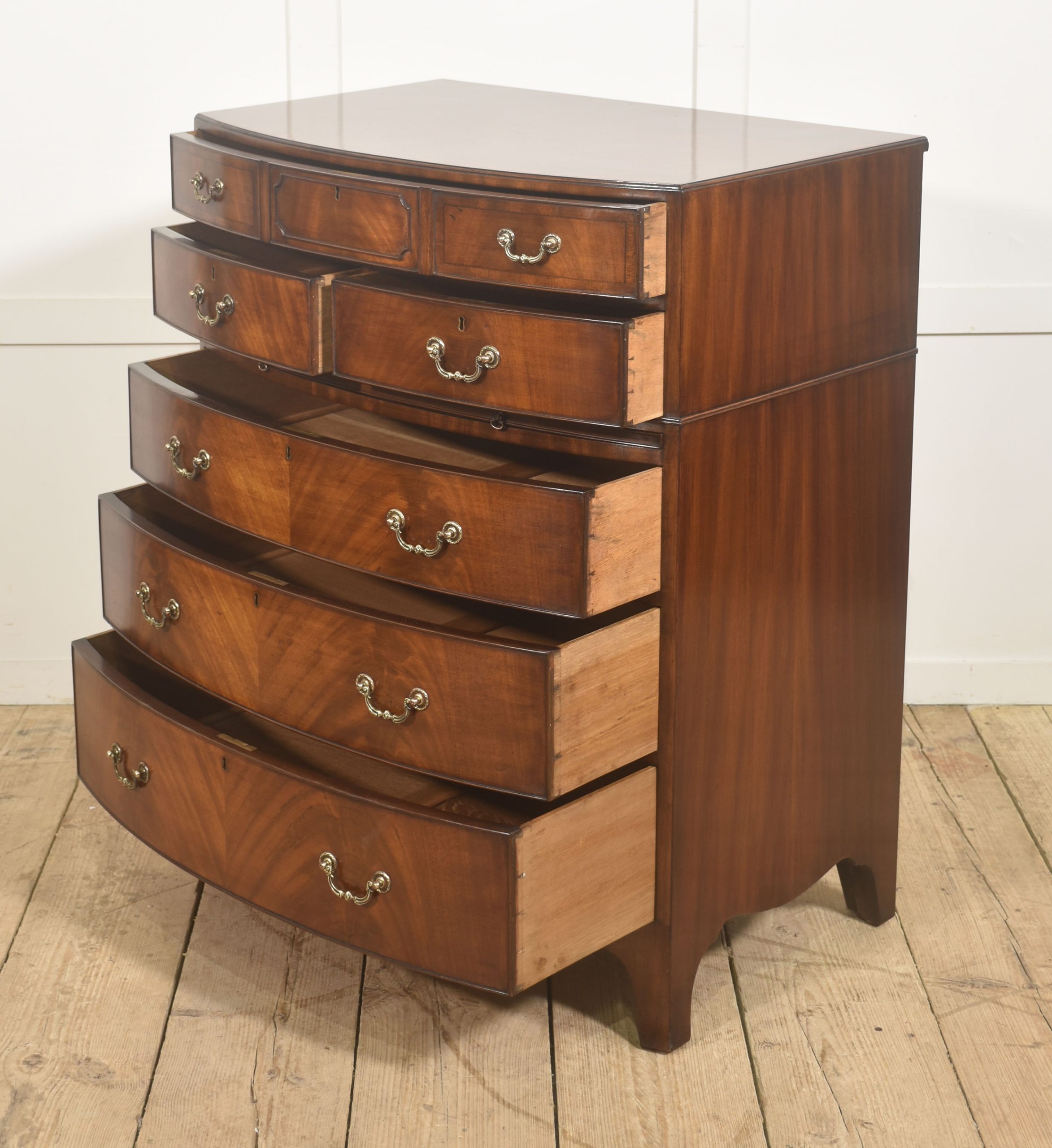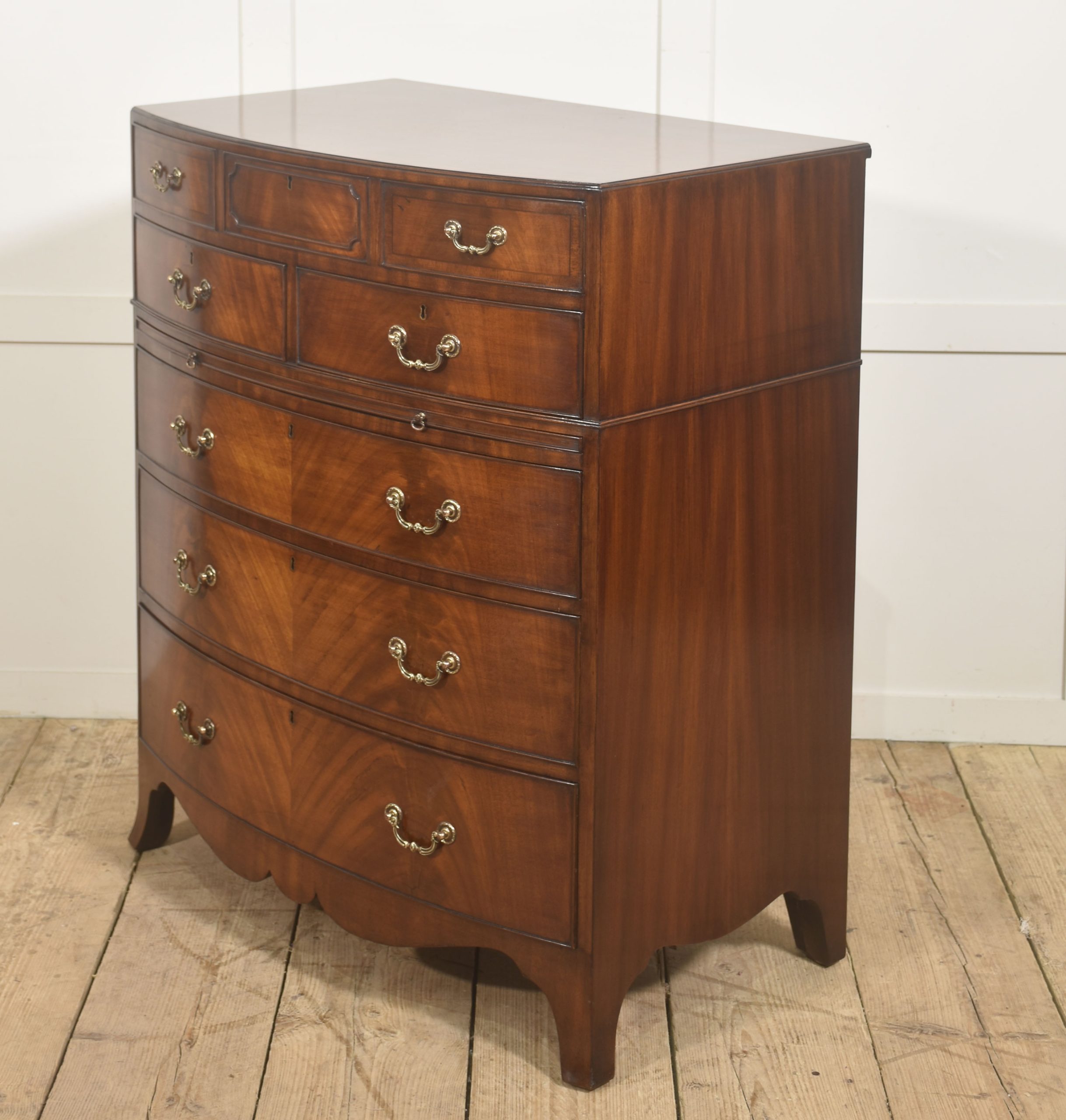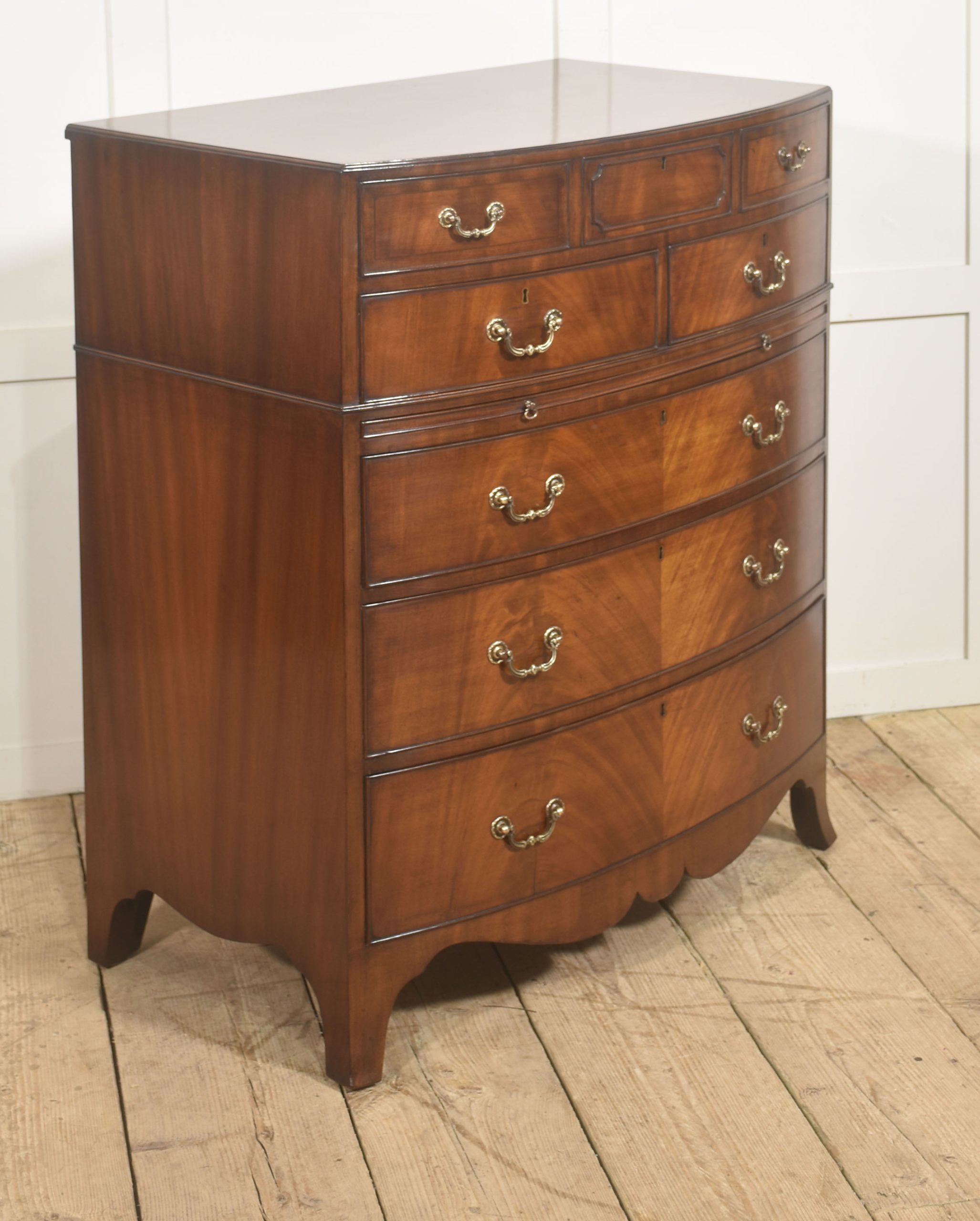 The chest stands on shaped bracket feet and features a subtle scalloped apron that echoes the curvature of the façade. Oak-lined drawers and solid traditional construction reflect quality cabinetmaking throughout.