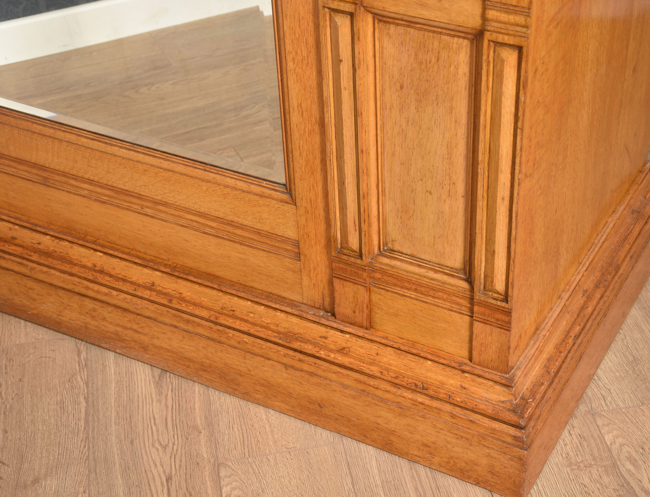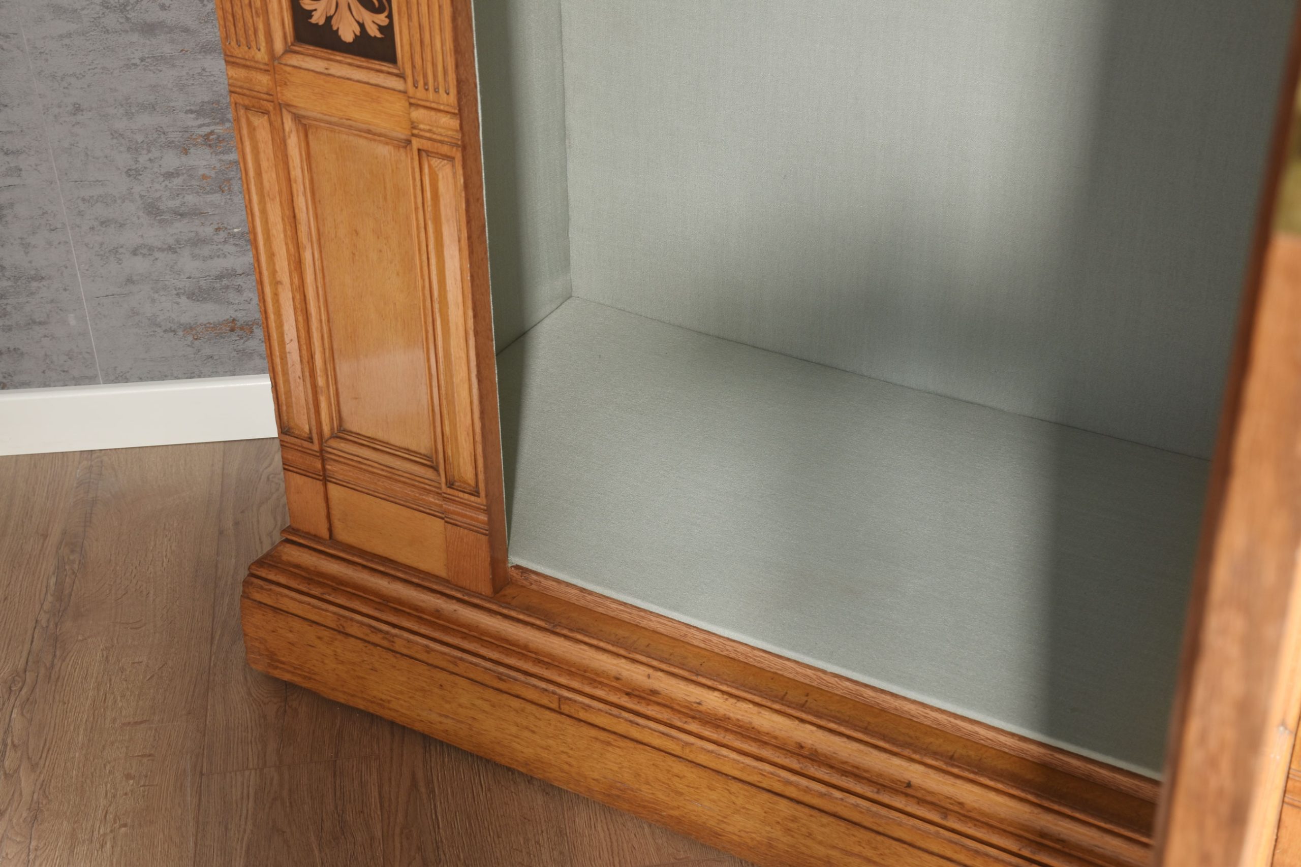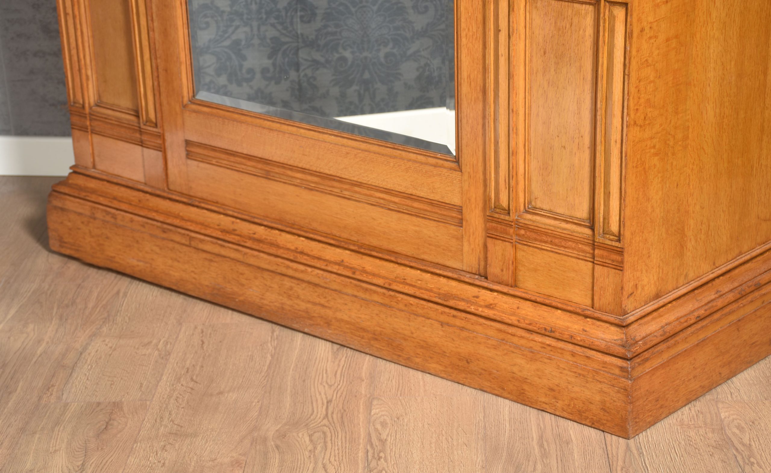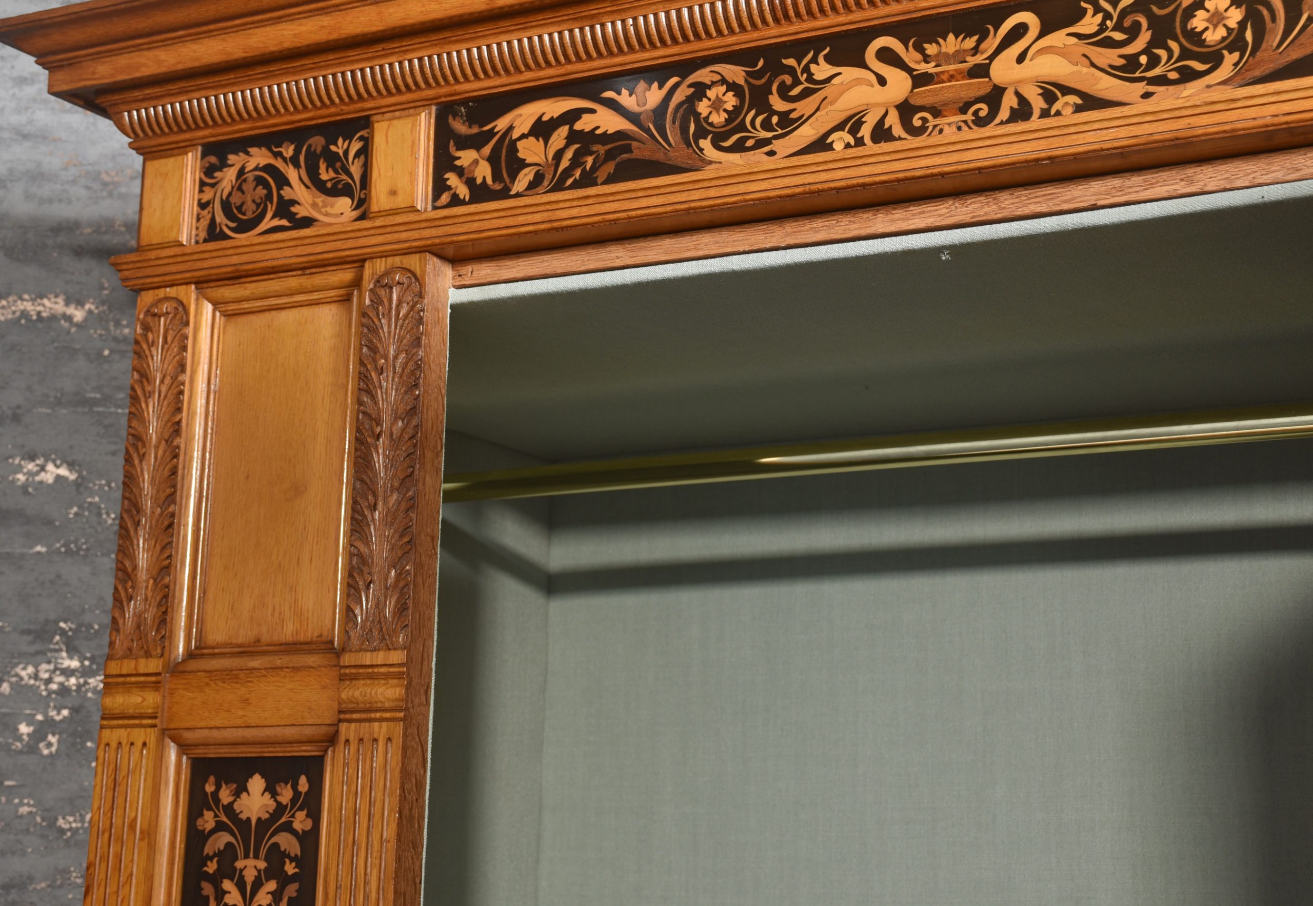 Gillows of Lancaster marquetry inlaid oak wardrobe, having carved moulded cornice above large original bevelled mirror door opening to reveal an upholstered interior with large hanging rail. Flanked by ebonised panels with scrolling floral marquetry detail. All raised on a stepped plinth base.