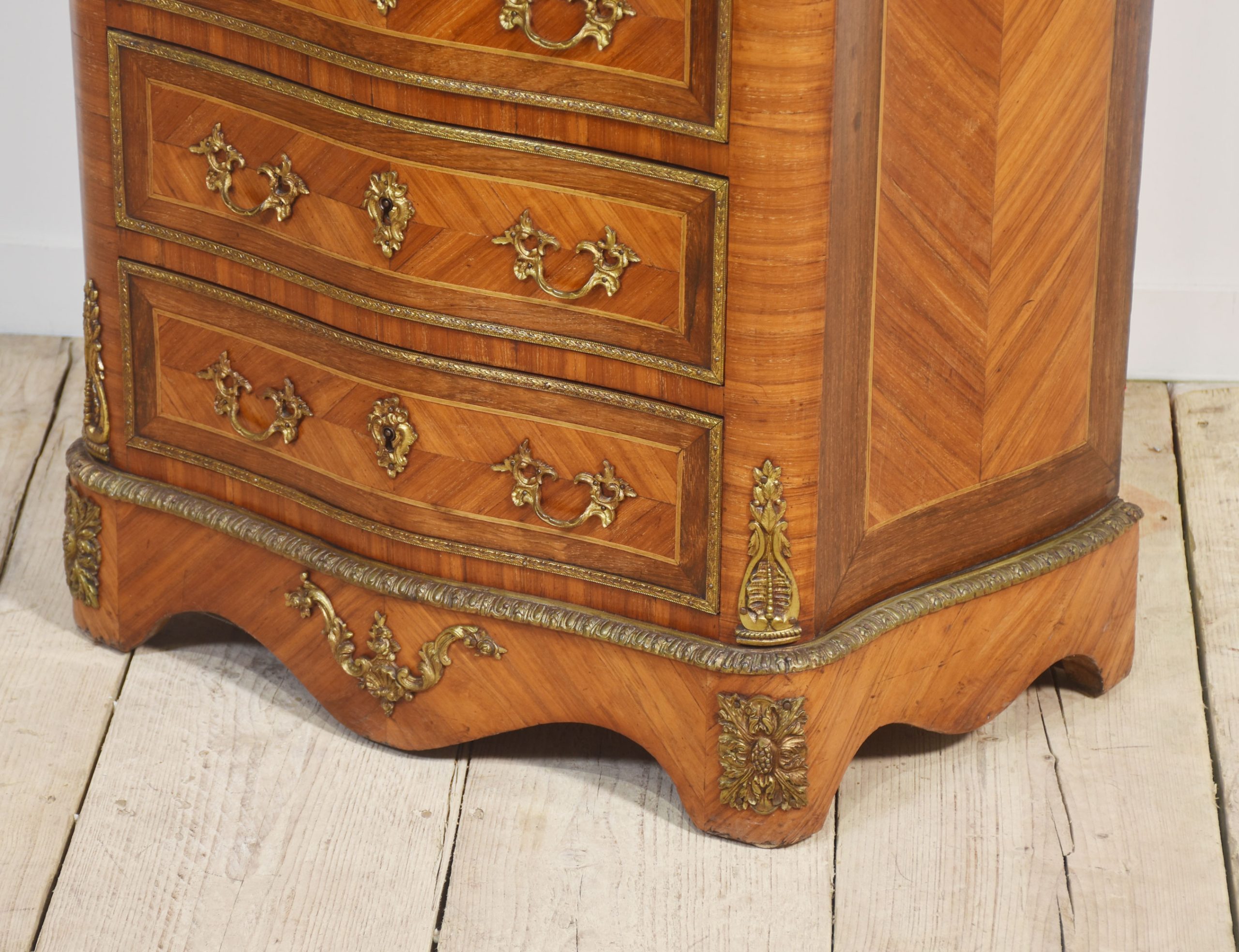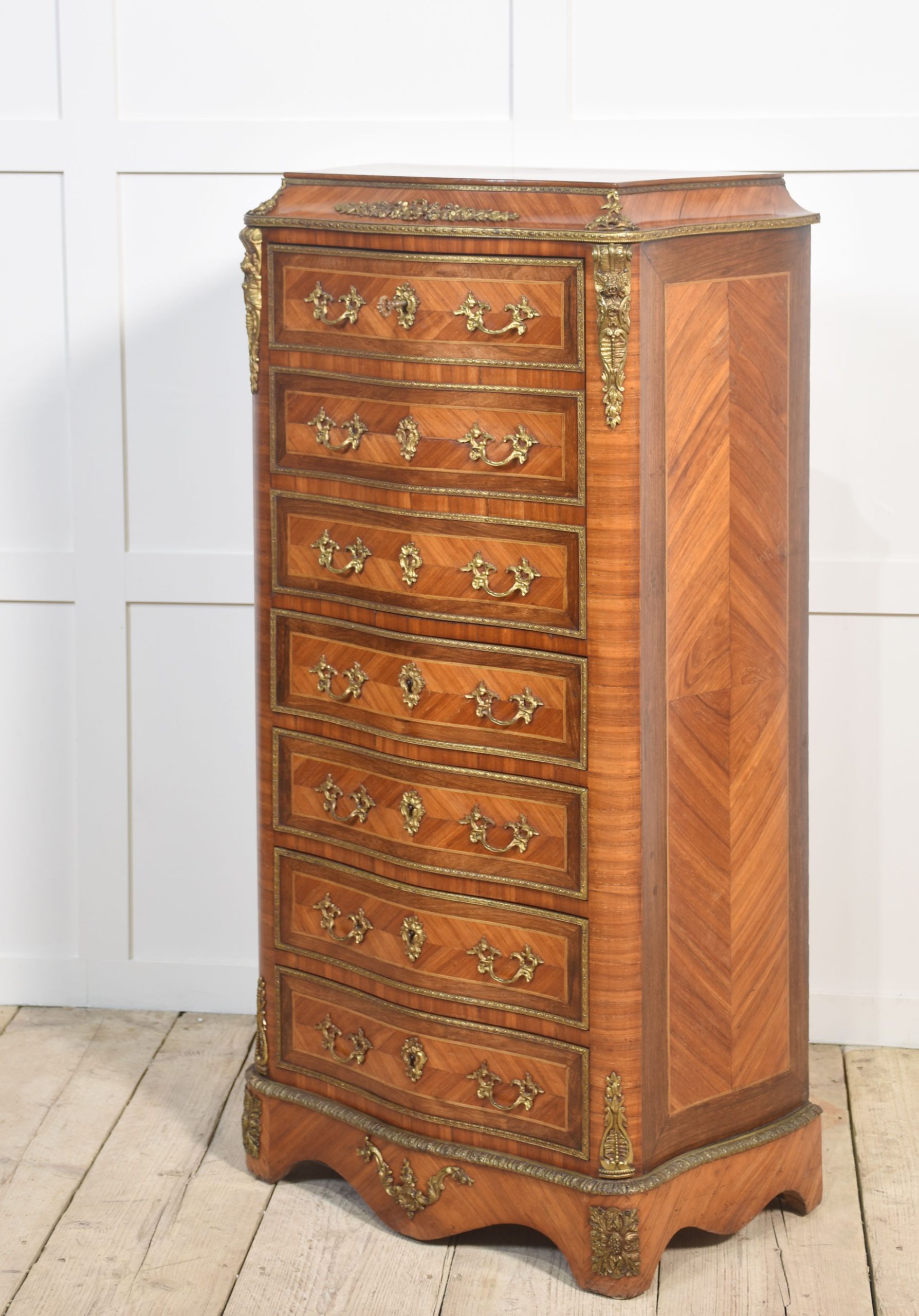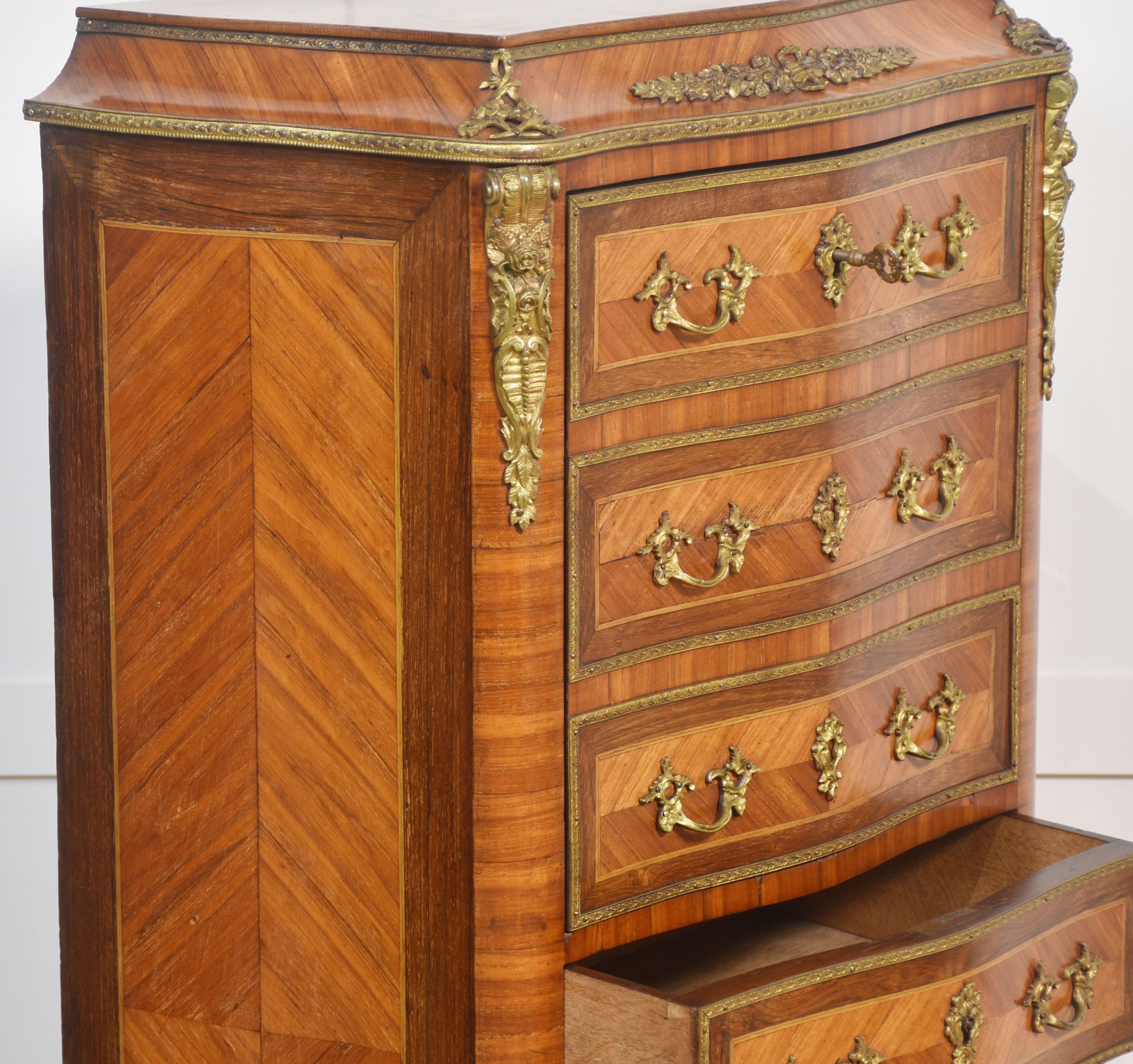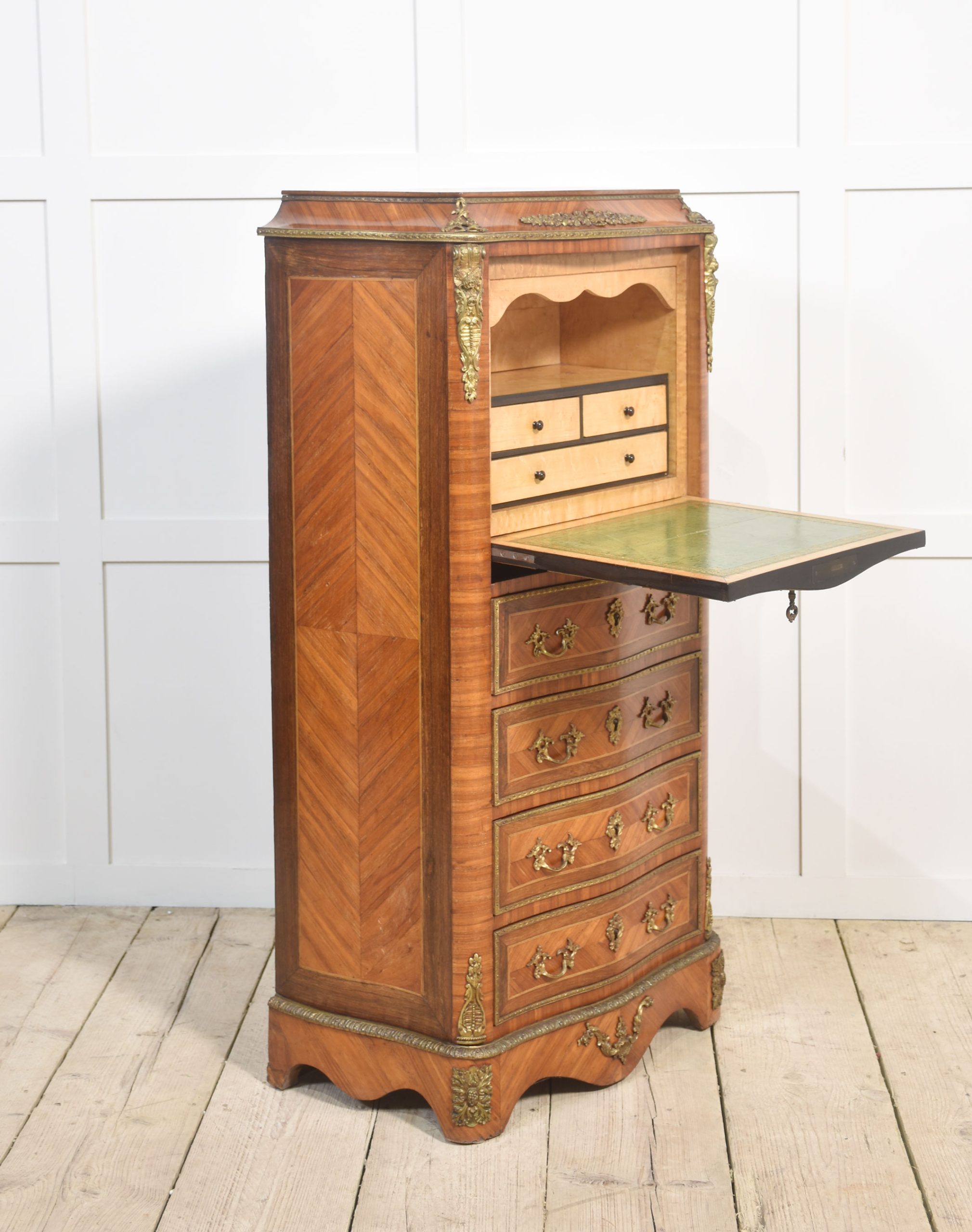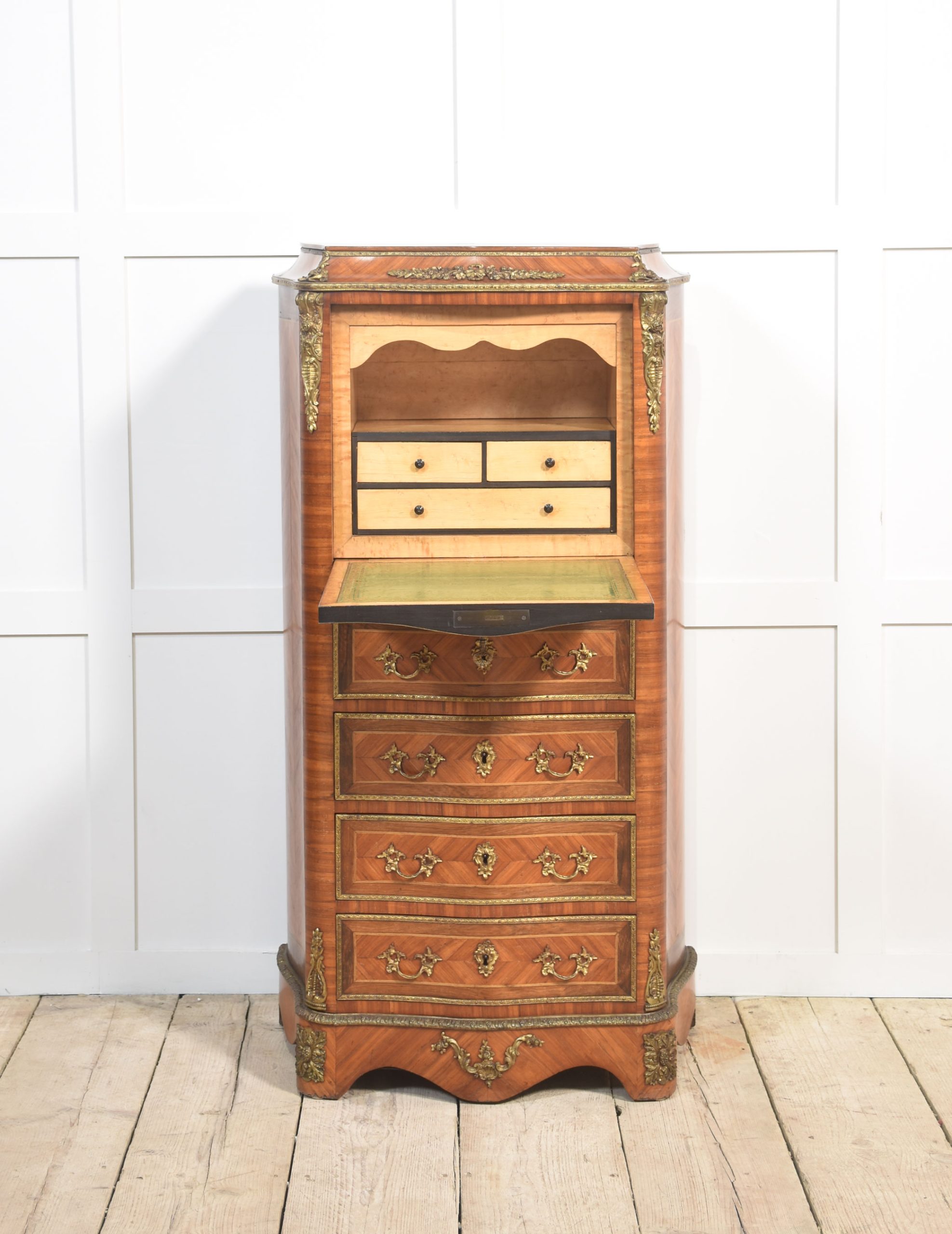 A French Kingwood secretaire a’ abbattant, in the Louis XVI taste, the well-figured top, above conforming serpentine front over a fall front secretaire, enclosing drawers and shelf with a green tooled leather writing surface, above four further drawers, all fitted with Rococo style gilt metal handles and key escutcheons, with gilt metal mounts, raised on a shaped base.