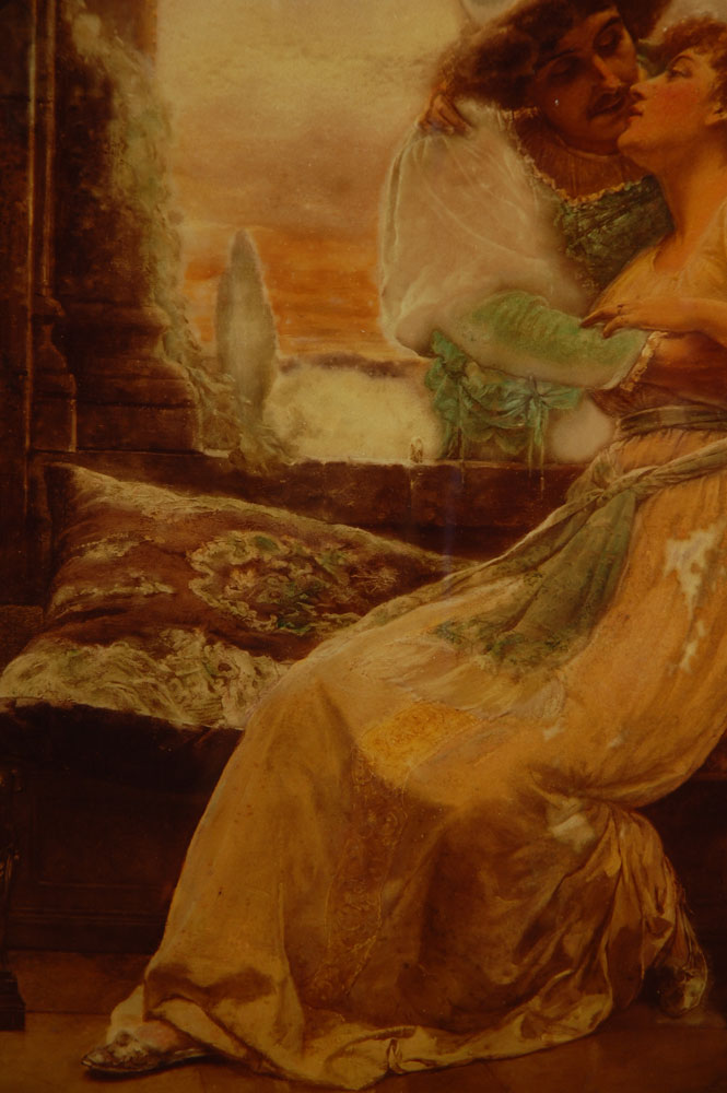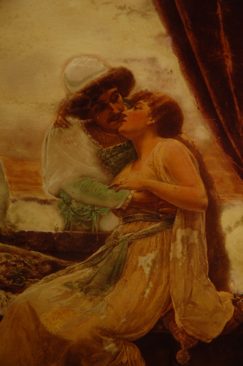 A gilt framed Art Nouveau crystoleum depicting a love scene of a couple (some damage to frame)
