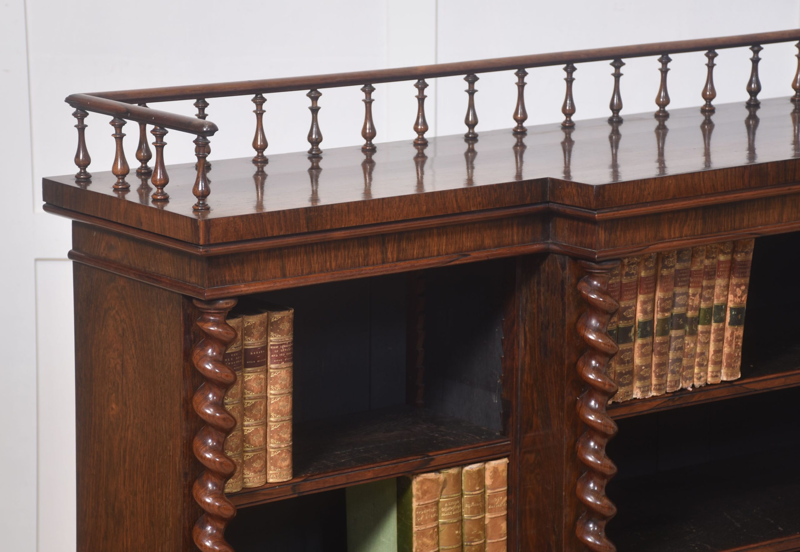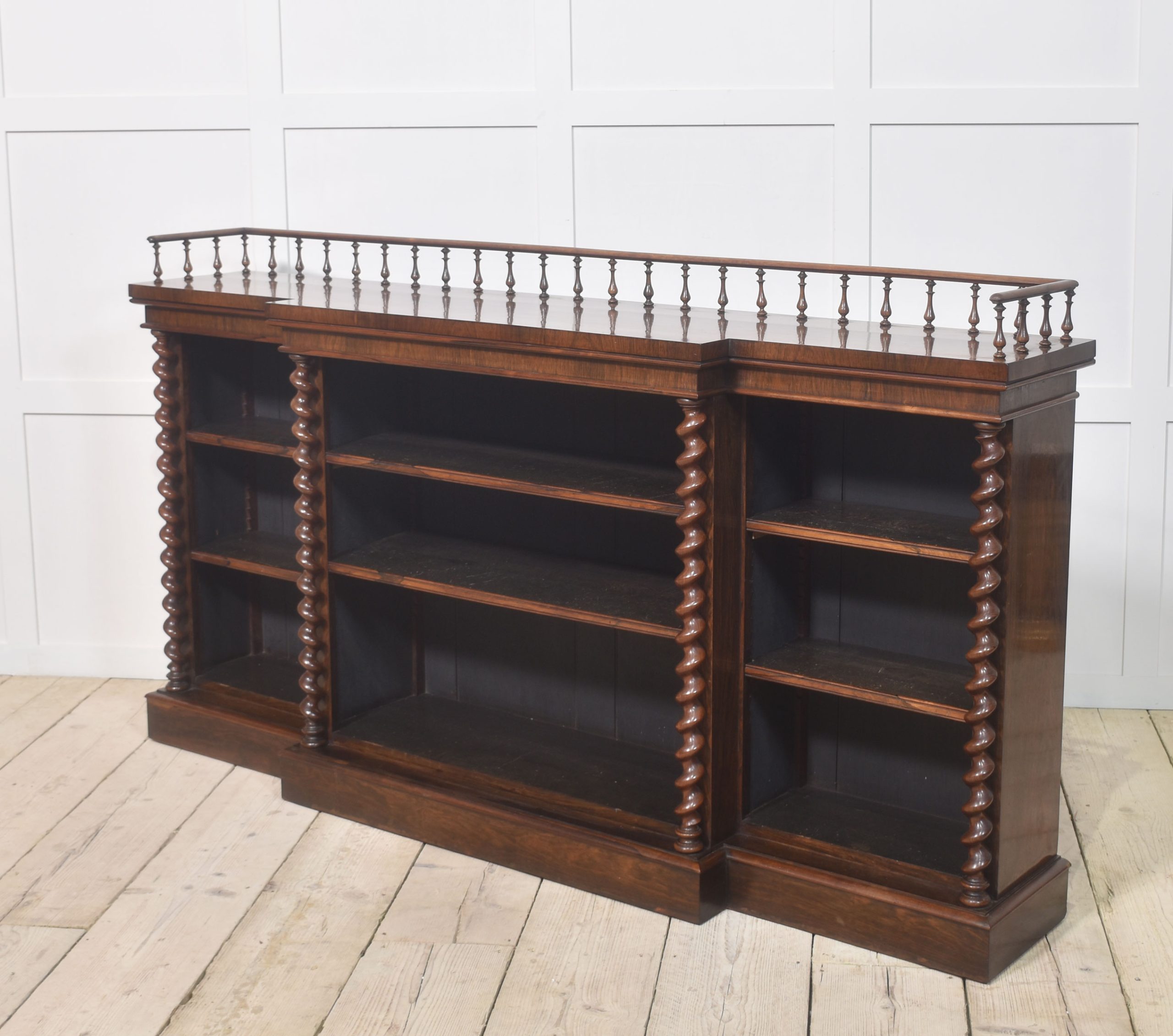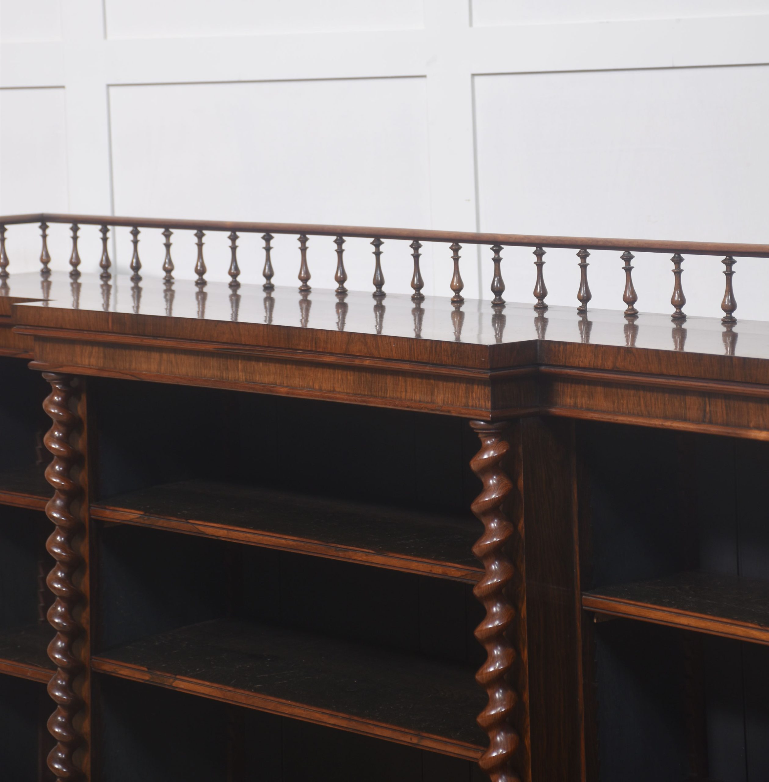 Rosewood open bookcase, the large rectangular breakfront top having raised spindle gallery, above three bays of adjustable shelves, divided by twisting pilasters. All are raised on a plinth base.
