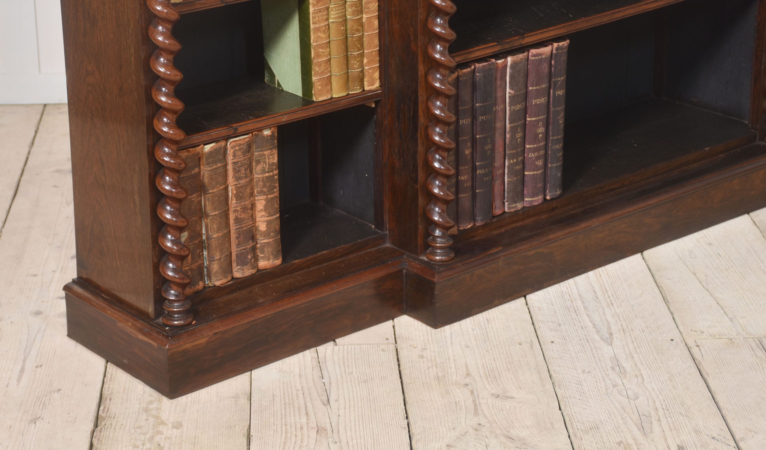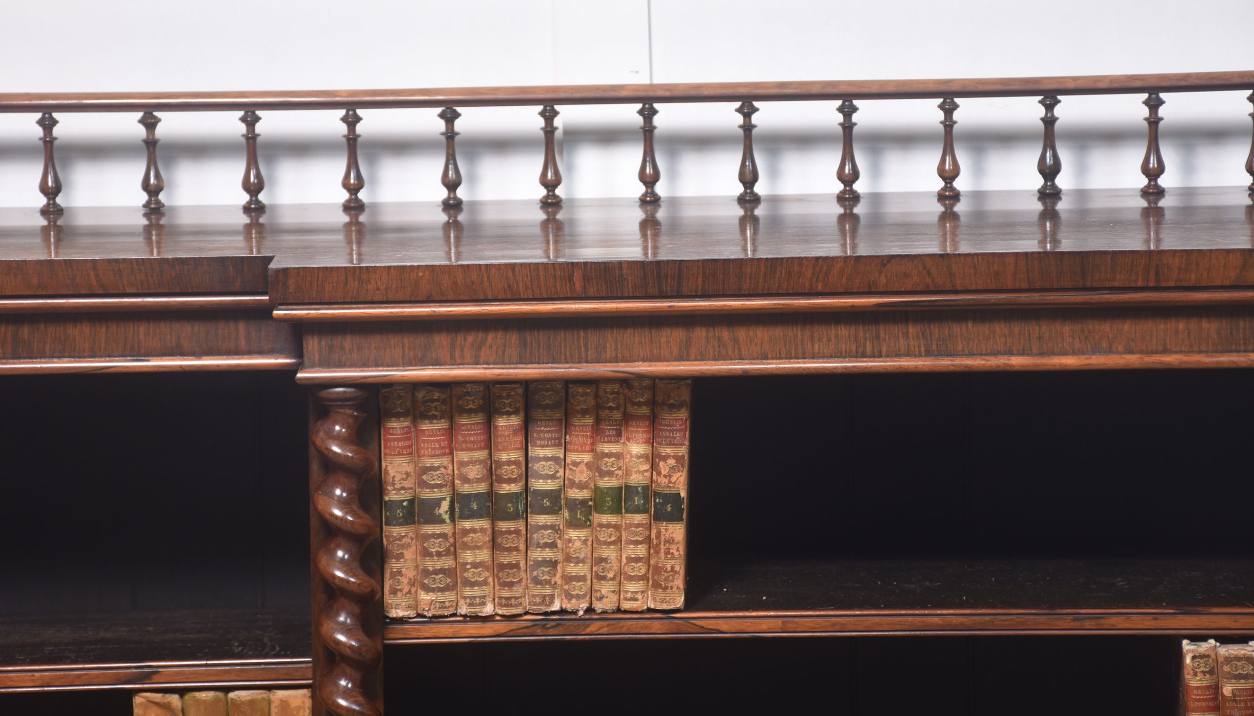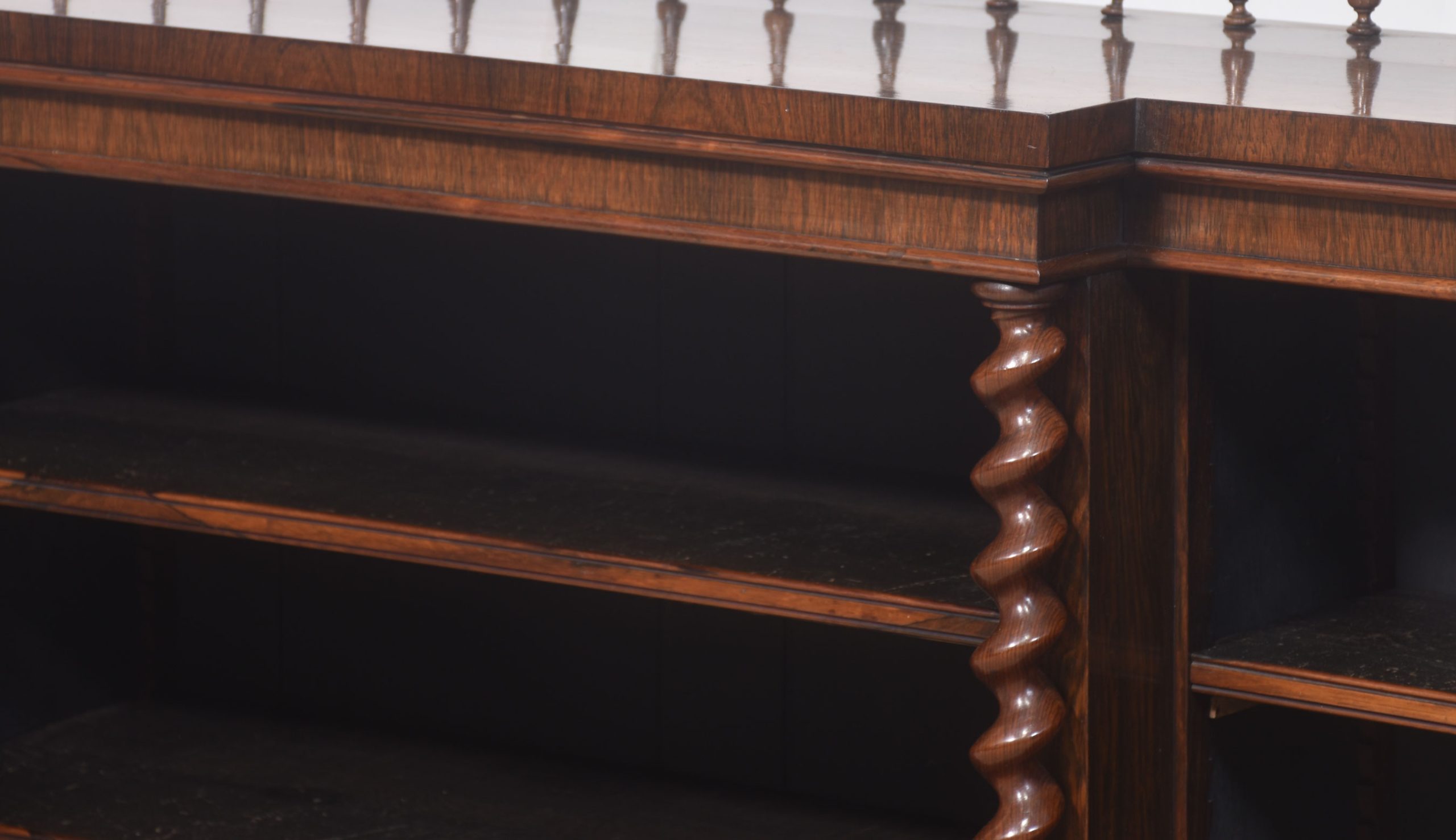 Rosewood open bookcase, the large rectangular breakfront top having raised spindle gallery, above three bays of adjustable shelves, divided by twisting pilasters. All are raised on a plinth base.