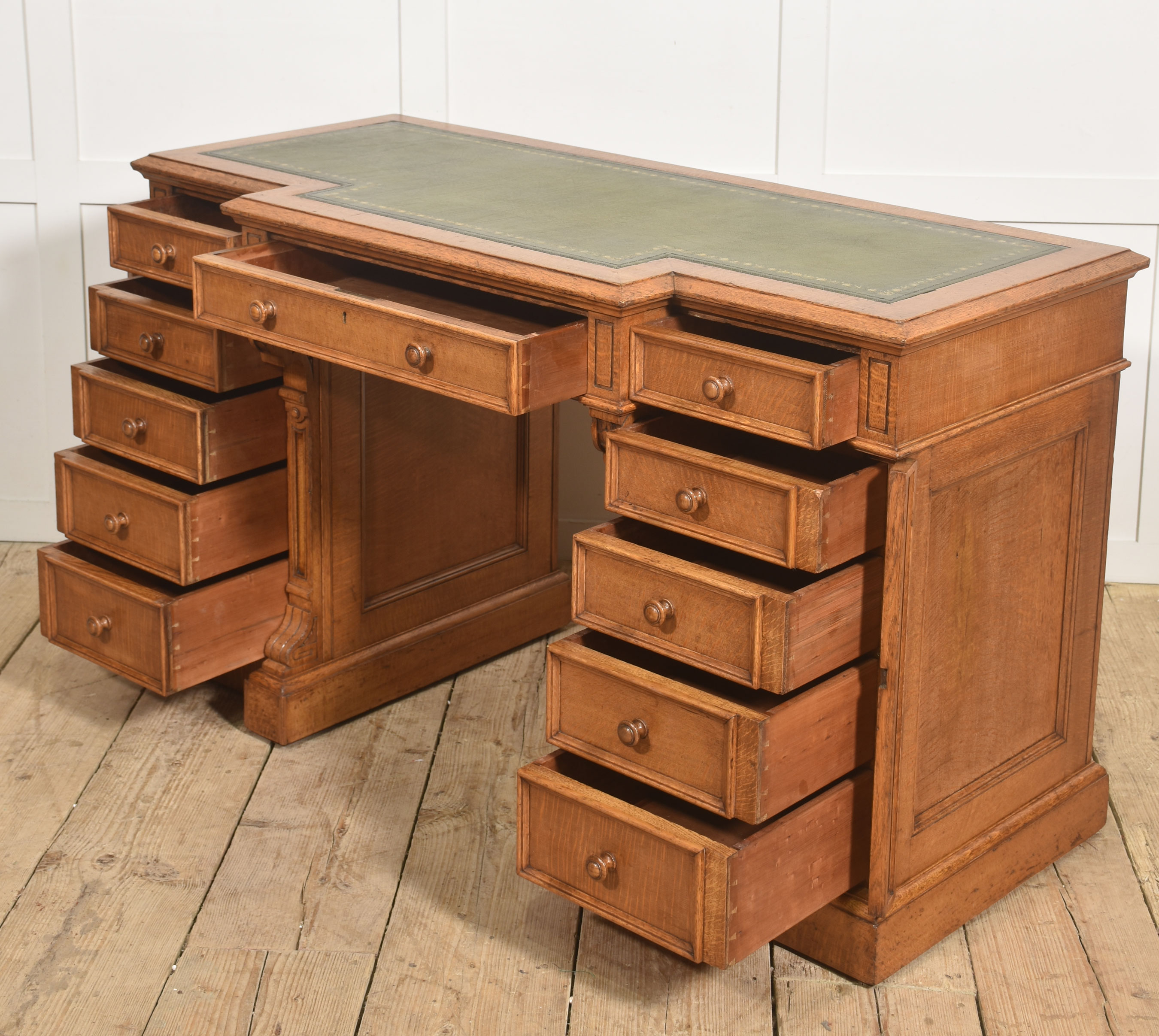A well-proportioned late 19th-century pedestal desk in figured oak, of classic twin-pedestal form and retaining its original configuration. The rectangular top is inset with a gilt-tooled green leather writing surface, shaped with a central breakfront projection to the front edge, providing both visual emphasis and practical working depth.