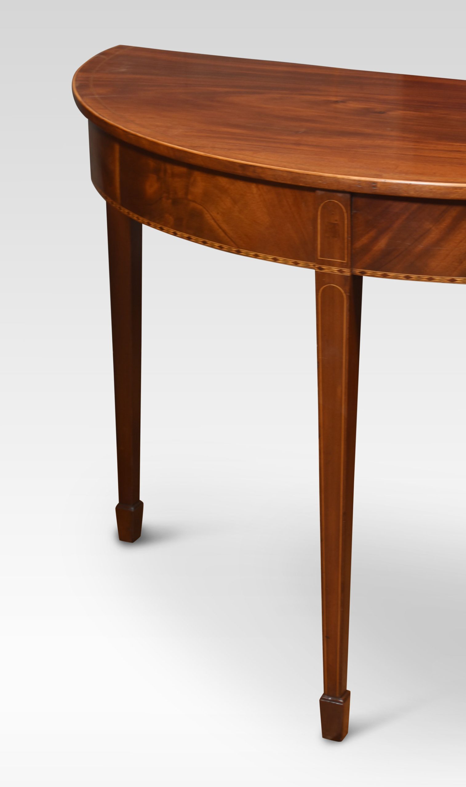 Mahogany inlaid demi-lune dining table or side tables, each with ebony and satinwood stringing, chequered frieze and raised on squared tapered supports and spade feet. One table with rectangular fall flap joining the two.