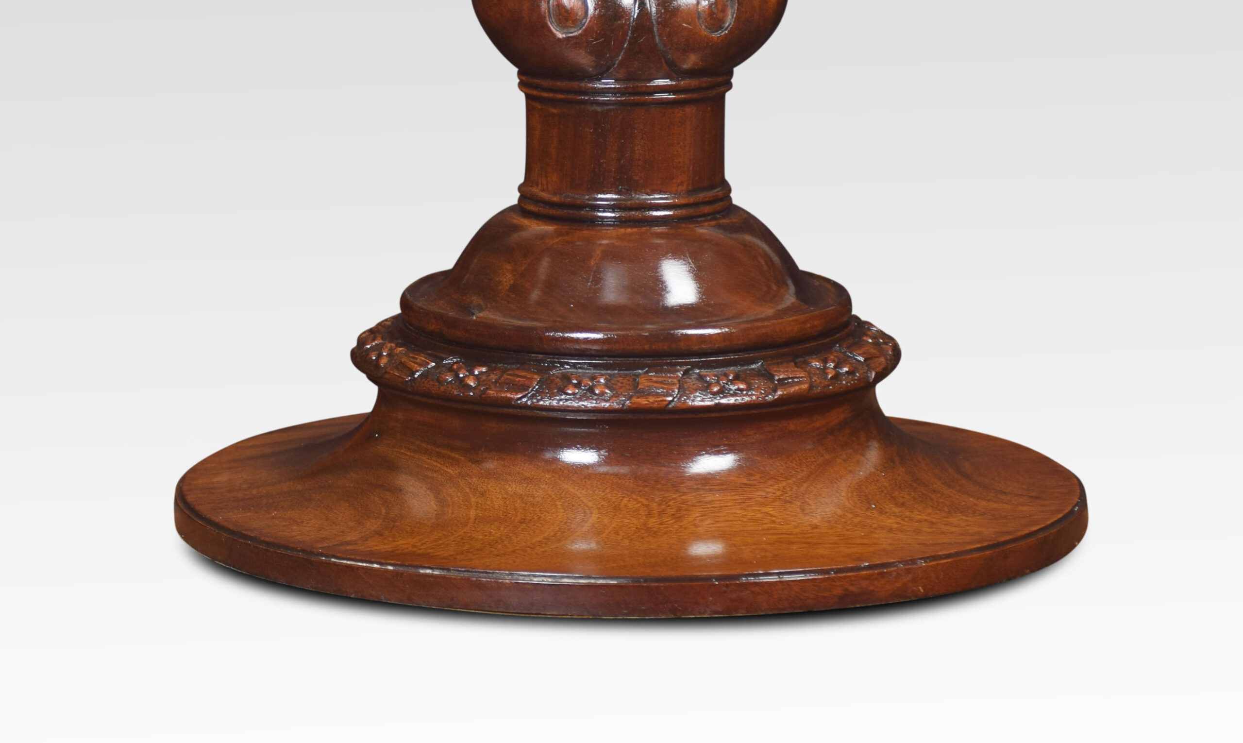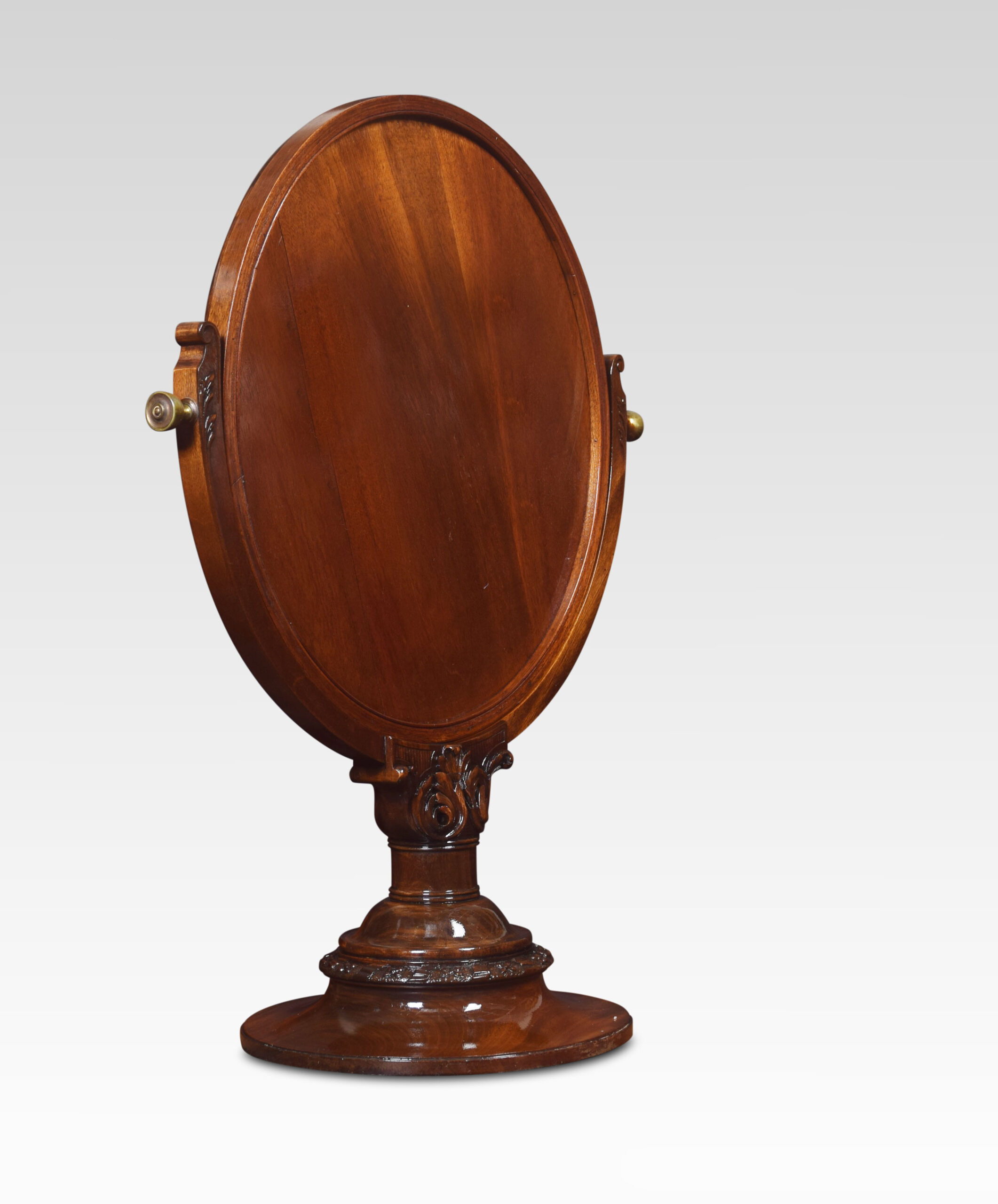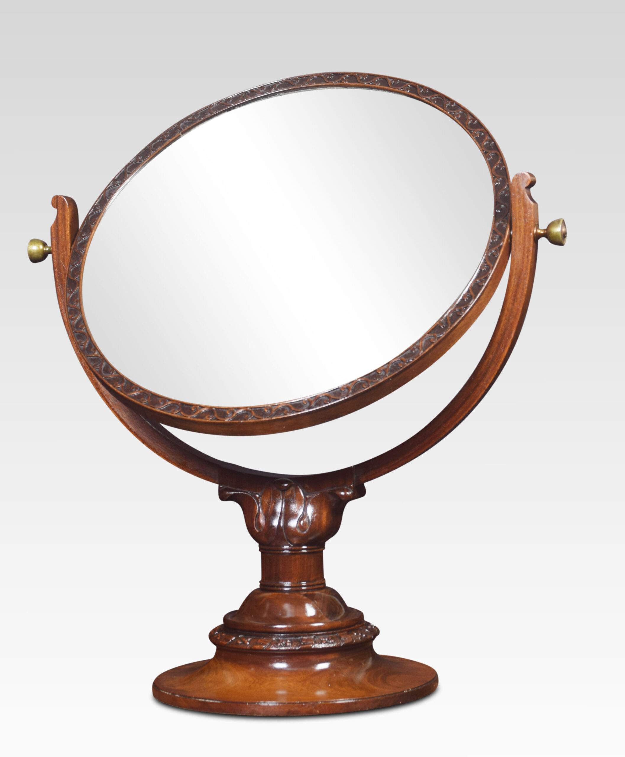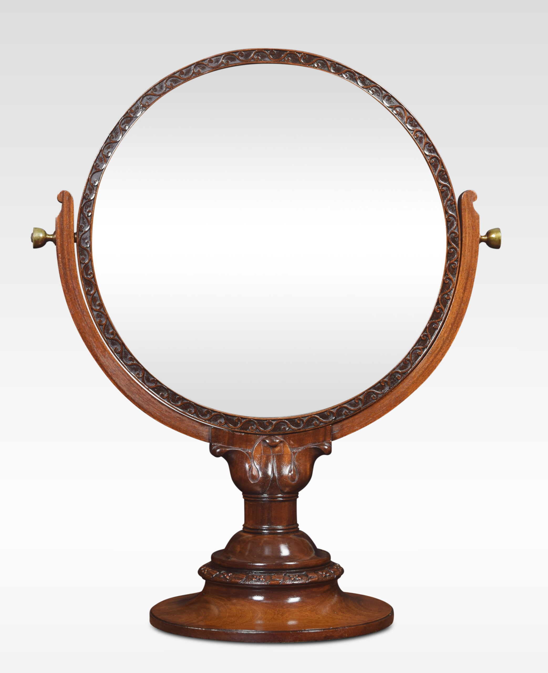 Mahogany shaving/dressing table mirror, with adjustable circular mirror within moulded carved surround over lobed baluster upright, on a circular base.