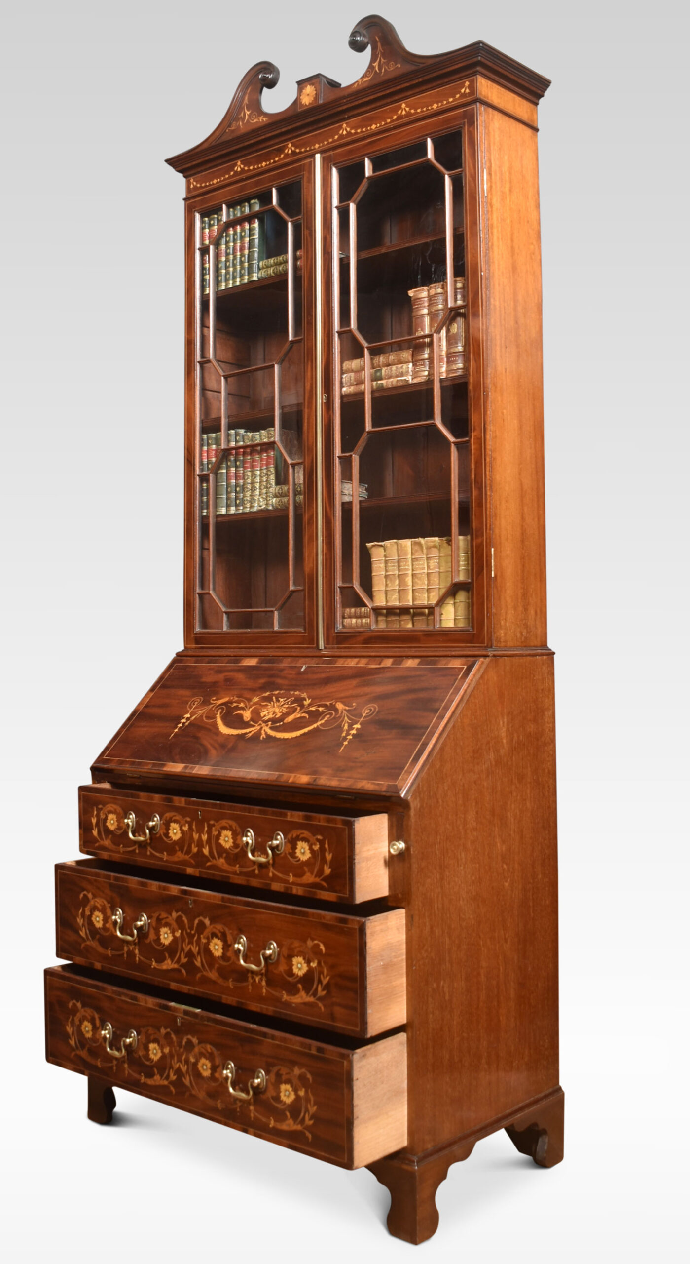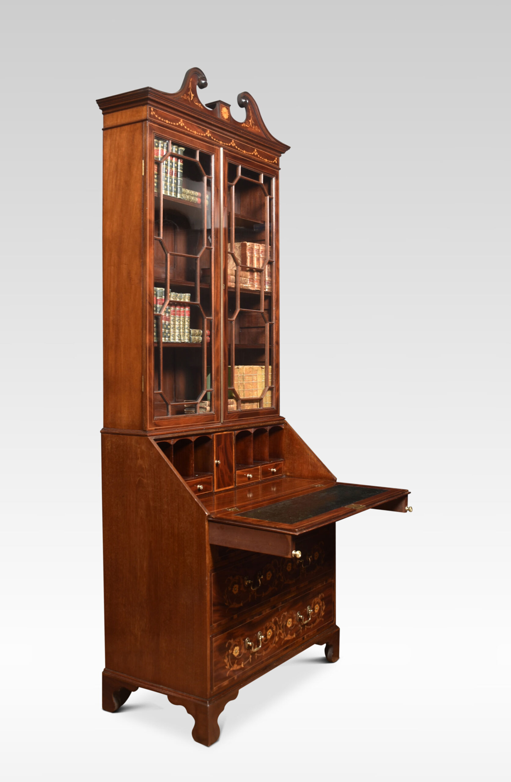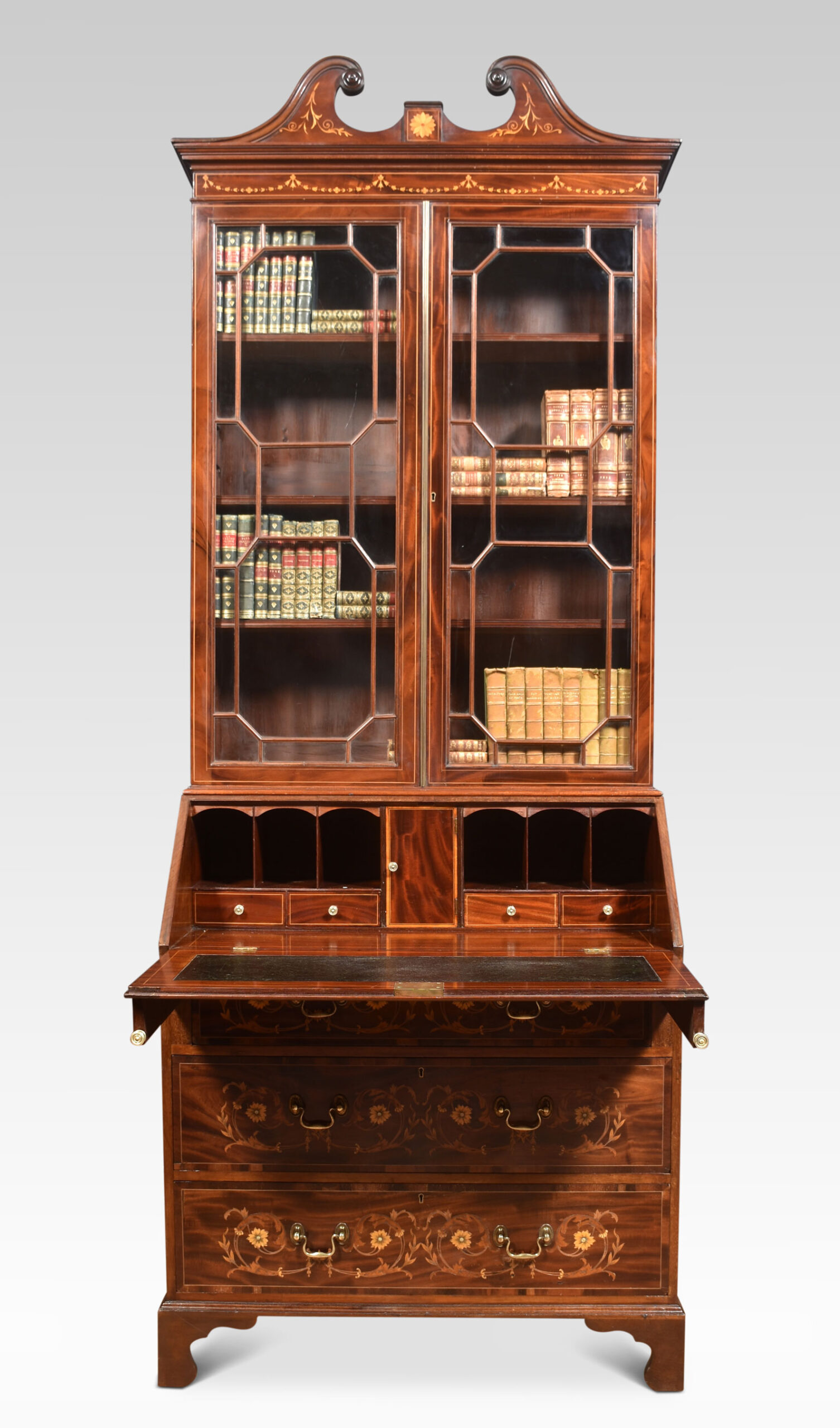 Mahogany bureau bookcase, the raised swan neck inlaid pediment above a pair of glazed doors opening to reveal adjustable shelved interior. To the fall front, profusely inlaid with flowers and swags opening to reveal a fully fitted interior and leather writing surface. Above three long graduated drawers with similar inlaid detail and brass swan neck handles. All raised up on bracket feet.