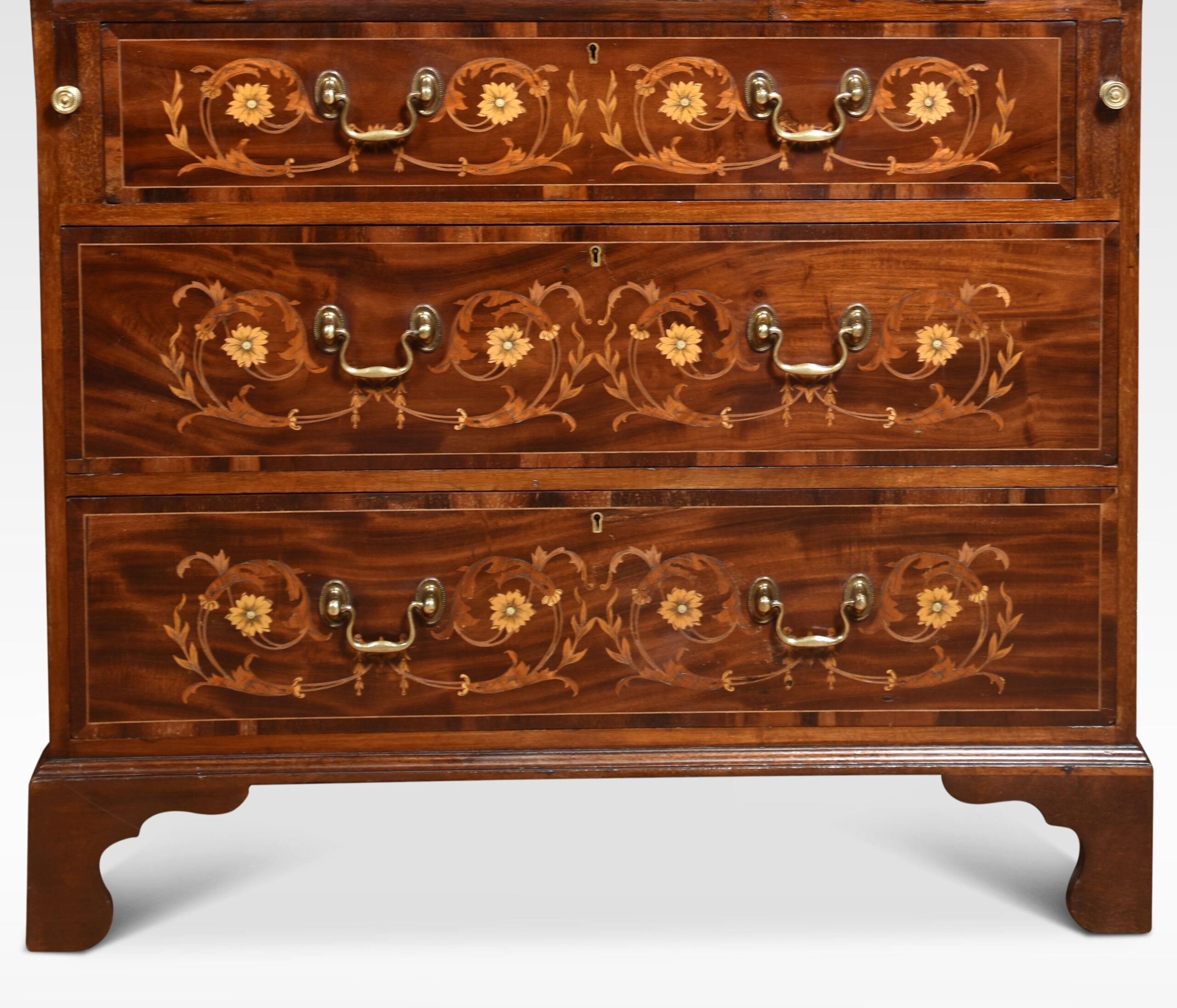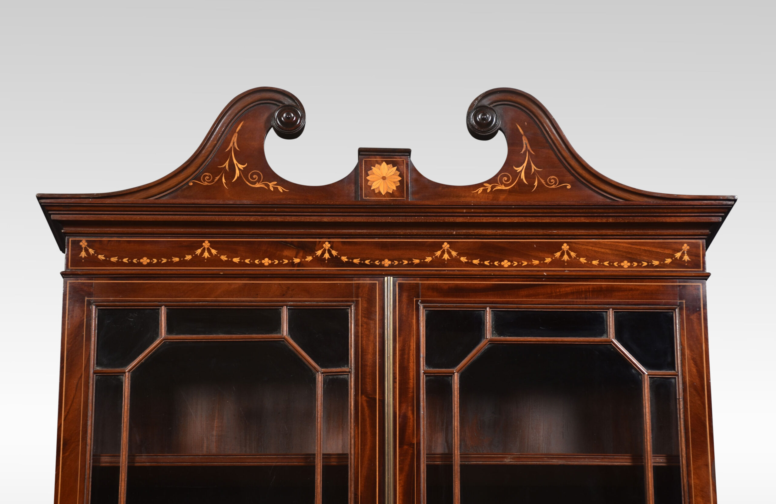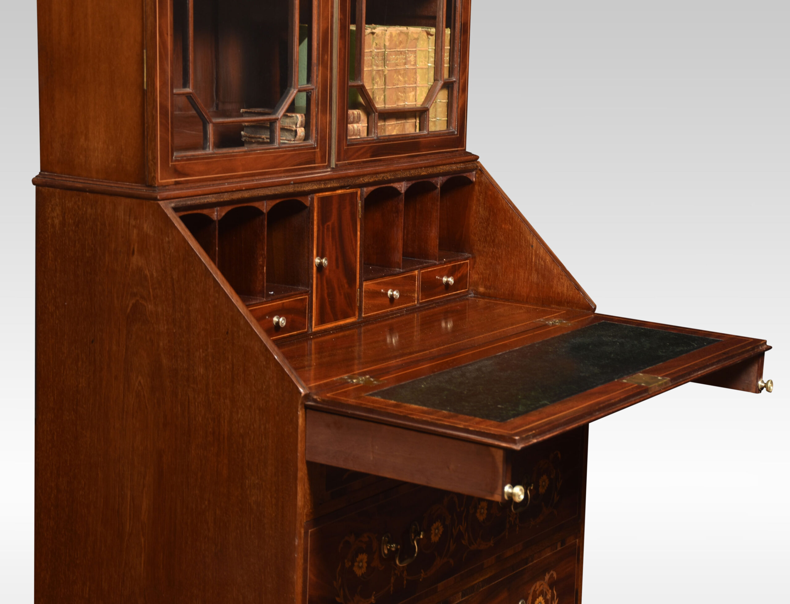 Mahogany bureau bookcase, the raised swan neck inlaid pediment above a pair of glazed doors opening to reveal adjustable shelved interior. To the fall front, profusely inlaid with flowers and swags opening to reveal a fully fitted interior and leather writing surface. Above three long graduated drawers with similar inlaid detail and brass swan neck handles. All raised up on bracket feet.