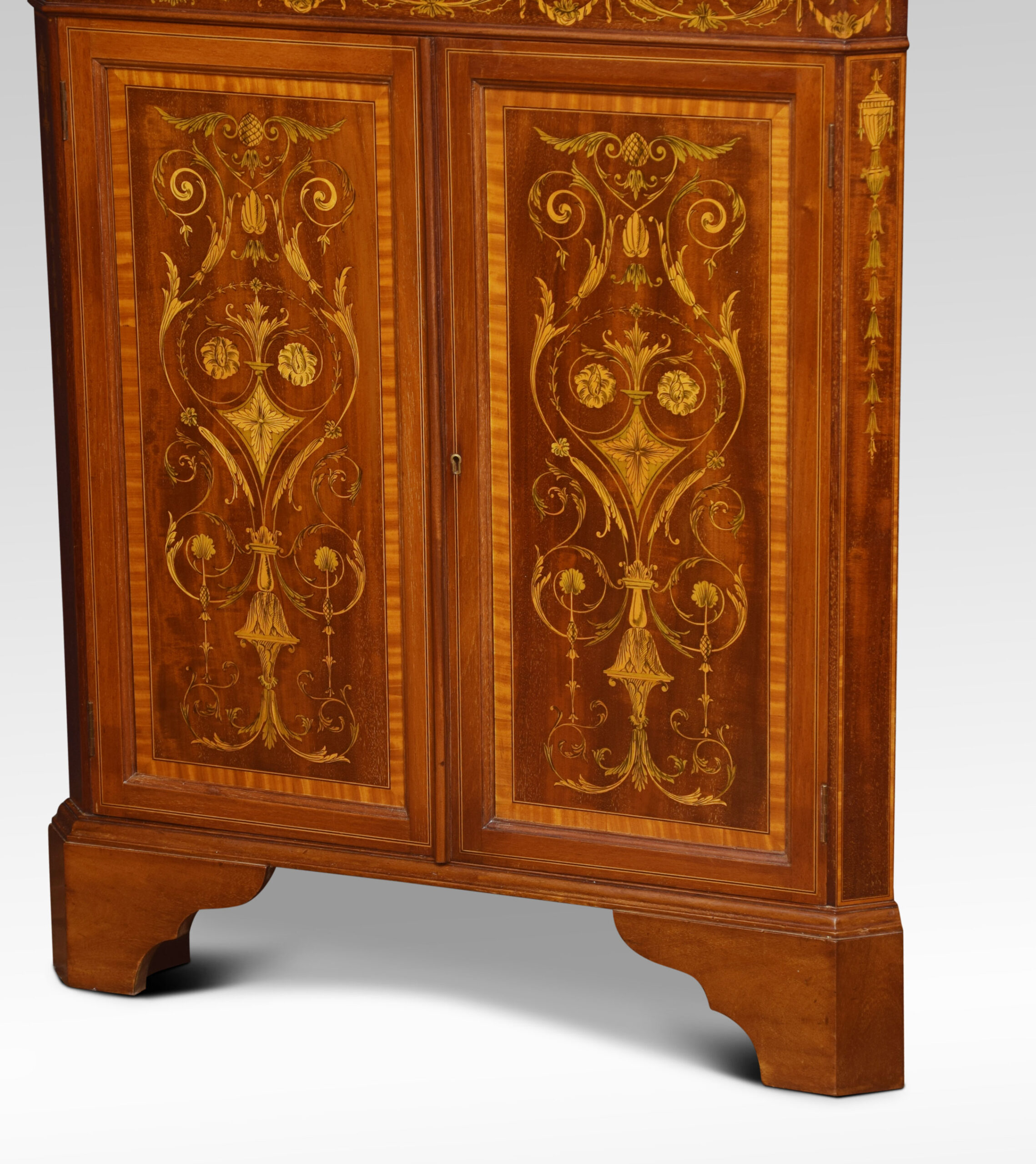 Mahogany, satinwood, and marquetry inlaid corner cabinet, the molded cornice above two glazed doors enclosing two fixed shelves. The lower section with conforming frieze and two cupboard doors elaborately decorated with marquetry panels having scrolling leaves and floral decoration. All raised up on bracket feet.