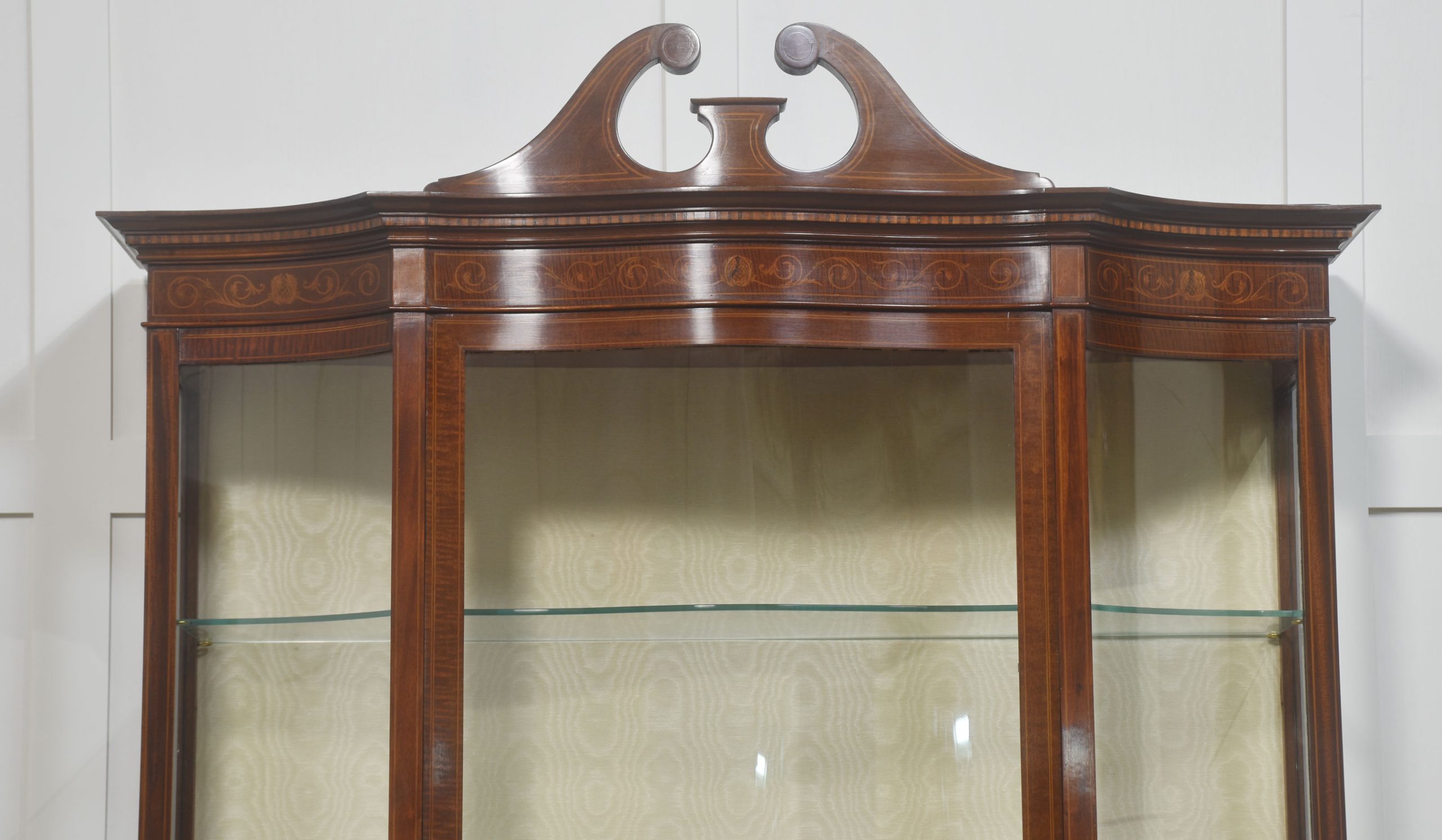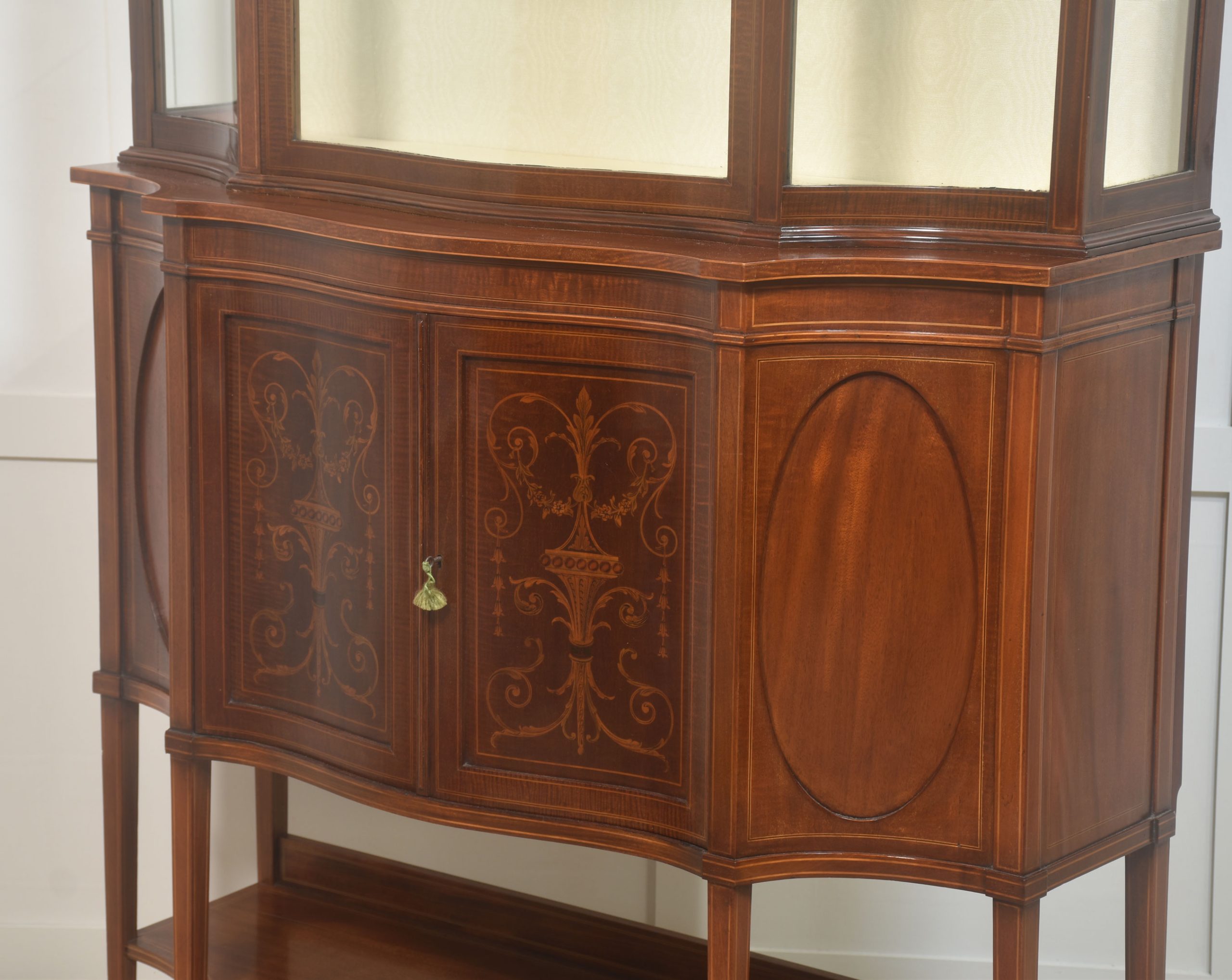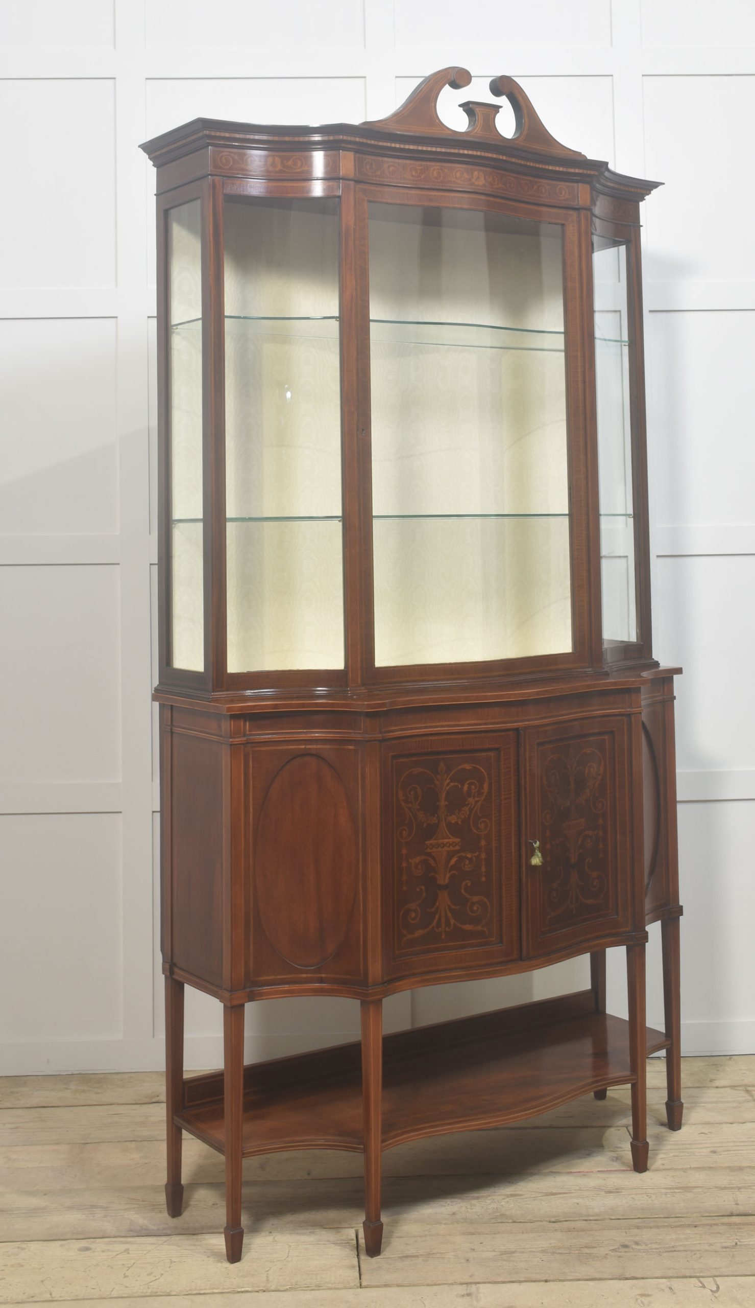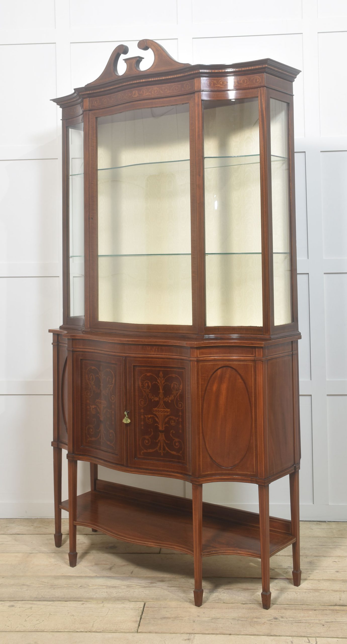Mahogany inlaid display cabinet the swan neck pediment above a pair of glazed doors opening to reveal upholstered silk interior with two glazed shelves. flanked by serpentine ends. To the base section with a pair of paneled doors with floral inlay opening to reveal a large cupboard. All raised up n tapering legs united by undertier.