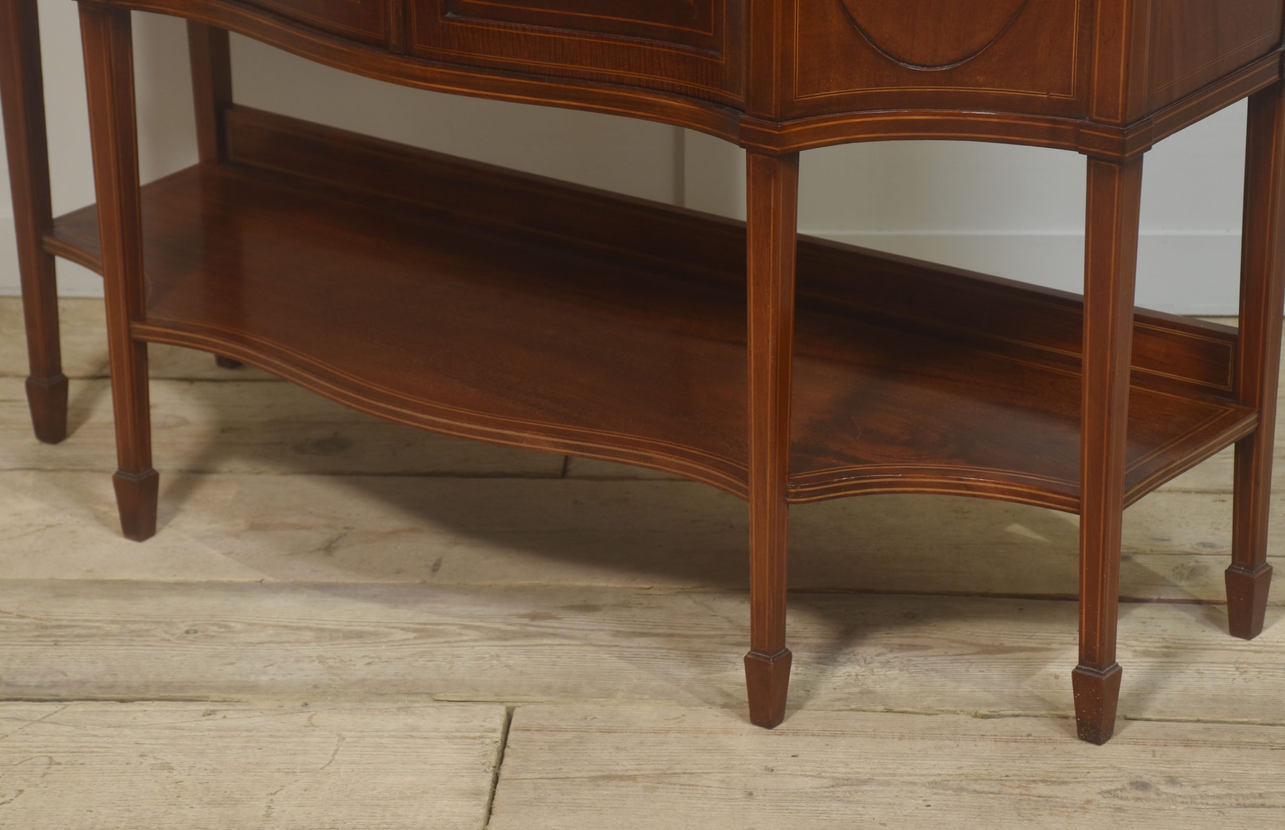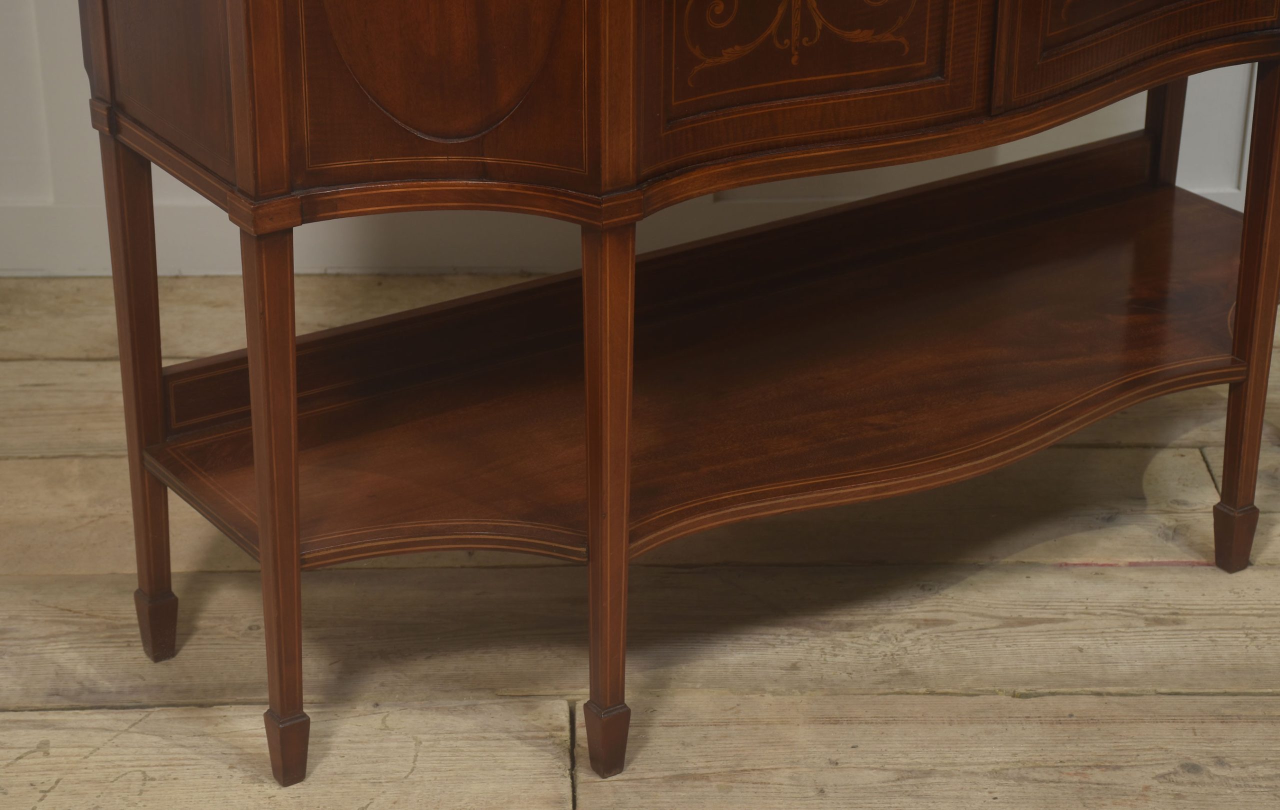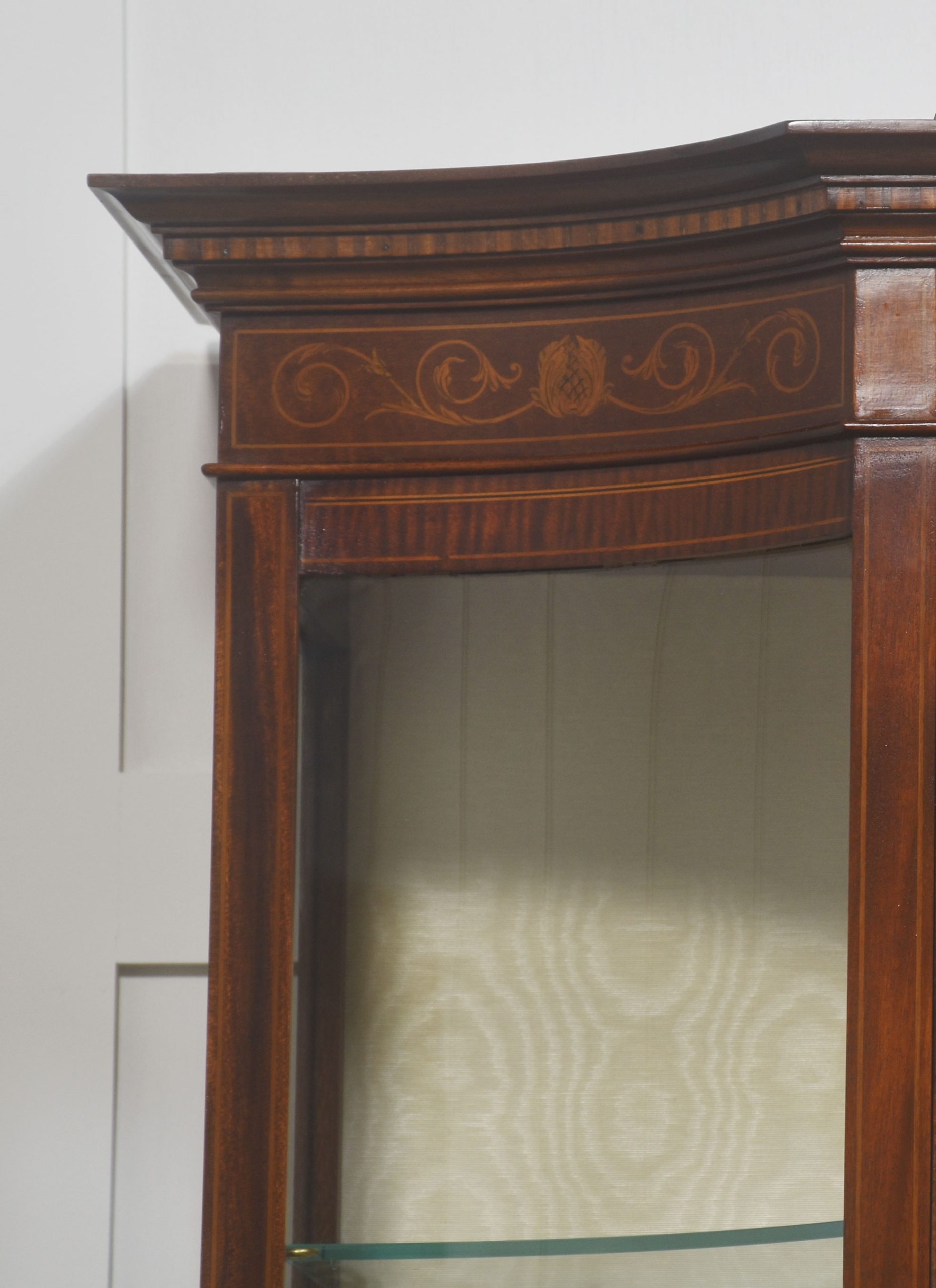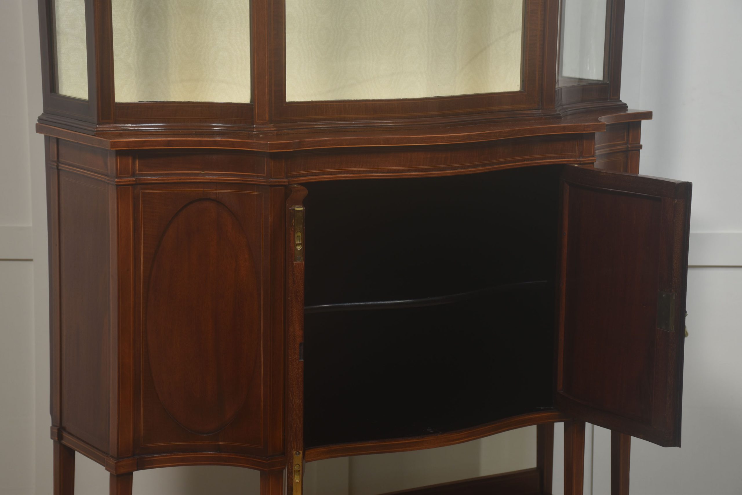Mahogany inlaid display cabinet the swan neck pediment above a pair of glazed doors opening to reveal upholstered silk interior with two glazed shelves. flanked by serpentine ends. To the base section with a pair of paneled doors with floral inlay opening to reveal a large cupboard. All raised up n tapering legs united by undertier.