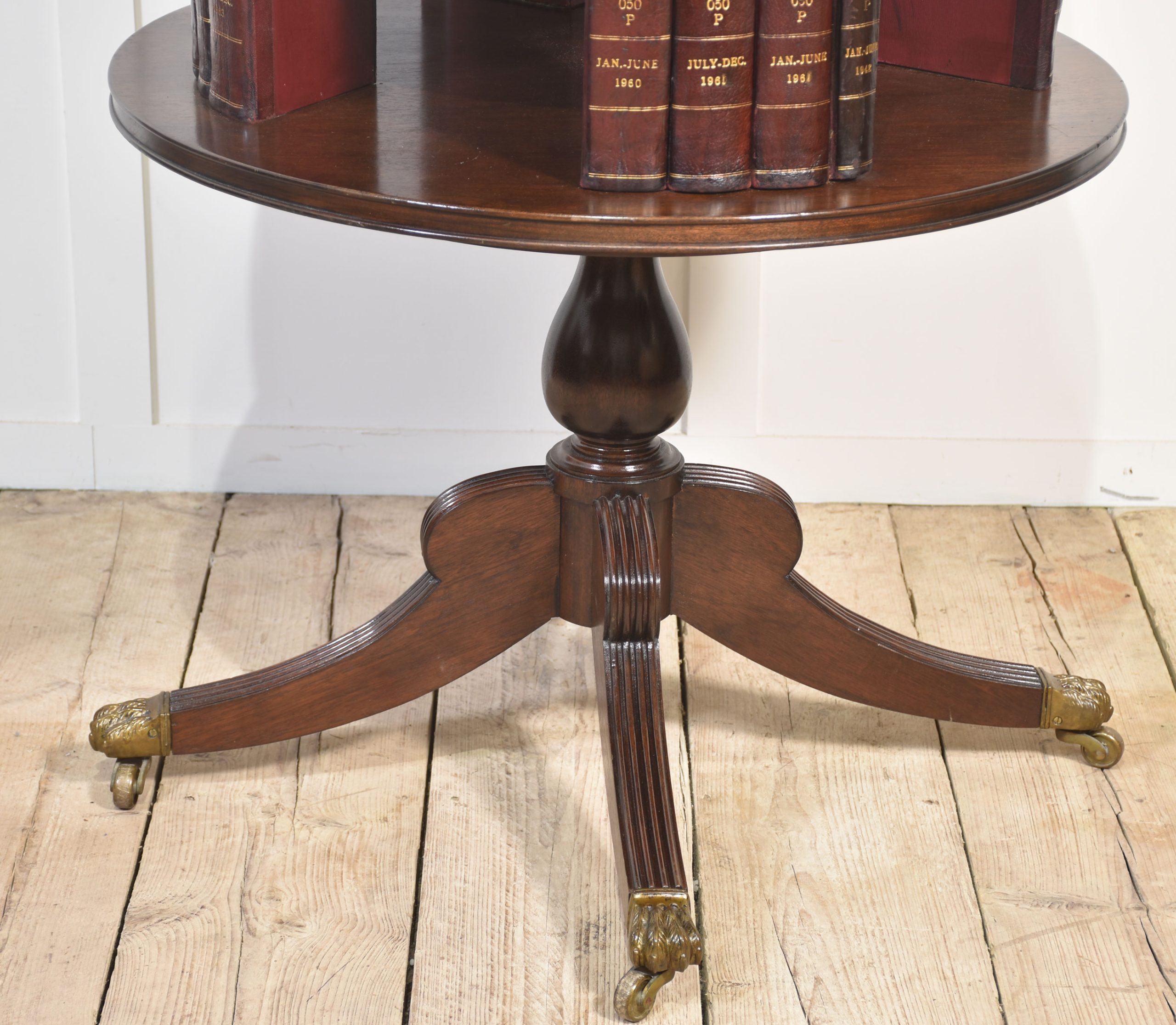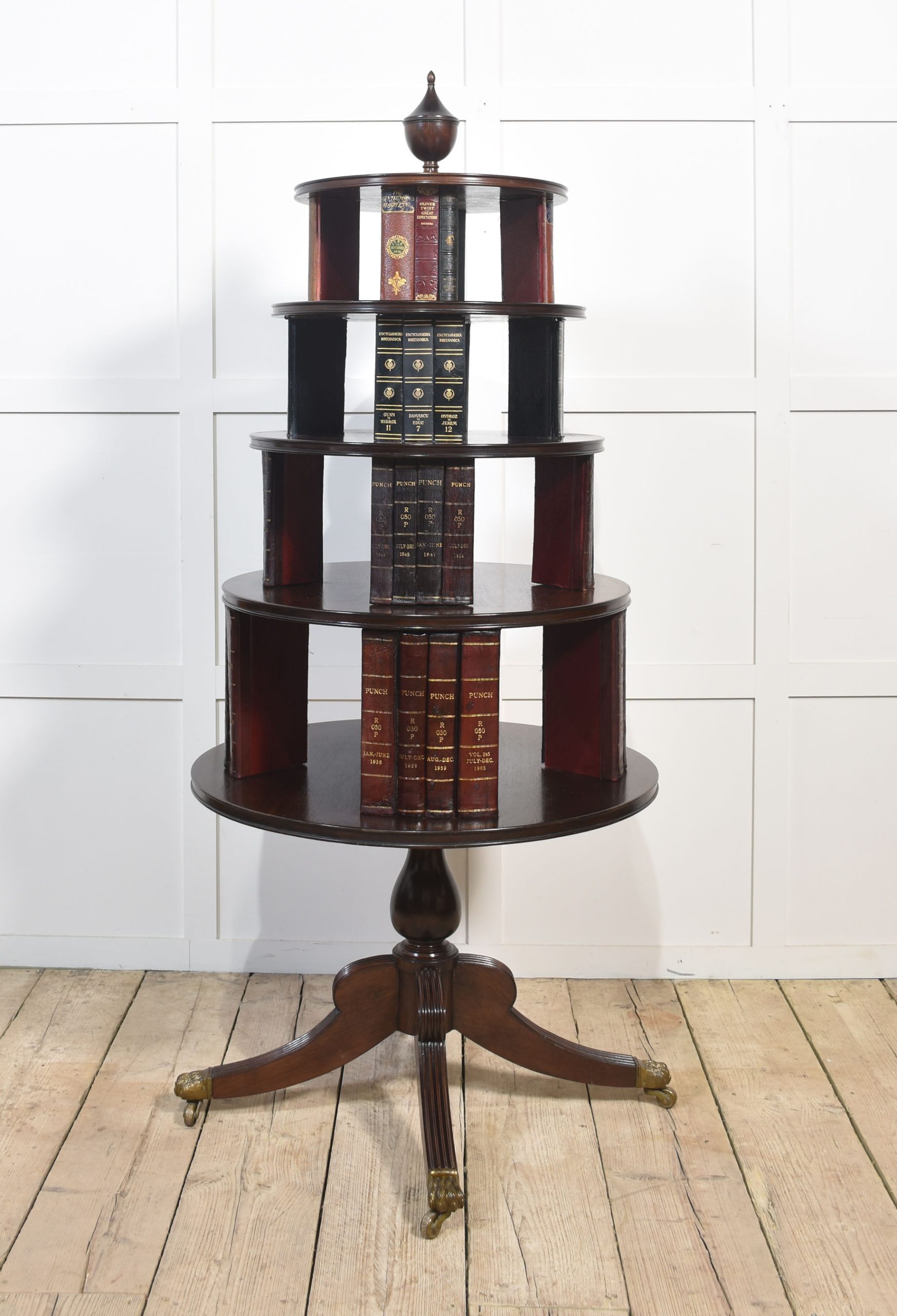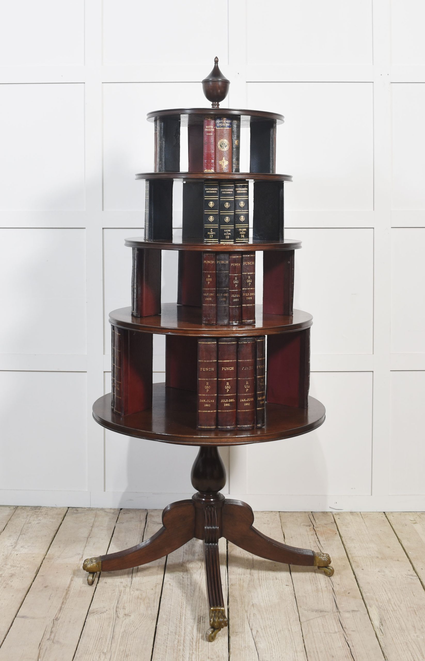 Regency-style mahogany revolving bookcase, the carved finial above four circular tiers fitted with leather-bound faux books. All raised on bulbus stem and four reeded splayed legs. Terminating in paw feet and brass castors.
