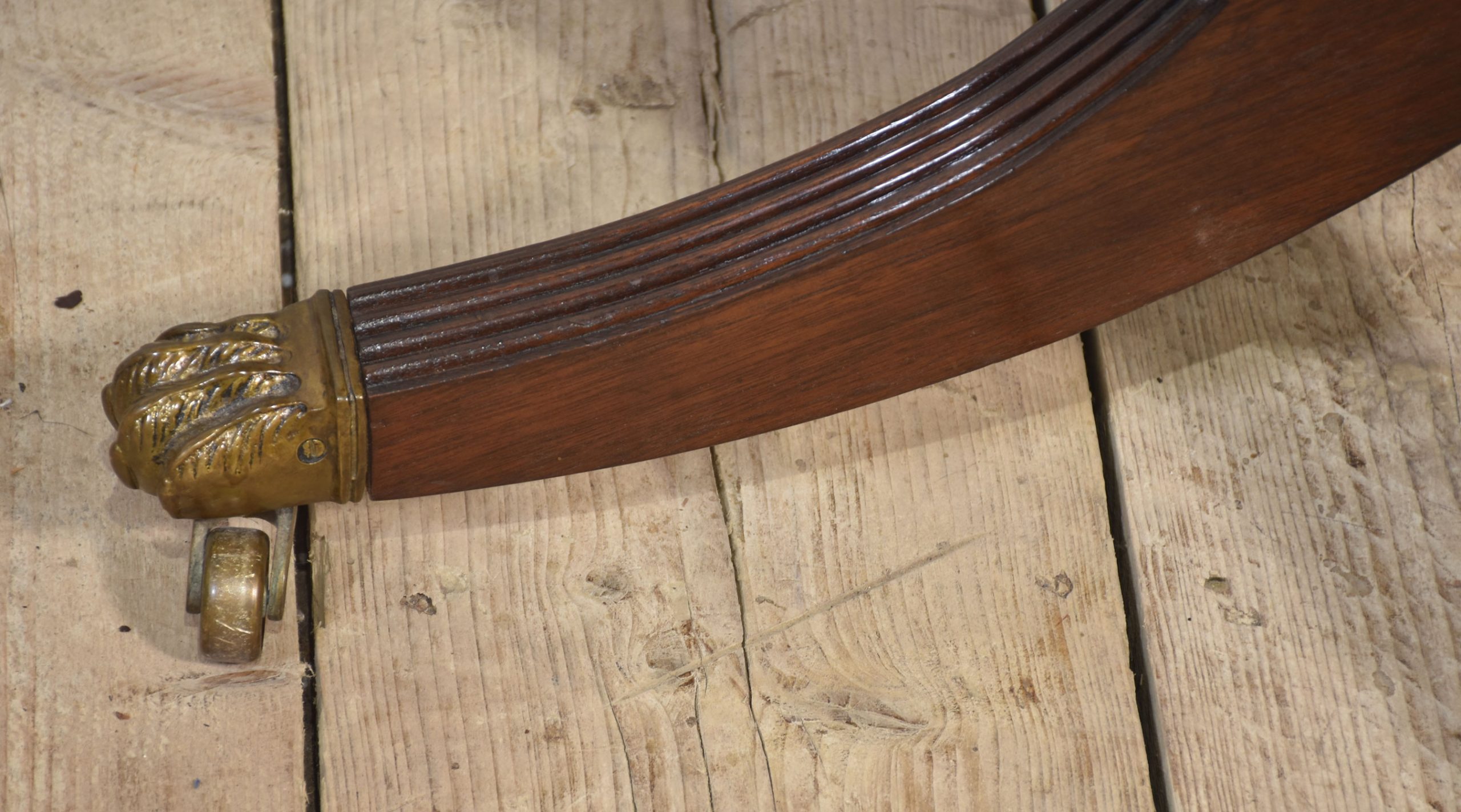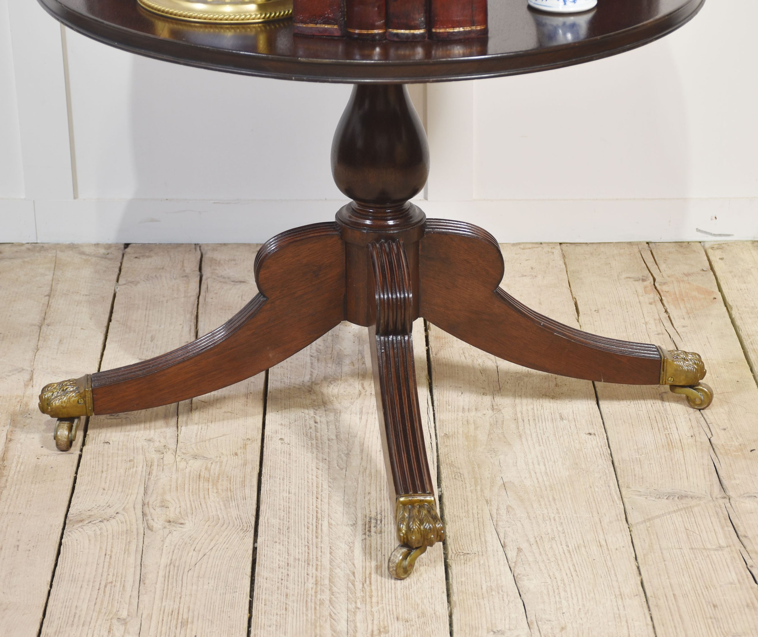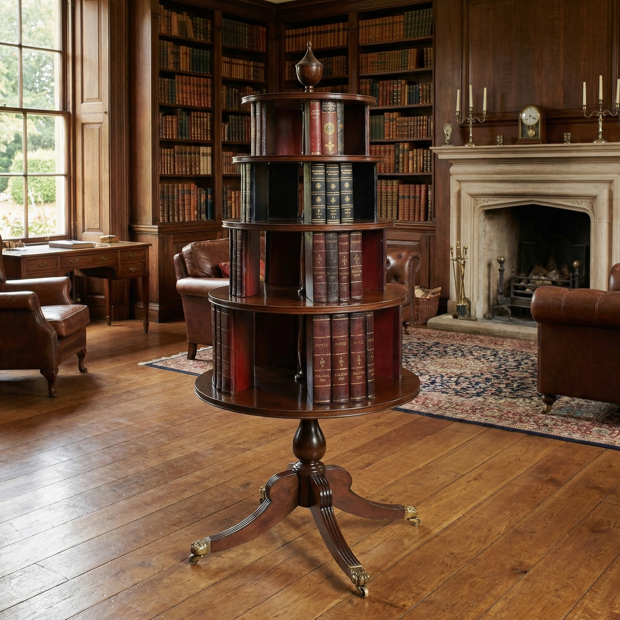 Regency-style mahogany revolving bookcase, the carved finial above four circular tiers fitted with leather-bound faux books. All raised on bulbus stem and four reeded splayed legs. Terminating in paw feet and brass castors.