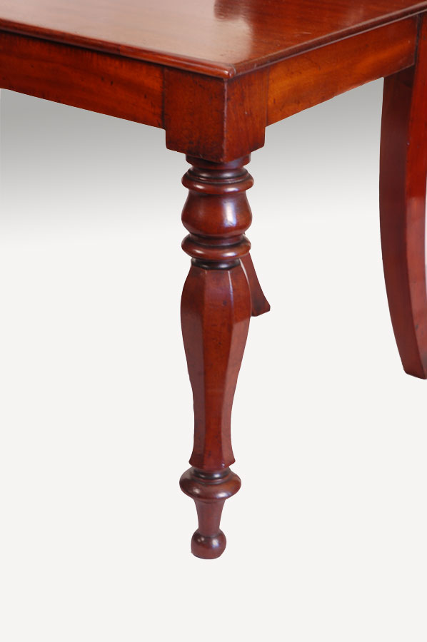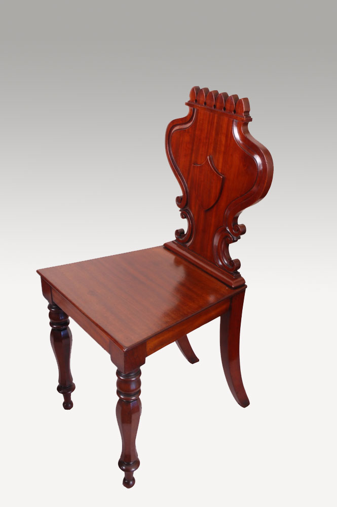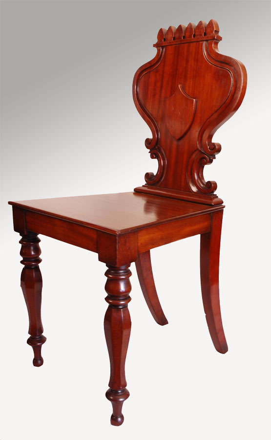 A pair of mahogany hall chairs, having elaborate shield shaped backs, raised on carved turned and fluted front legs