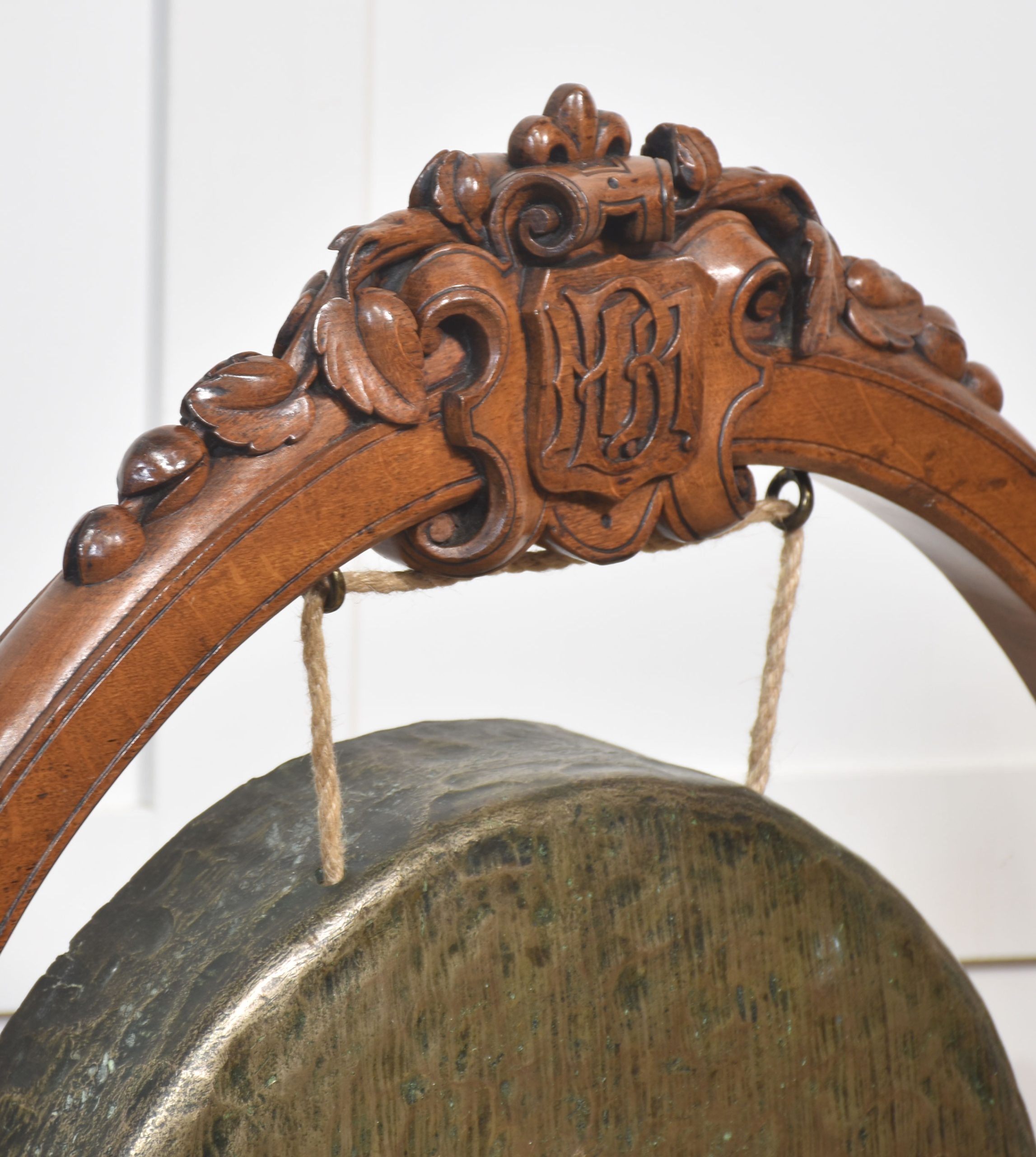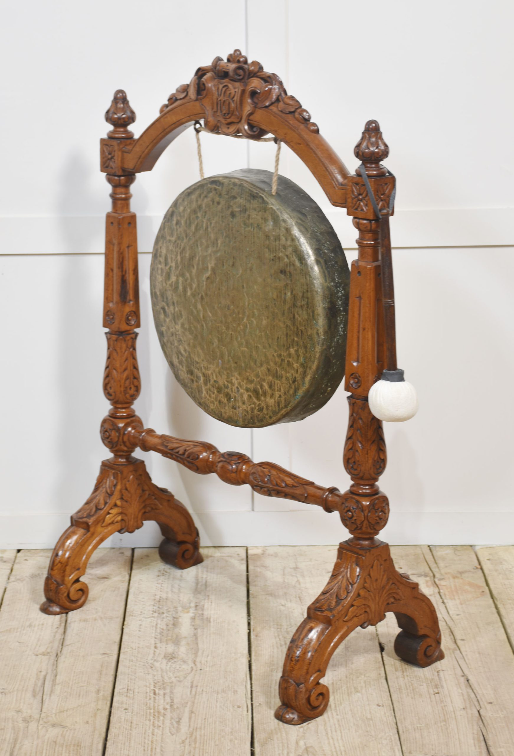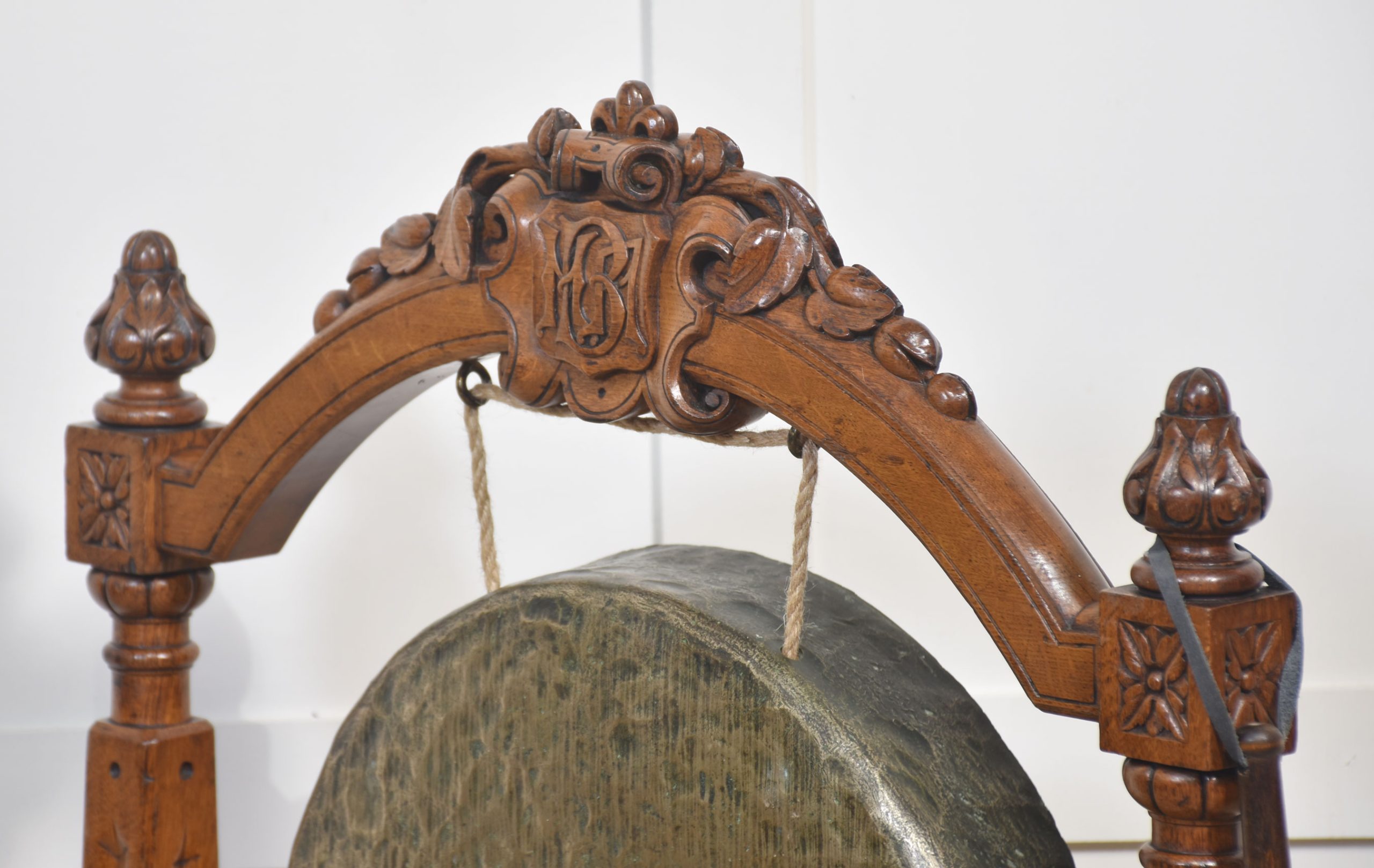 Oak-framed floor-standing diner gong and beater, the carved crest flanked by turned finials raised on carved pillars and turned stretcher below. Raised on scrolling legs.