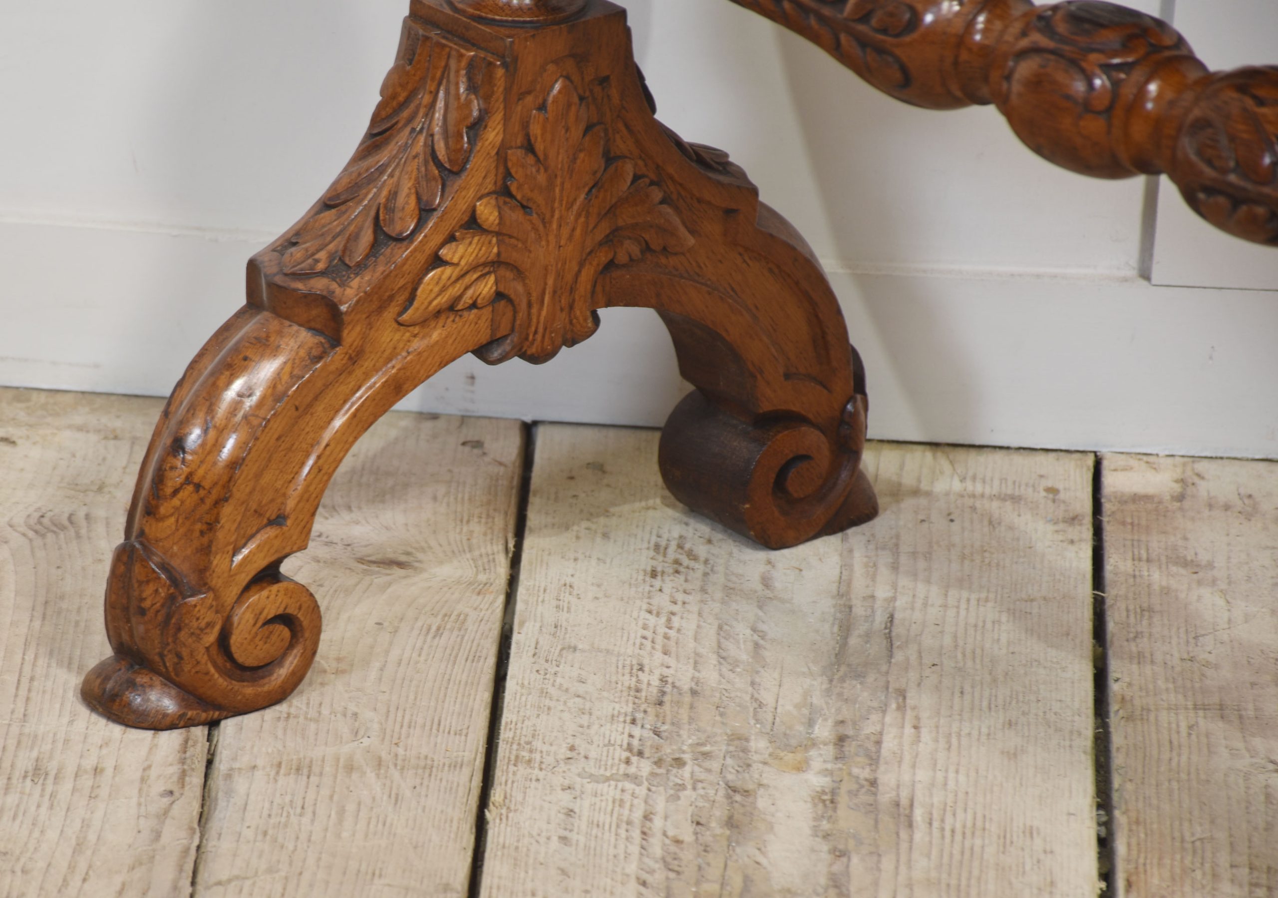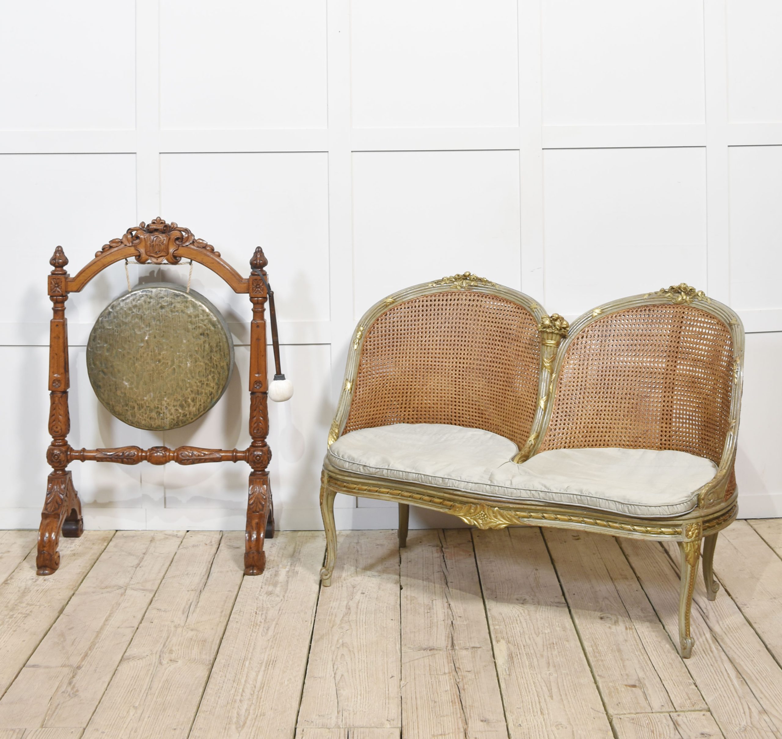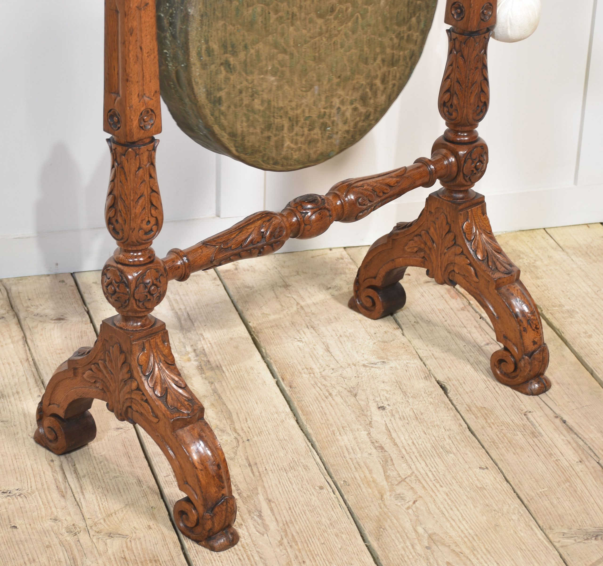 Oak-framed floor-standing diner gong and beater, the carved crest flanked by turned finials raised on carved pillars and turned stretcher below. Raised on scrolling legs.