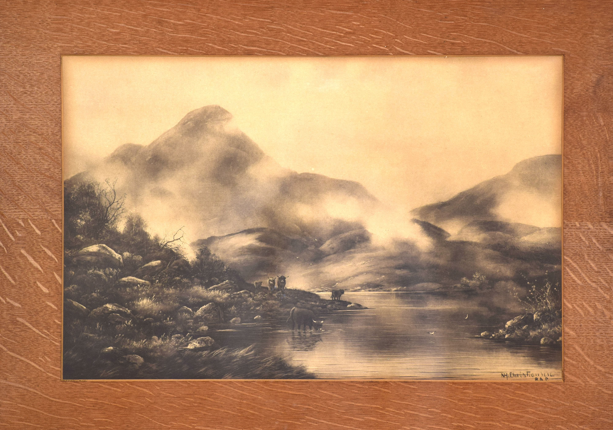 Oak framed etching depicting cattle in a rural landscape signed N H Christionsul.