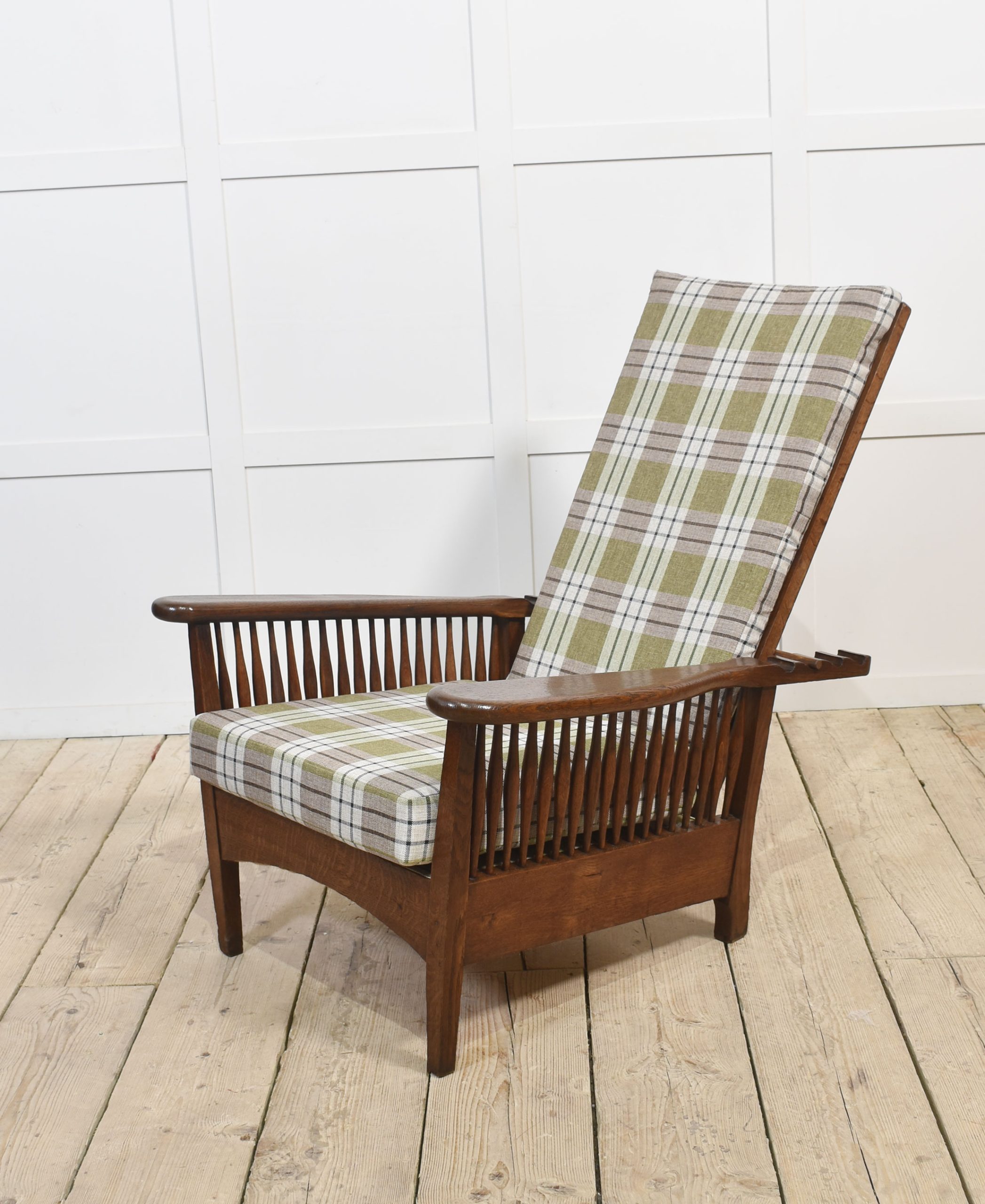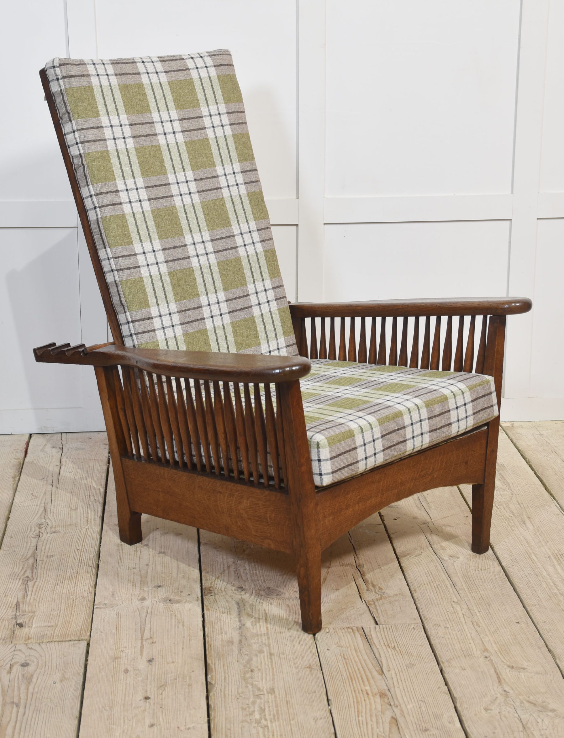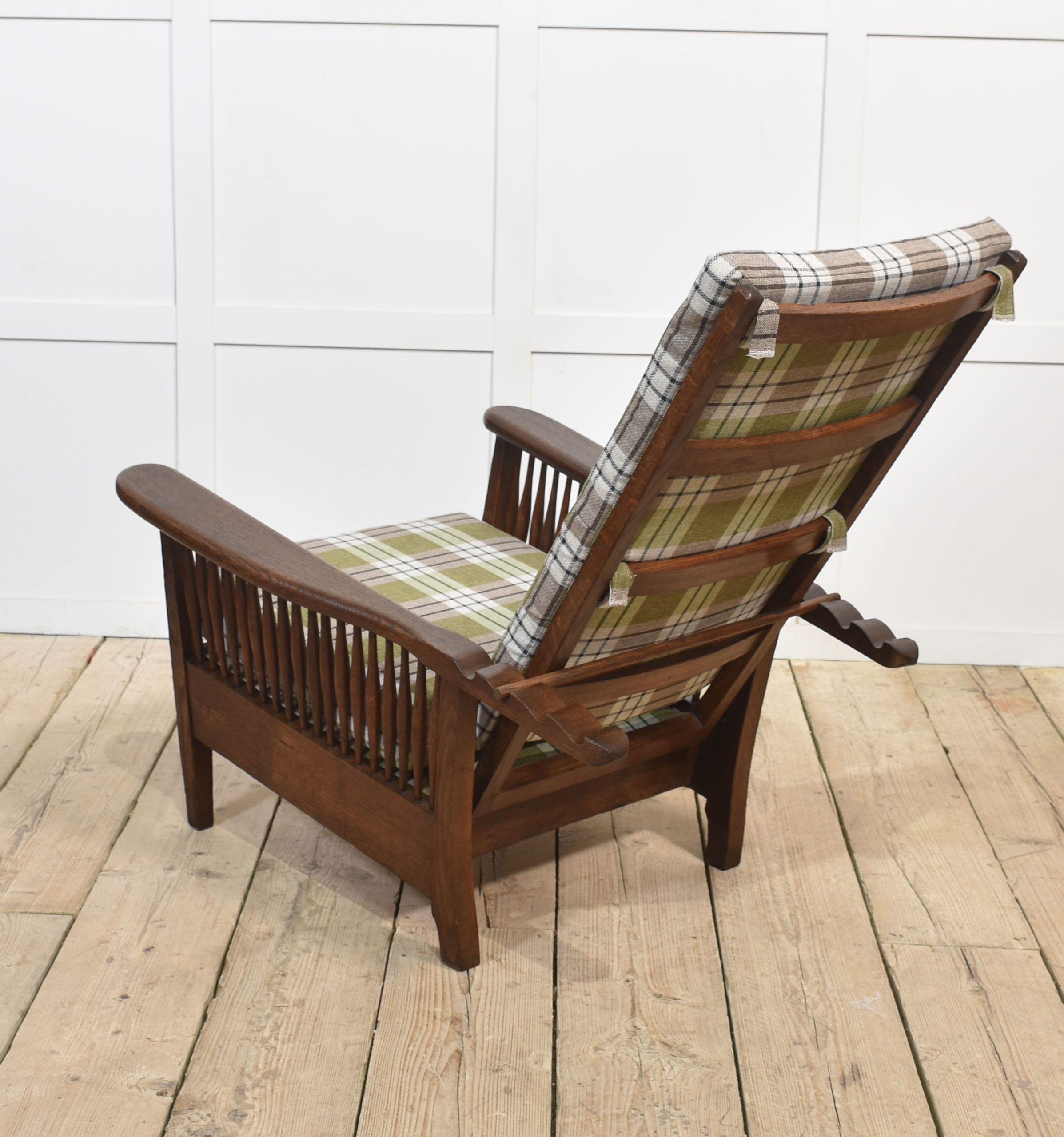 Early 20th-century oak reclining armchair with adjustable ladder back, elongated arms and spindle sides to the removable upholstered cushions. All raised on square supports.