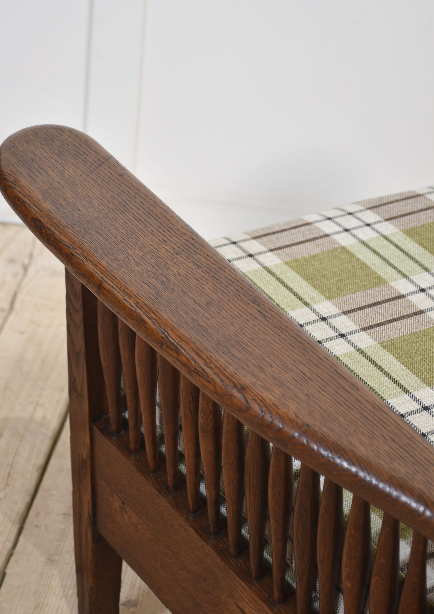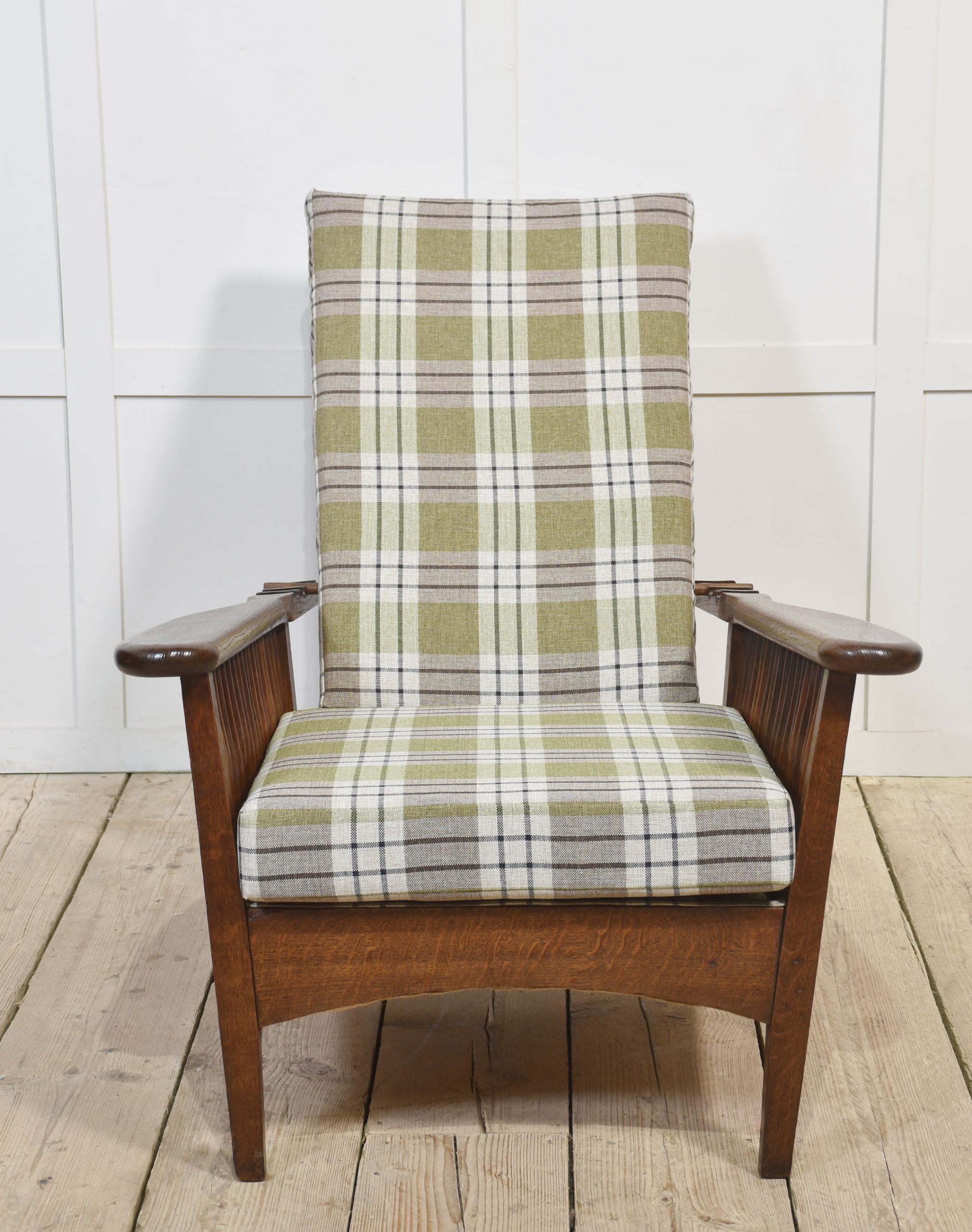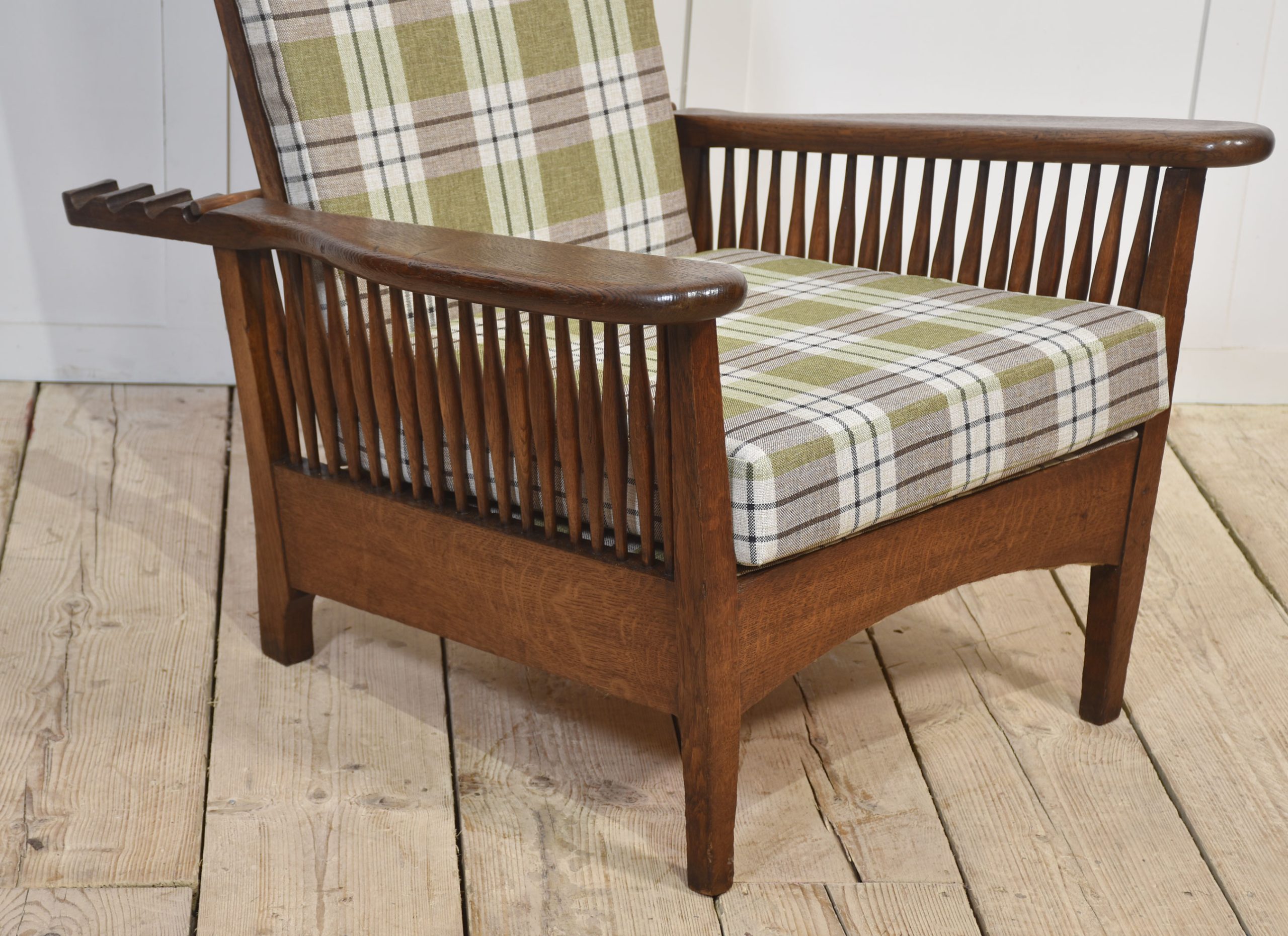 Early 20th-century oak reclining armchair with adjustable ladder back, elongated arms and spindle sides to the removable upholstered cushions. All raised on square supports.