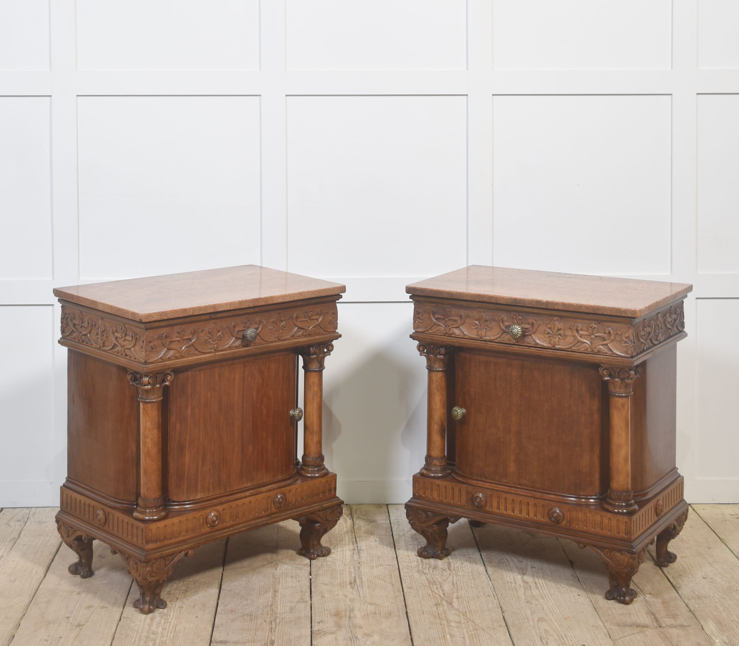 The cabinets are raised on a moulded and reeded plinth base, enriched with applied rosette motifs and standing on boldly carved, scrolled feet with floral detailing. The marble tops provide a durable and elegant surface, offering contrast to the warm mahogany below and making the cabinets suitable for lamps or decorative objects.