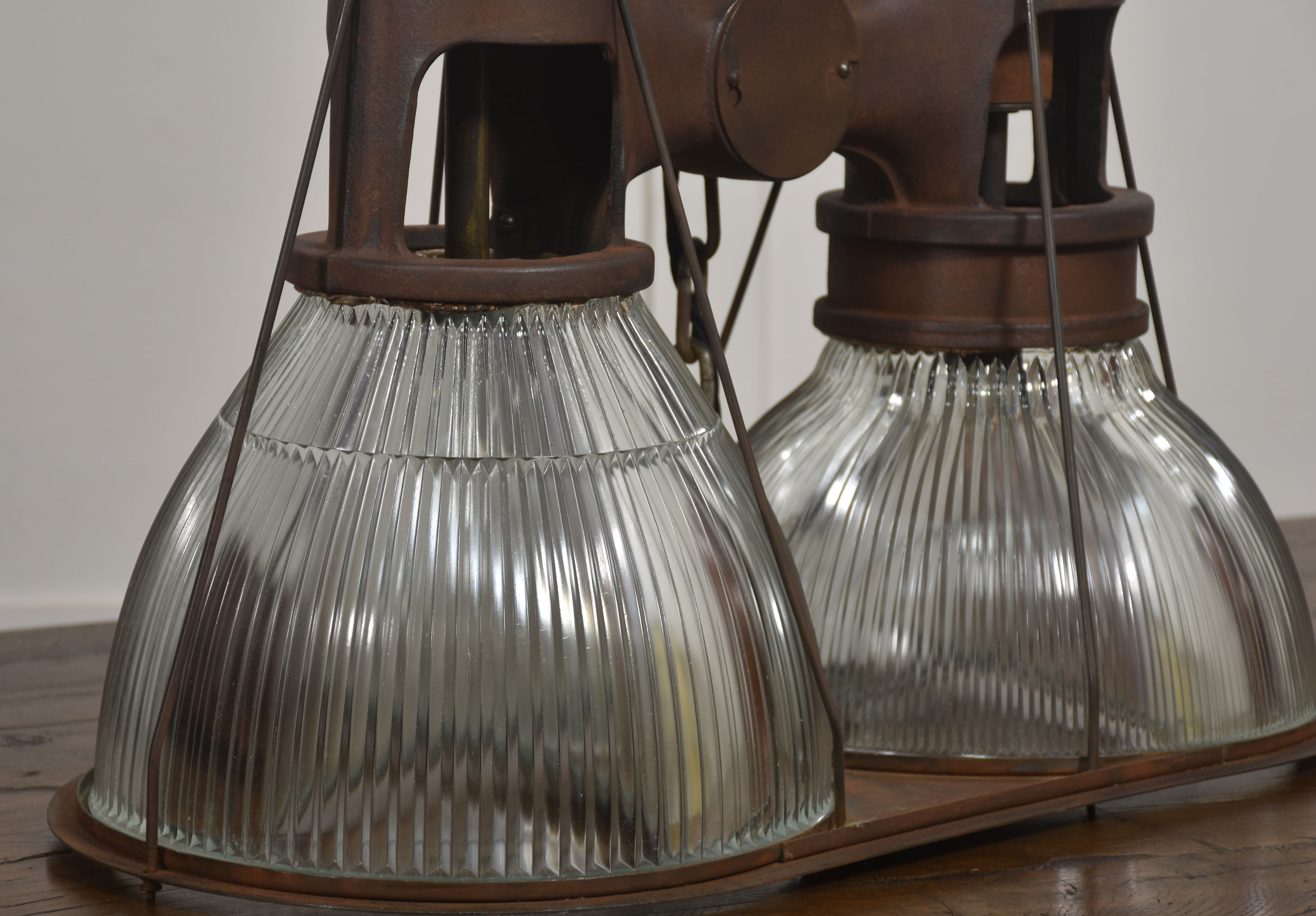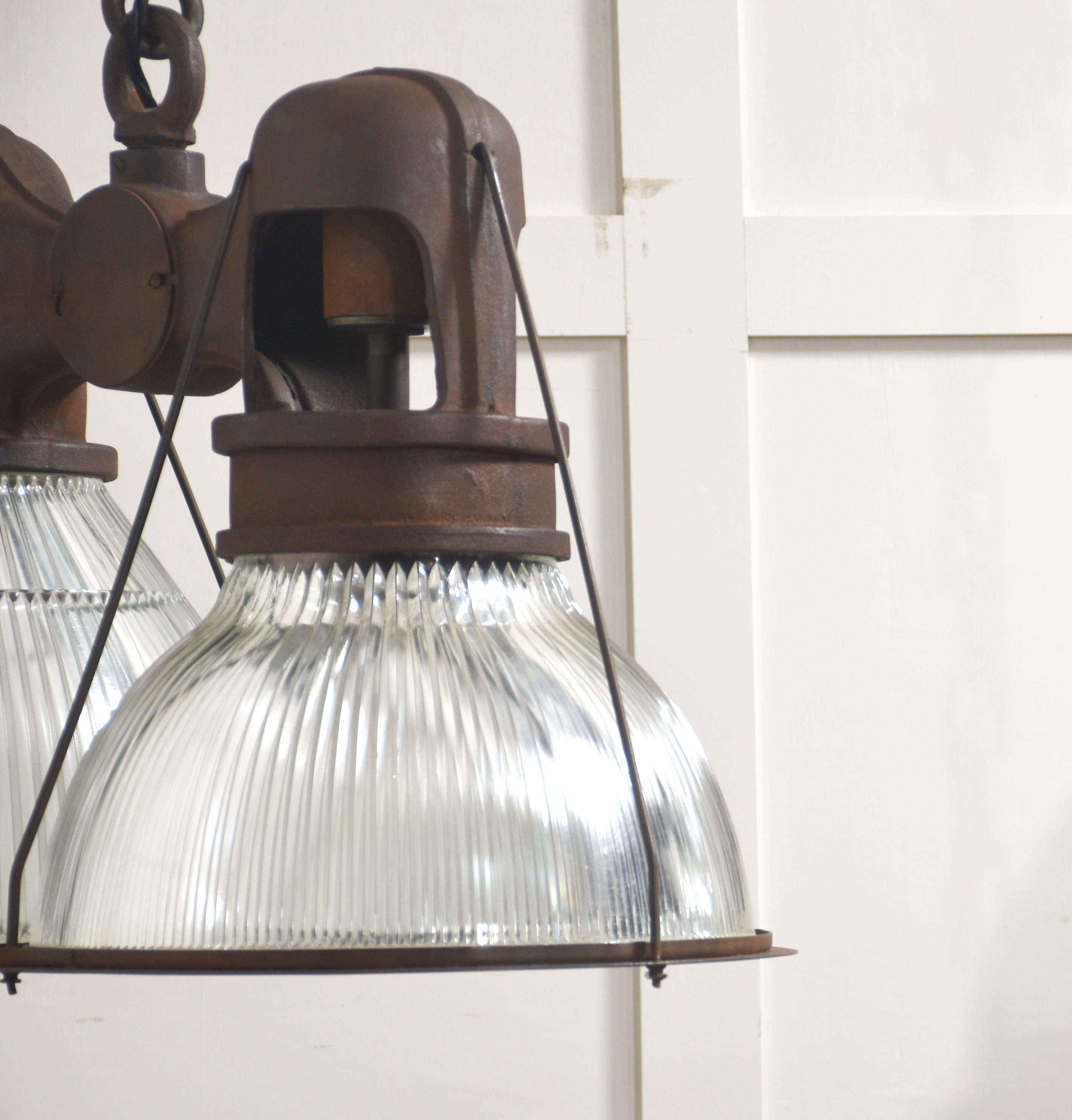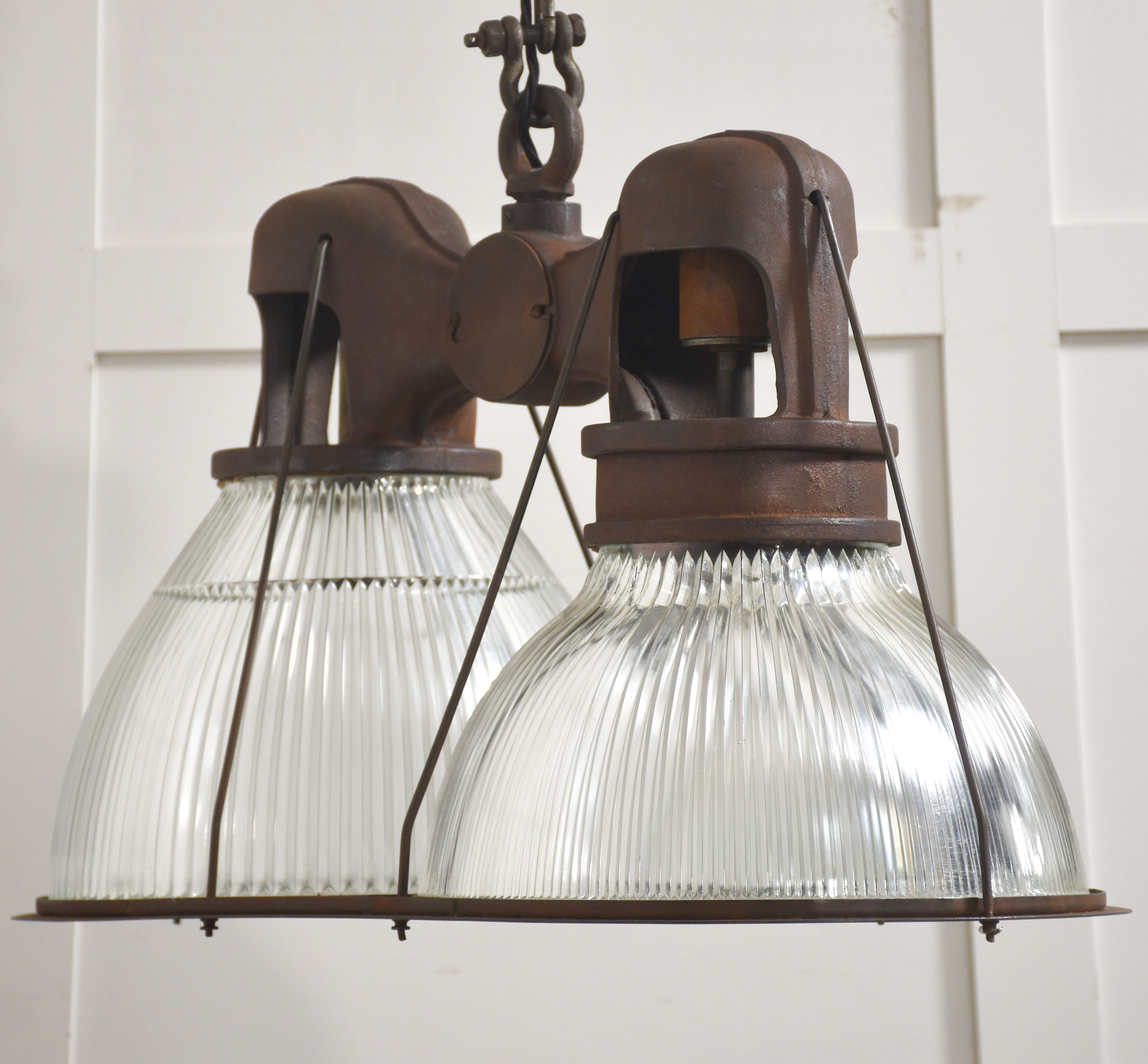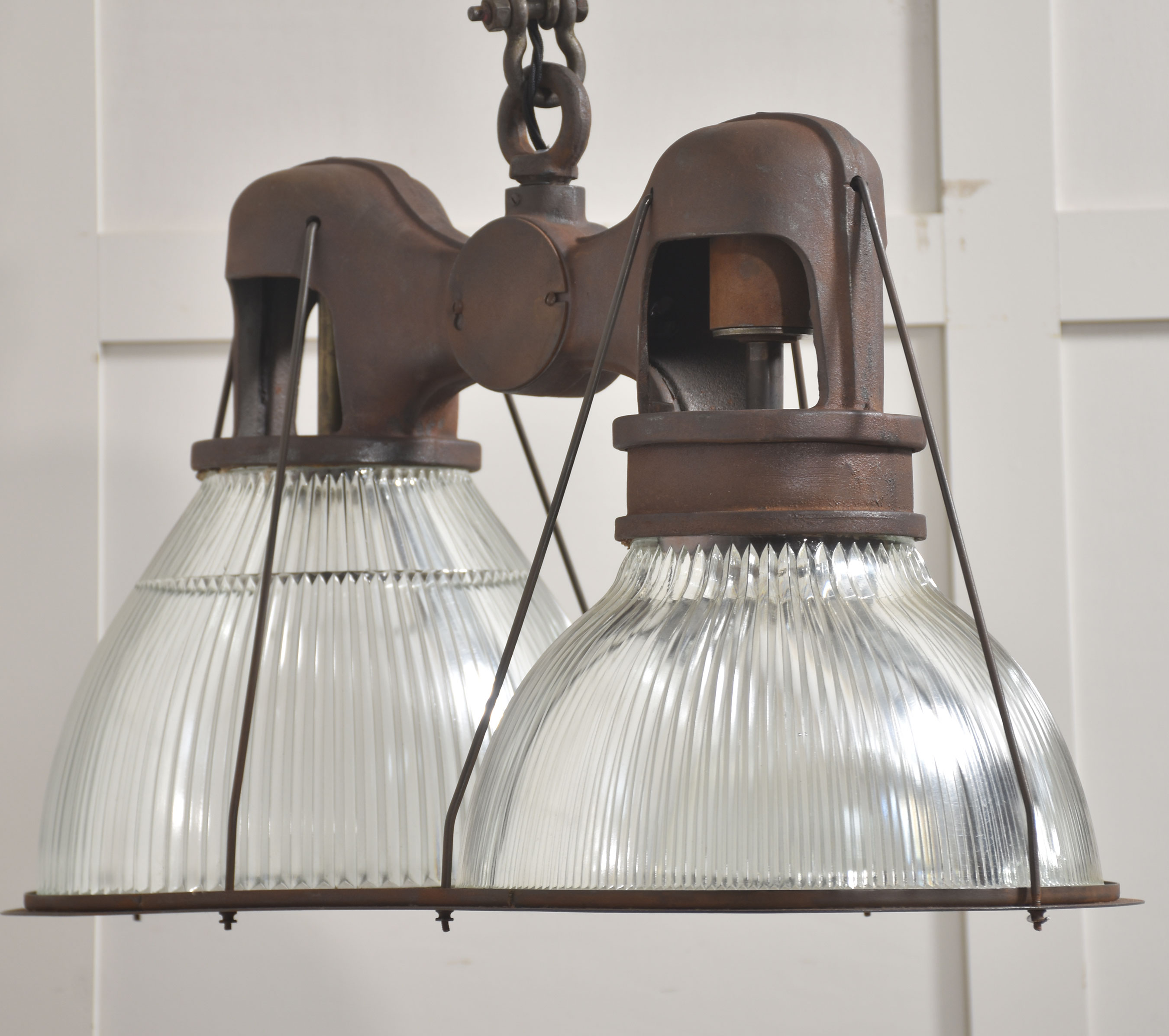 Suspended beneath each arm are large prismatic glass shades of classic Holophane type, with deep vertical ribbing designed to maximise light diffusion while maintaining brightness. The glass is clear and well-defined, offering a crisp counterpoint to the darker, weighty metalwork above.
