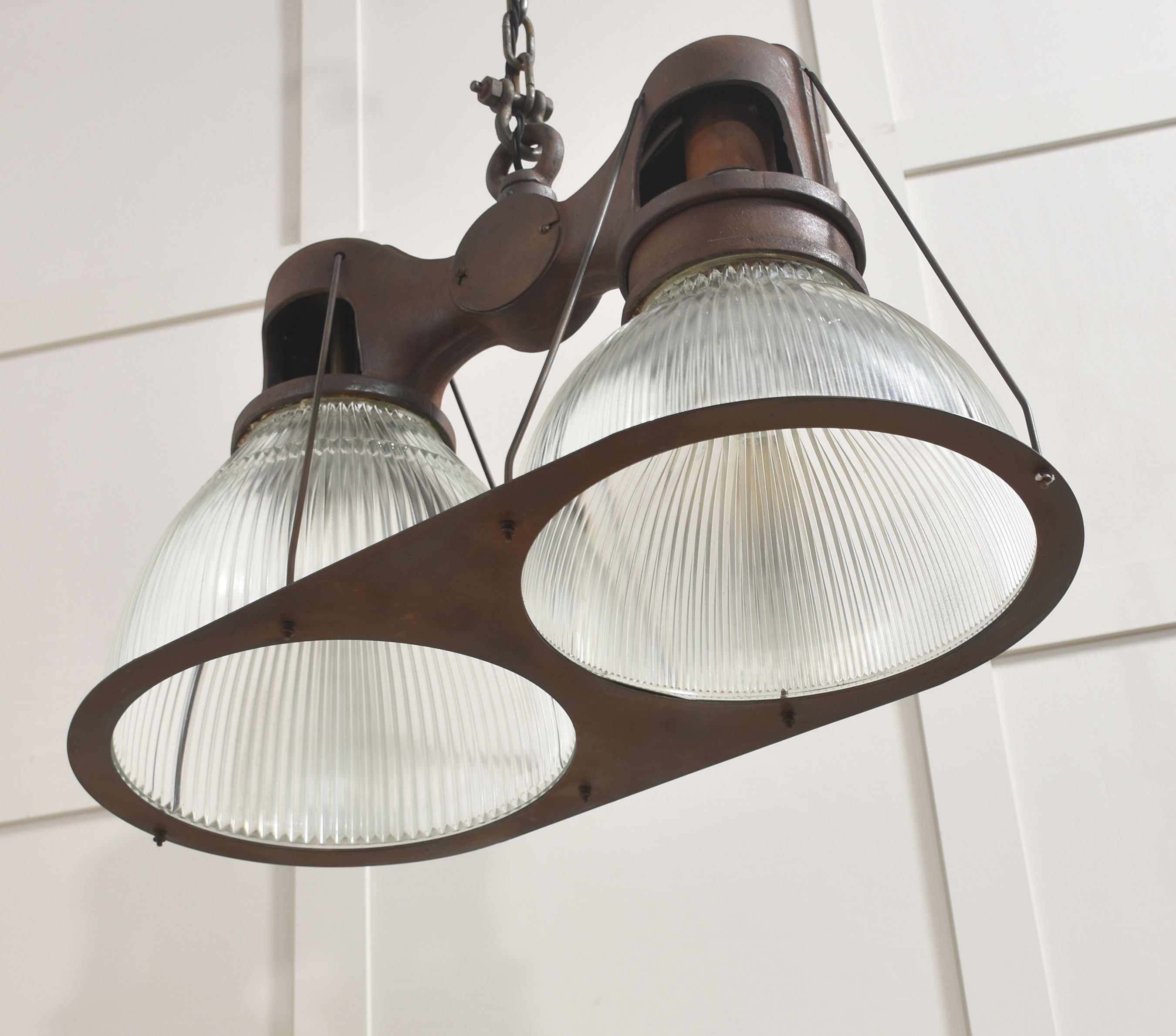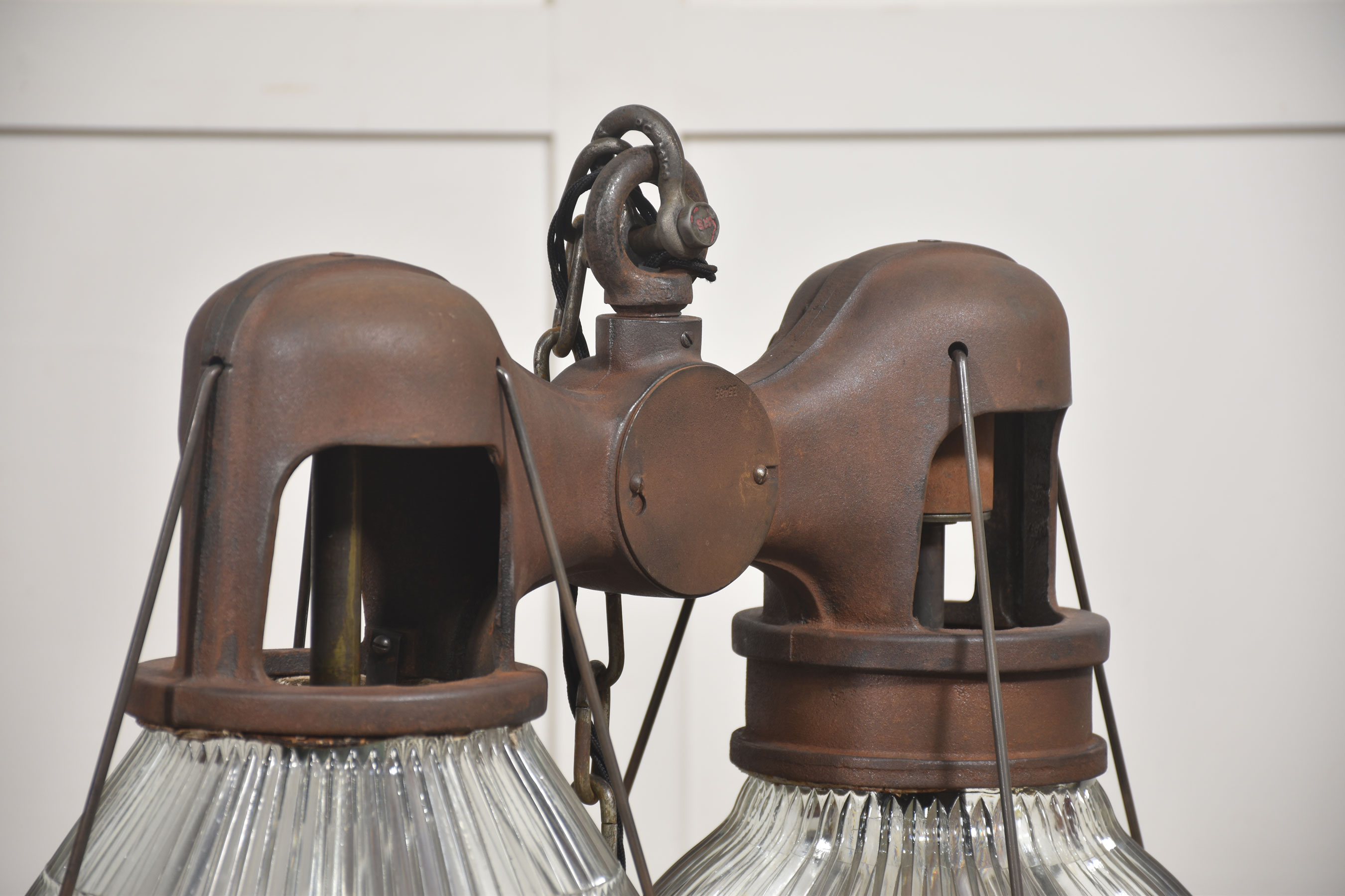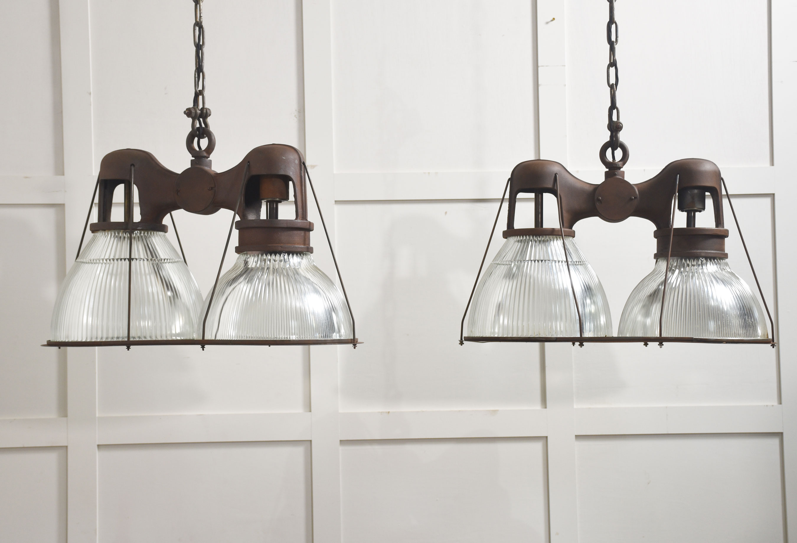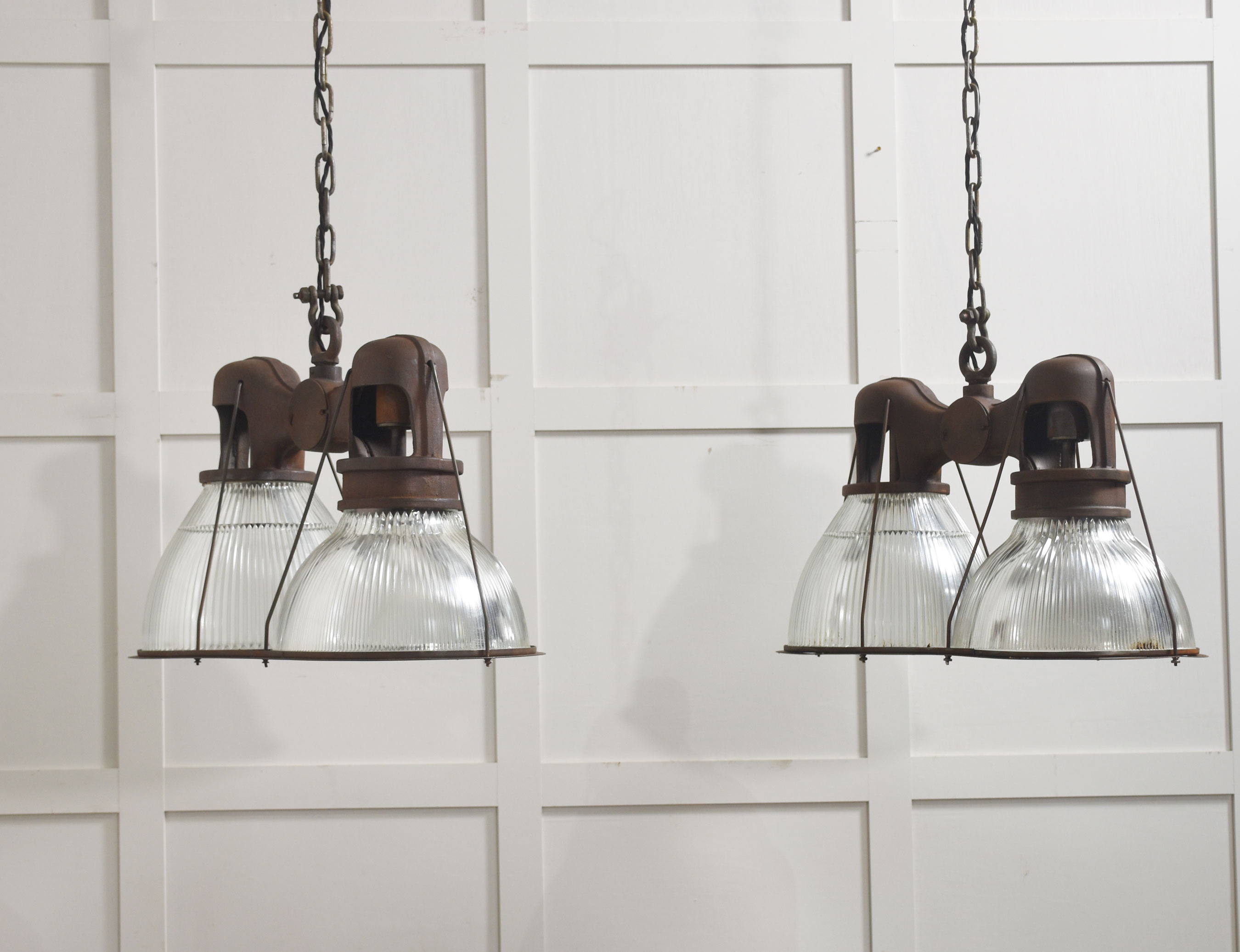 Suspended beneath each arm are large prismatic glass shades of classic Holophane type, with deep vertical ribbing designed to maximise light diffusion while maintaining brightness. The glass is clear and well-defined, offering a crisp counterpoint to the darker, weighty metalwork above.