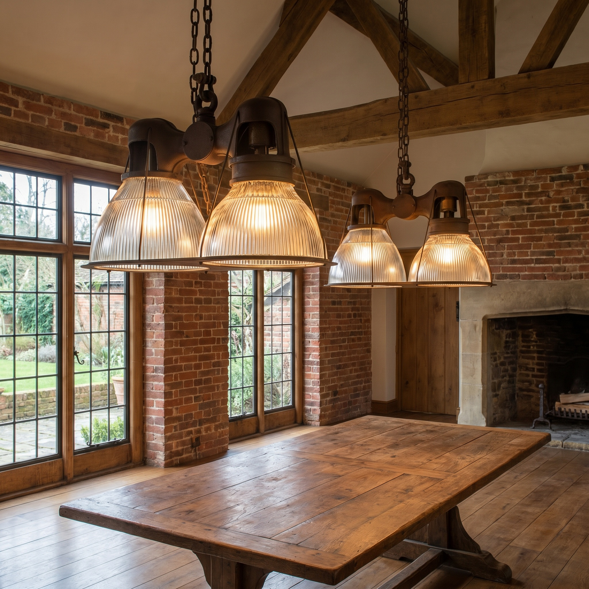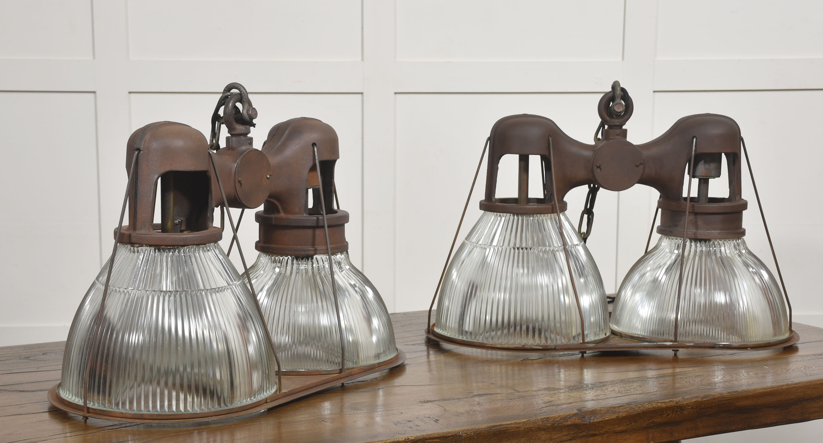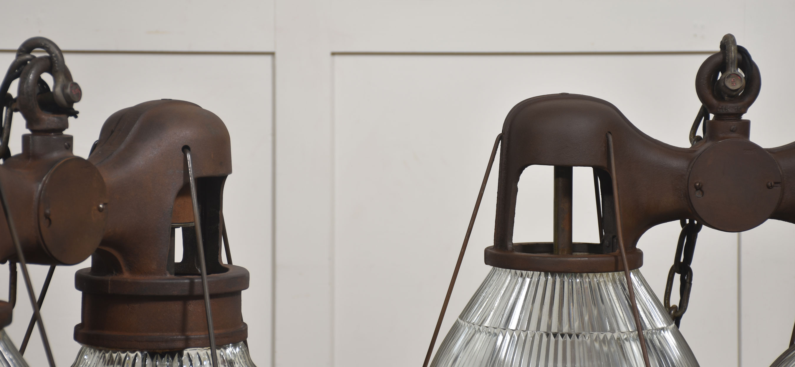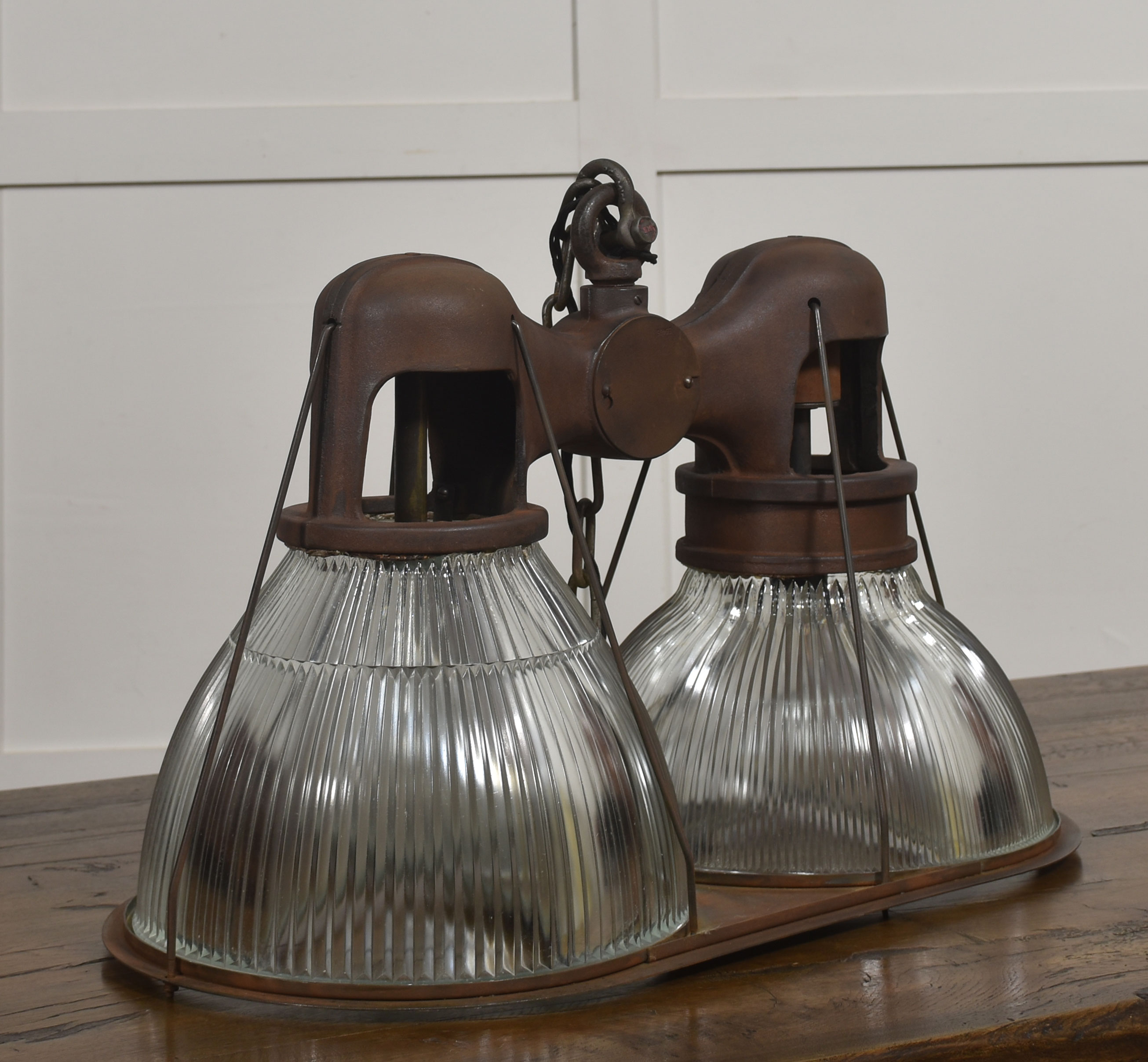 Suspended beneath each arm are large prismatic glass shades of classic Holophane type, with deep vertical ribbing designed to maximise light diffusion while maintaining brightness. The glass is clear and well-defined, offering a crisp counterpoint to the darker, weighty metalwork above.