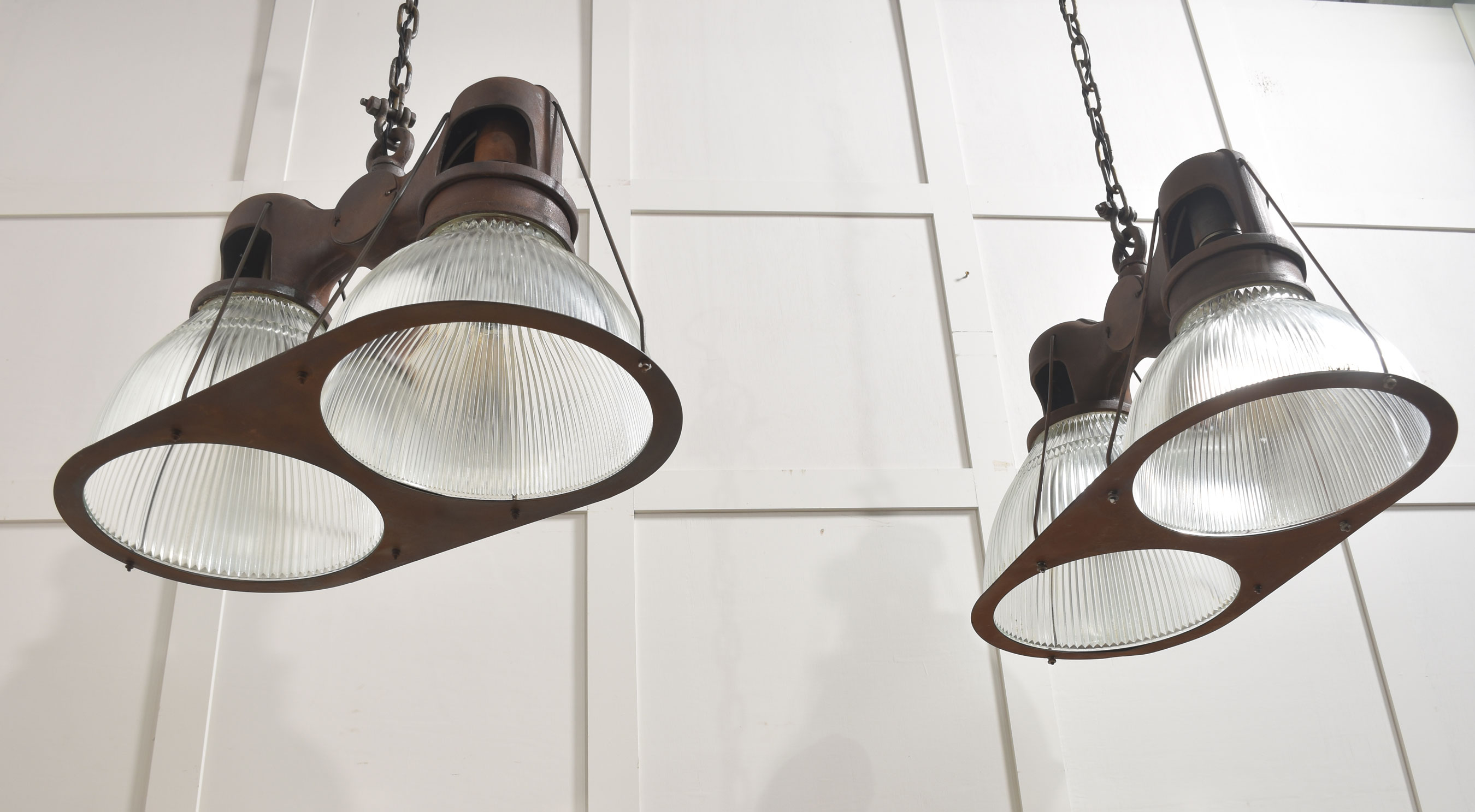Both chandeliers retain their original chain suspension, allowing for adjustable height, and feature slender support rods and a shaped gallery plate that frame the shades and emphasise the engineered, utilitarian character of the design. The overall composition is both symmetrical and highly functional, reflecting its origins in industrial or commercial lighting.