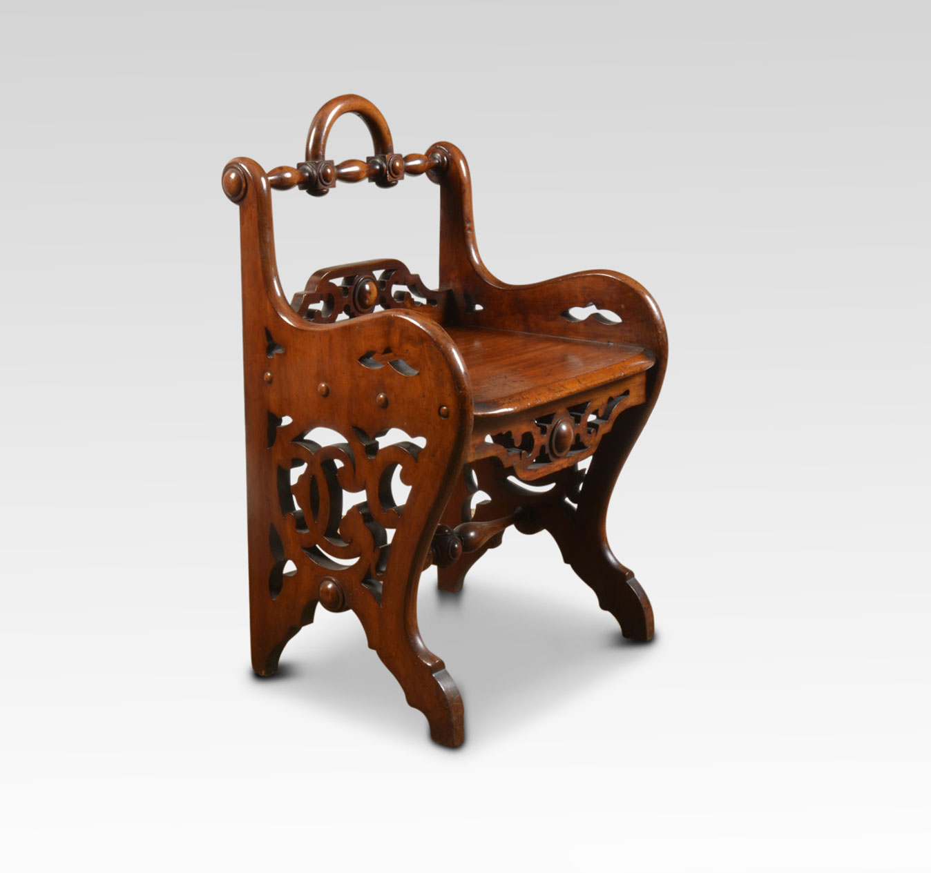 Pair of early Victorian Mahogany hall chairs in the manner of Richard Bridgens Each with an turned top rail above a pierced quatrefoil and scrolling foliated seat rail. Raided up on platform ends.