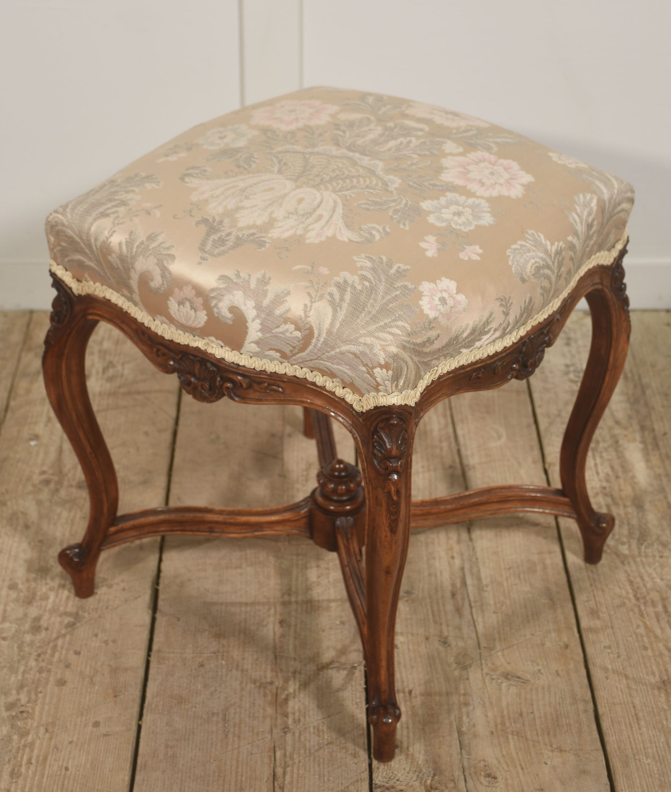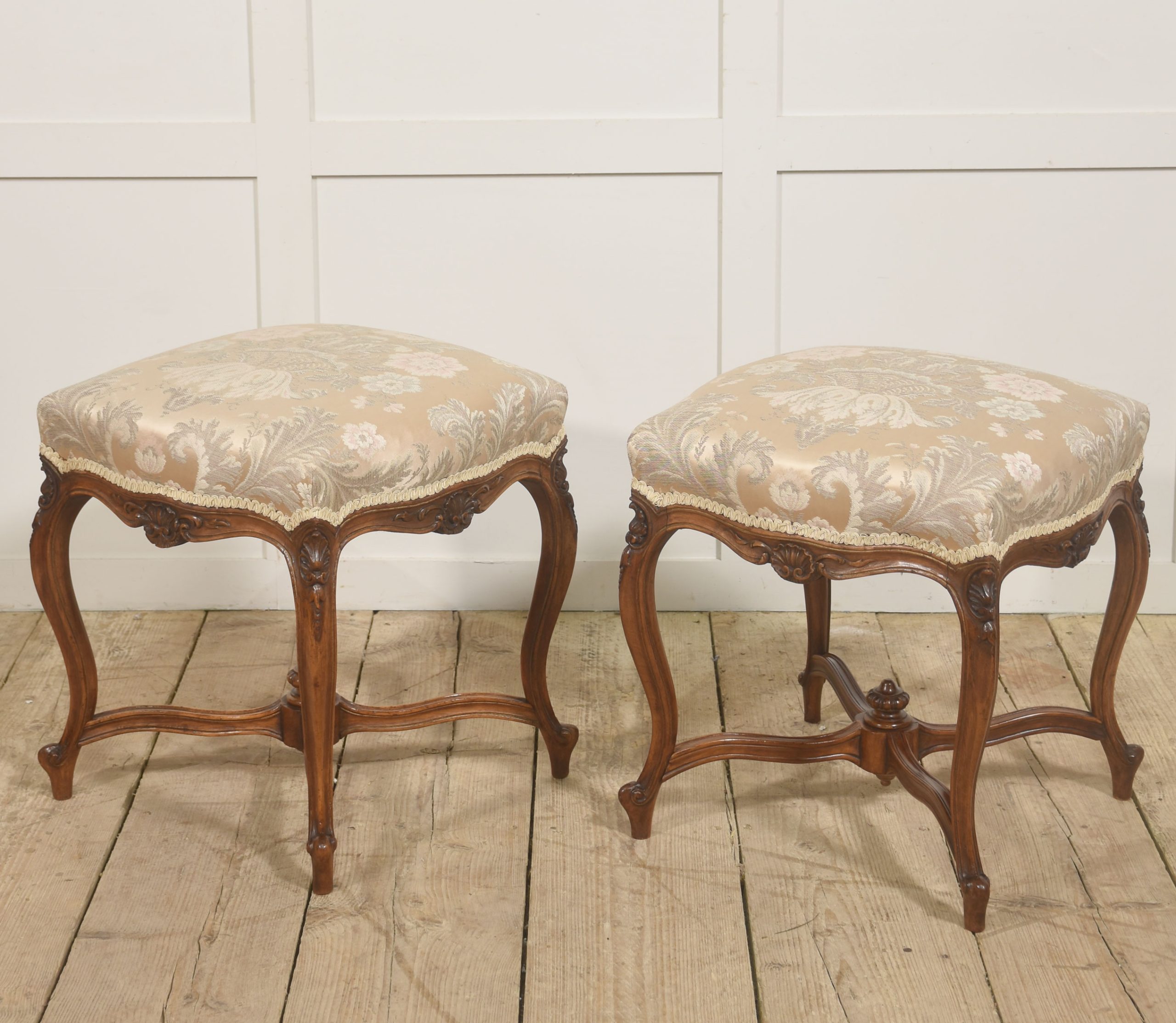 A finely crafted pair of French Louis XV–style stools, distinguished by their elegant proportions and richly carved walnut frames. Each example features a shaped seat rail adorned with scrolling acanthus foliage and shell motifs, executed in a restrained Rococo manner that reflects 18th-century French design principles.