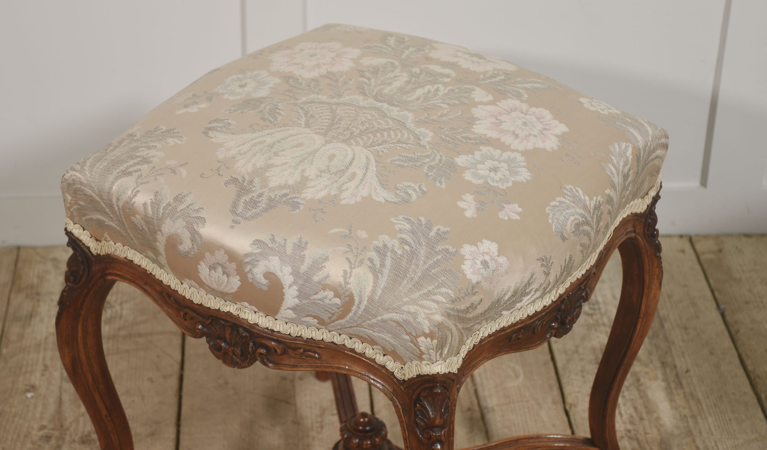 The seats are generously padded and upholstered in a champagne-ground damask fabric, decorated with flowing foliate and floral patterns in muted sage, ivory, and blush tones. A braided trim neatly borders the seat edge, offering a clean, tailored finish.
