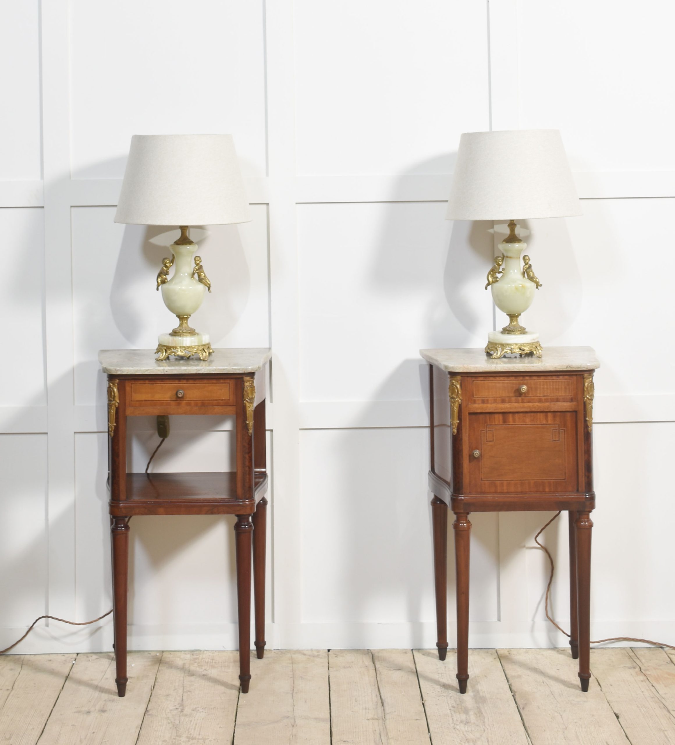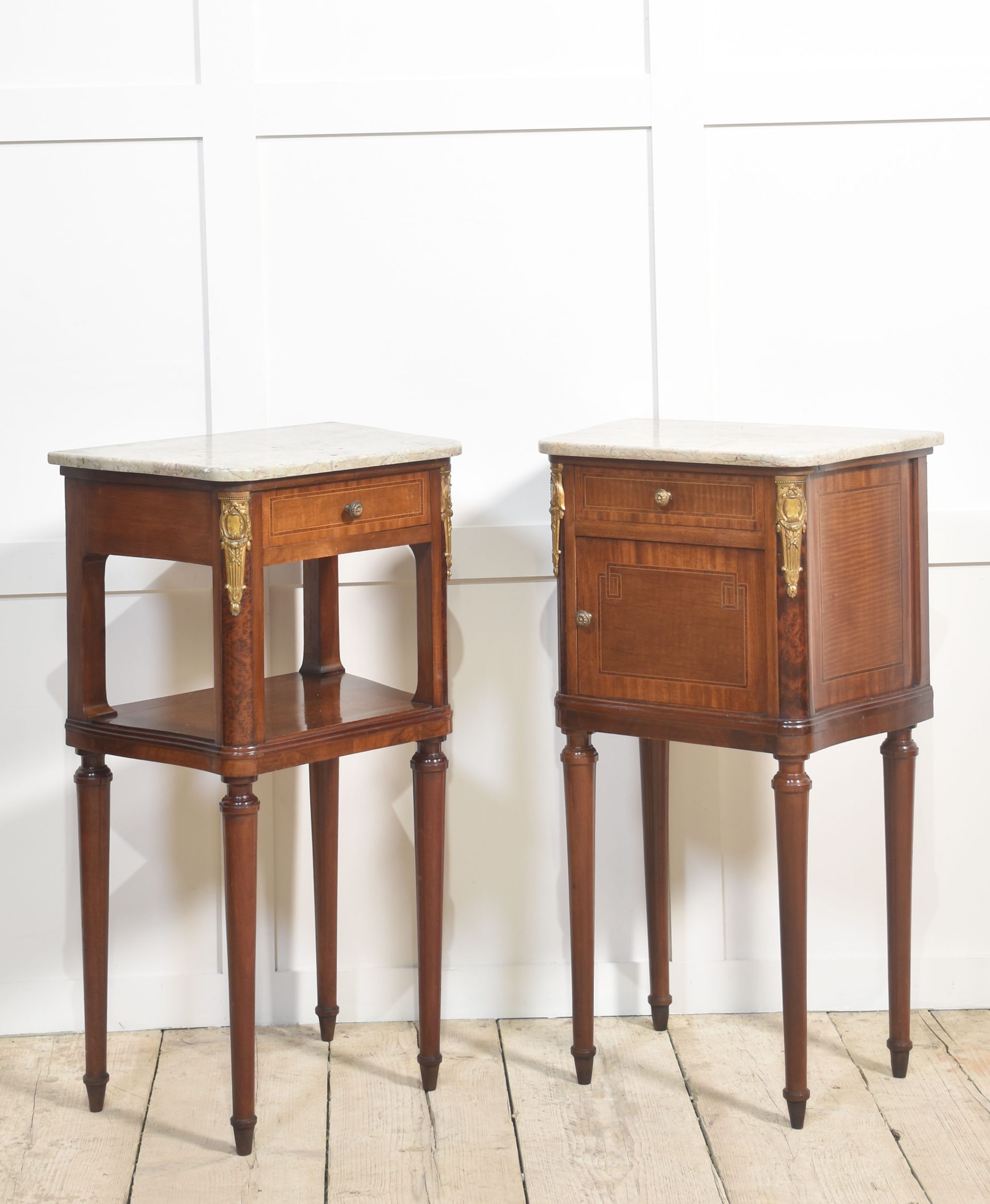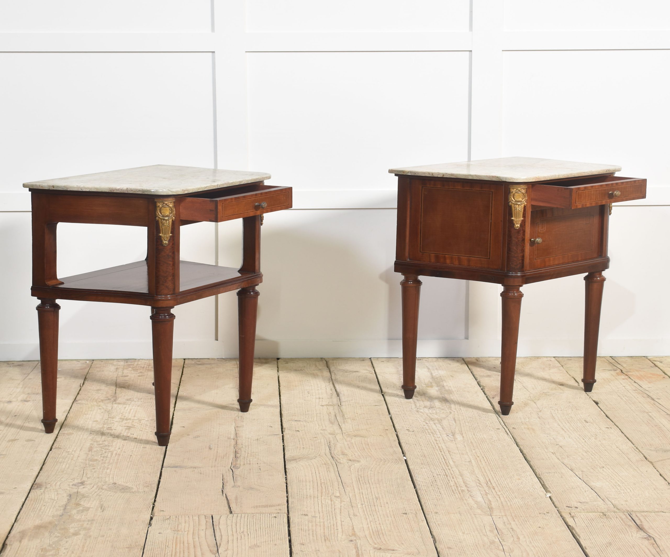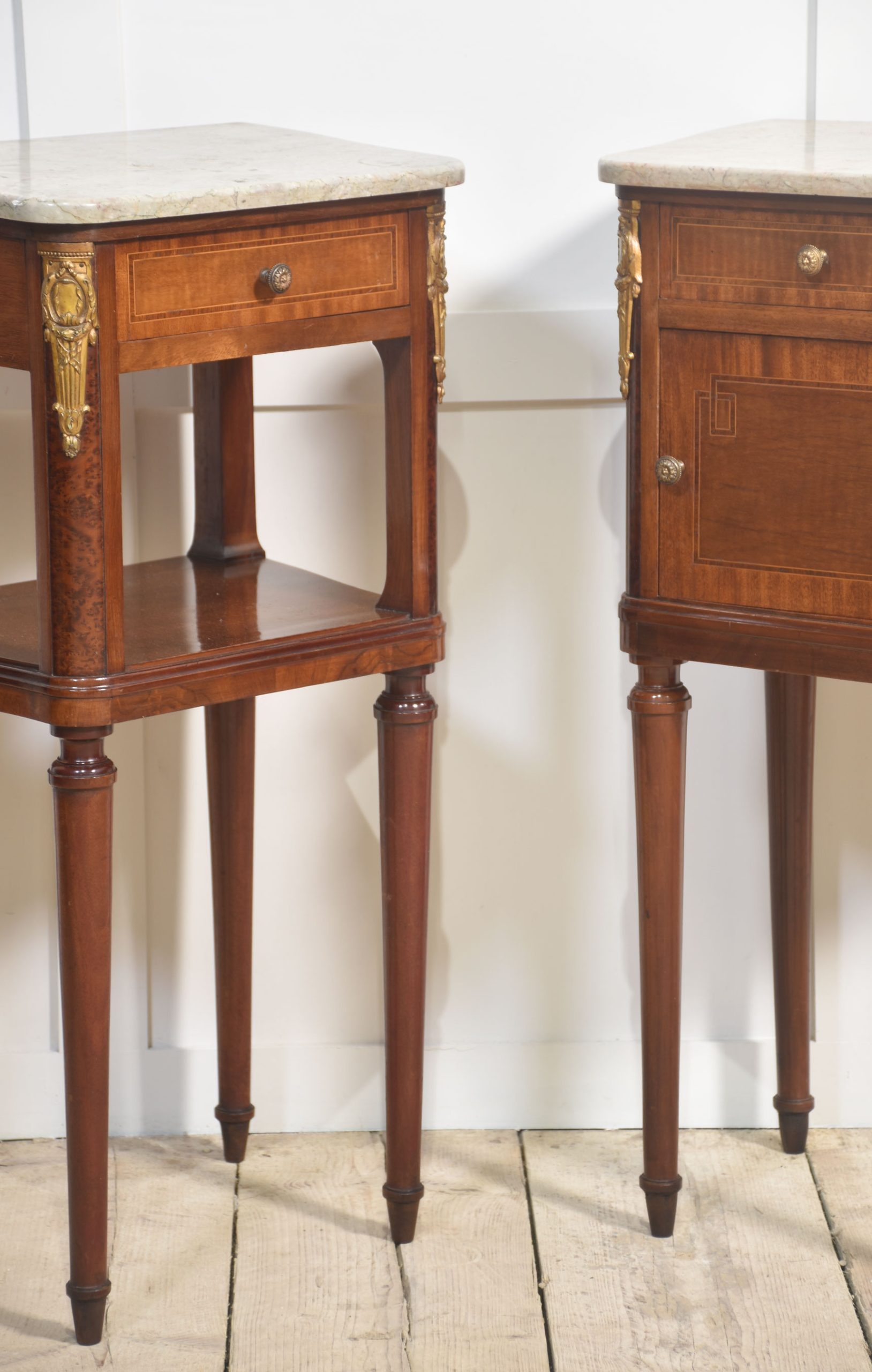 Pair of French Neoclassical gilt metal mounted bedside cabinets with shaped marble tops, above short drawer one fitted with cupboard door the other having an open shelf. All raised up on turned tapering legs.