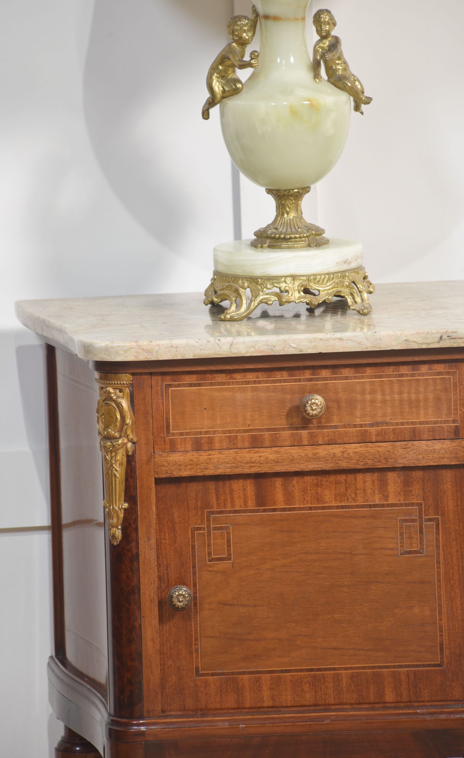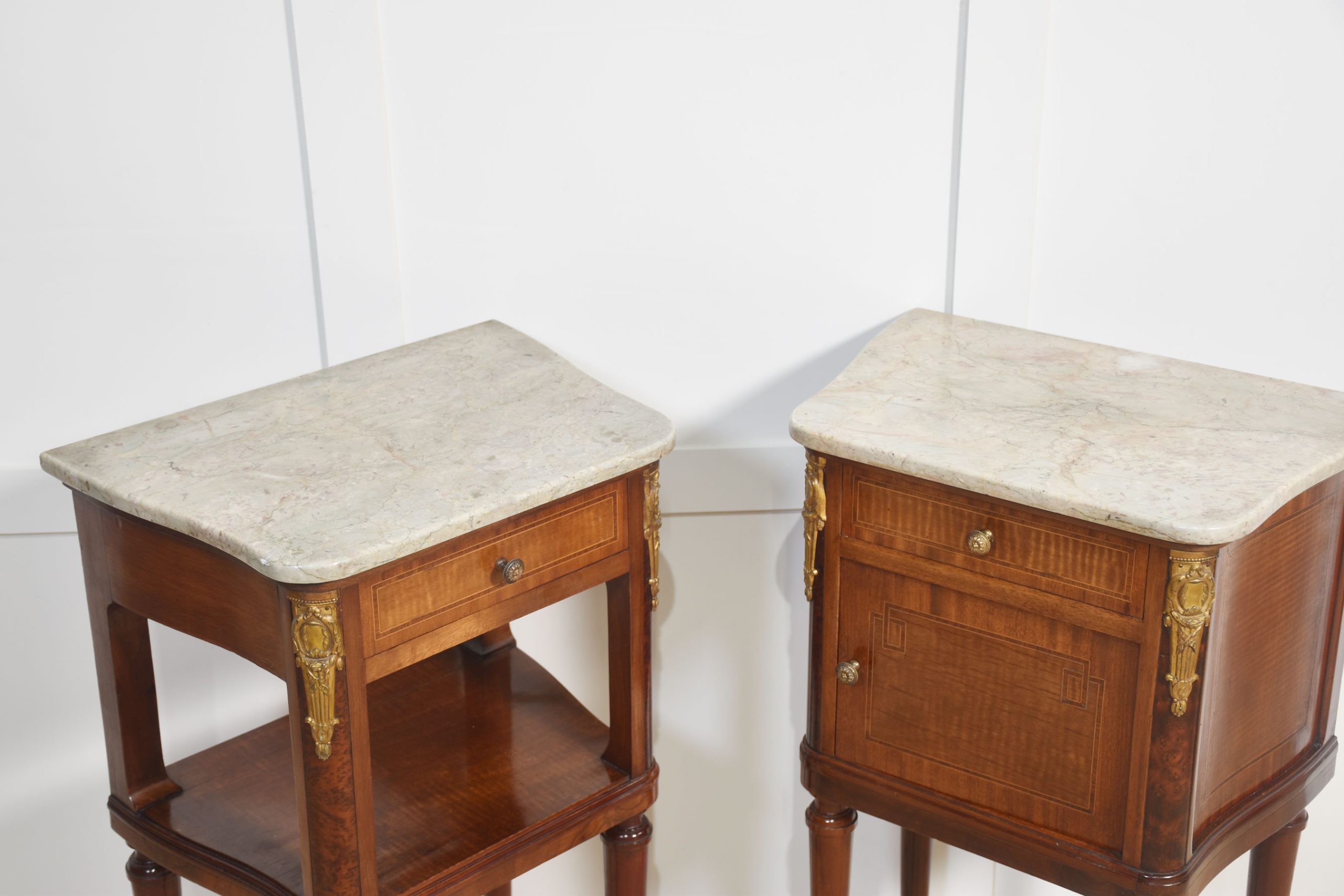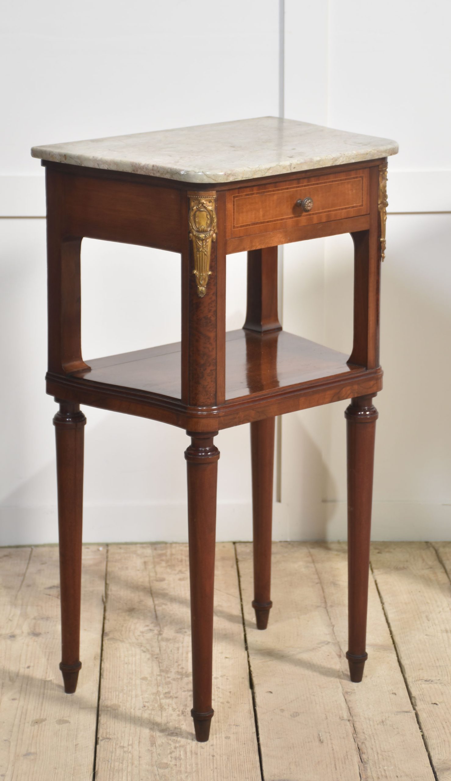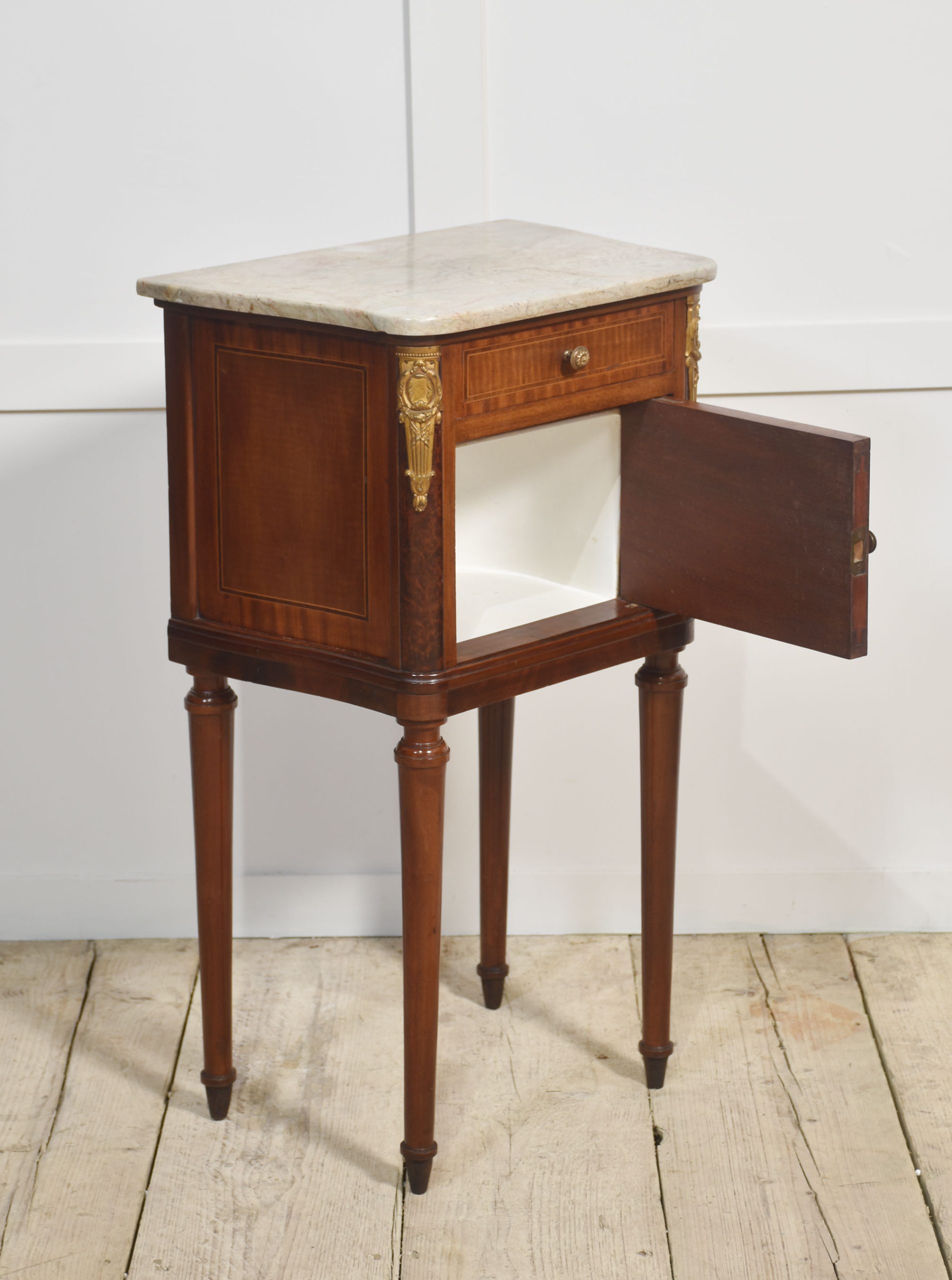 Pair of French Neoclassical gilt metal mounted bedside cabinets with shaped marble tops, above short drawer one fitted with cupboard door the other having an open shelf. All raised up on turned tapering legs.