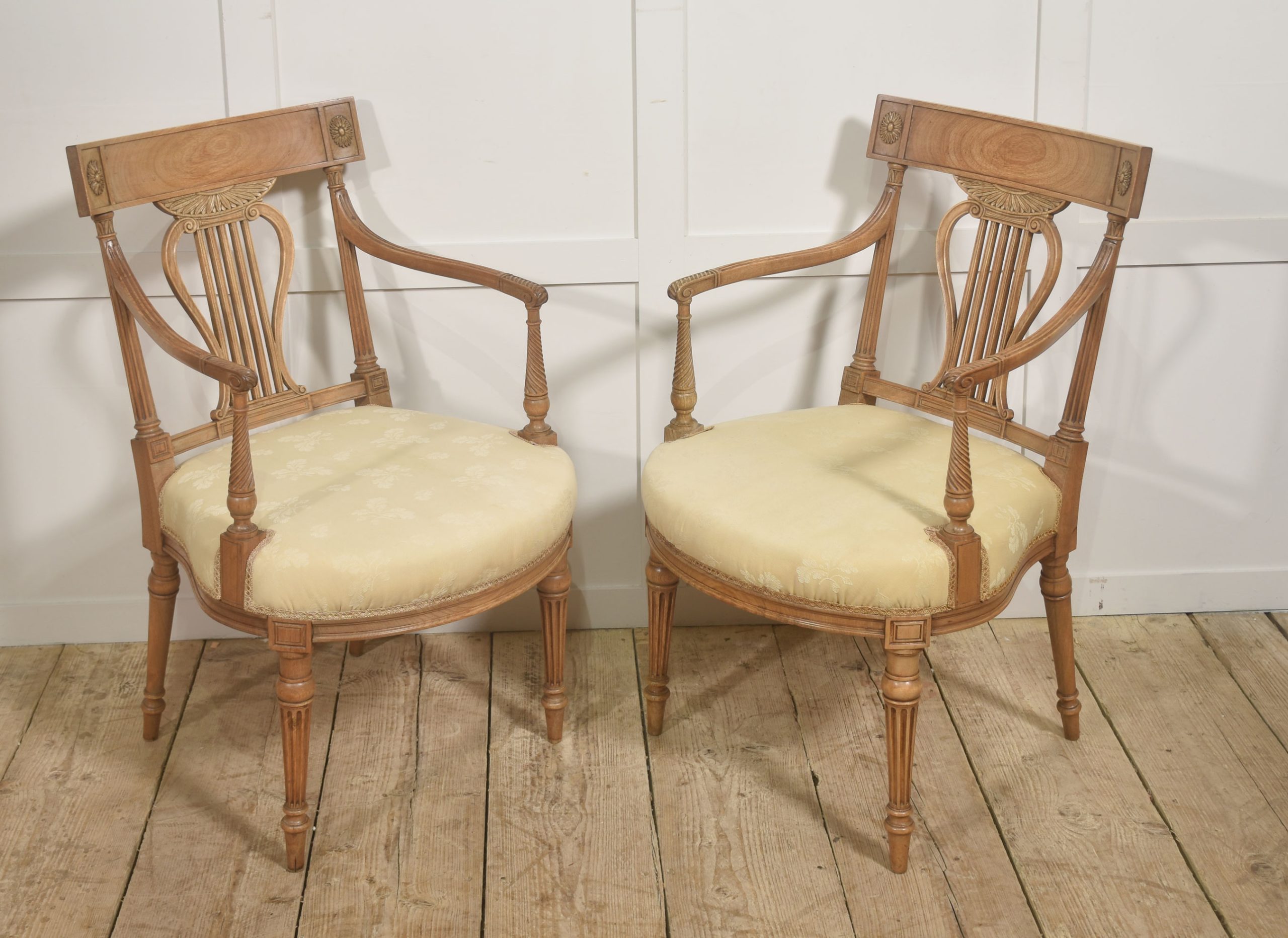 A refined pair of mahogany armchairs executed in the neoclassical taste, distinguished by elegant lyre-form backs and finely carved classical ornament. The rectangular crest rails display attractive figured mahogany panels framed by small carved rosettes, above a radiating fan motif that crowns the lyre splat composed of slender vertical reeds.