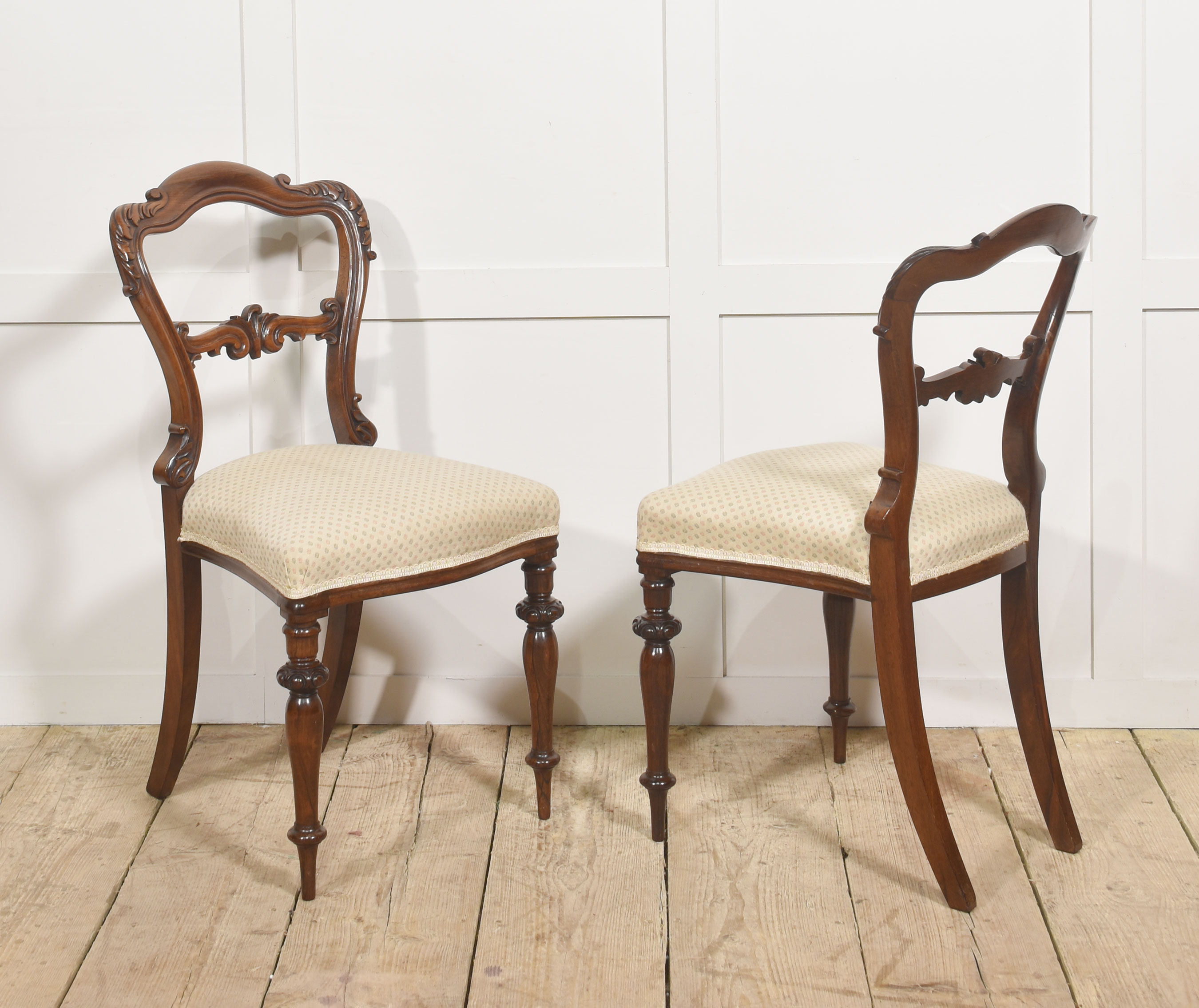 A pair of finely carved mid-19th century rosewood side chairs in the Victorian taste, each with a shaped and moulded balloon back centred by a pierced and scrolling horizontal splat. The cresting rails are richly carved with acanthus and foliate ornament, flowing into elegantly curved uprights that create a refined, serpentine outline.